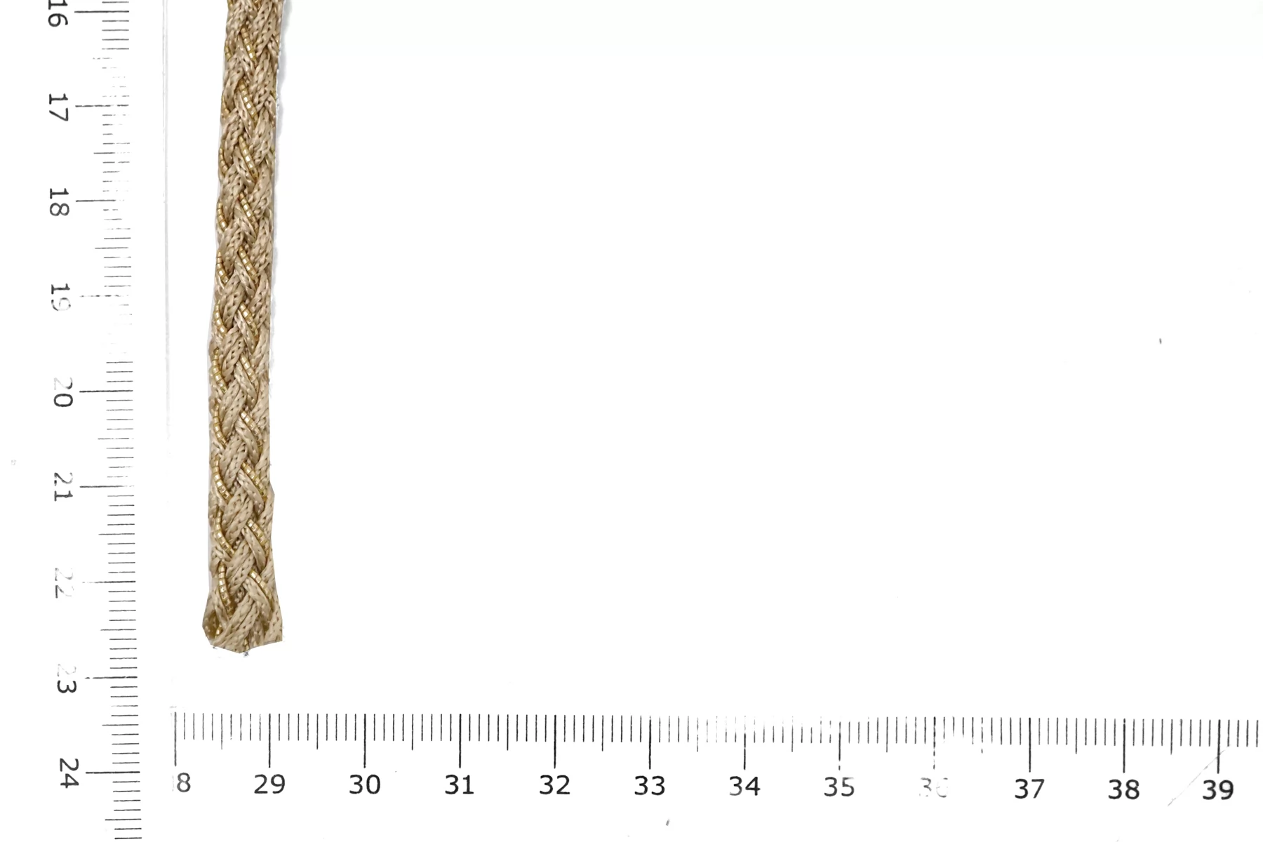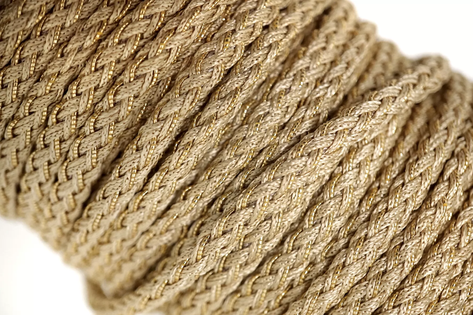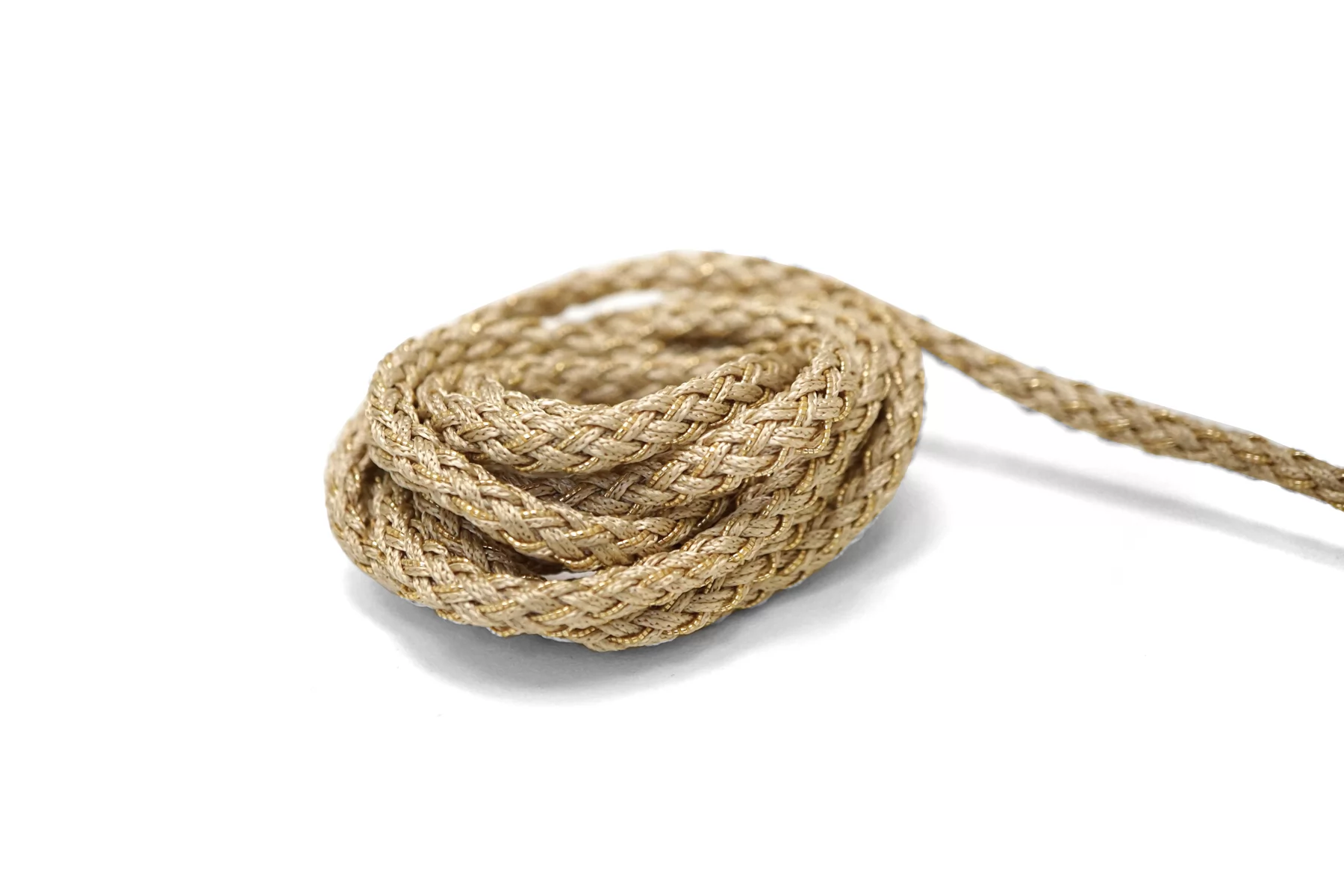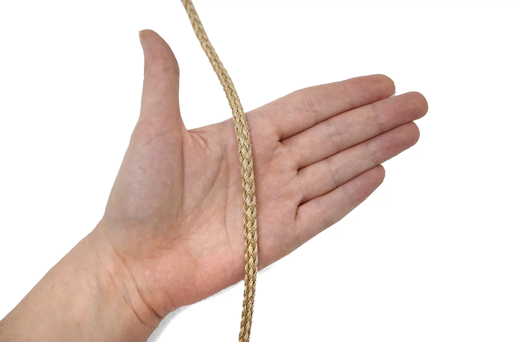 Плетёный шнур, сочетание бежевого цвета и золотистого люрекса. Форма круглая. Ширина около 5 мм.