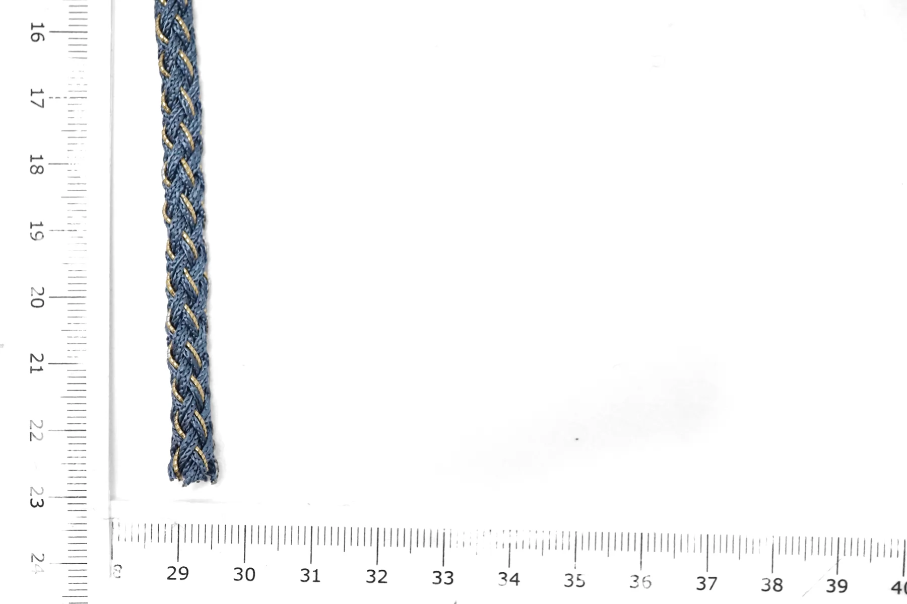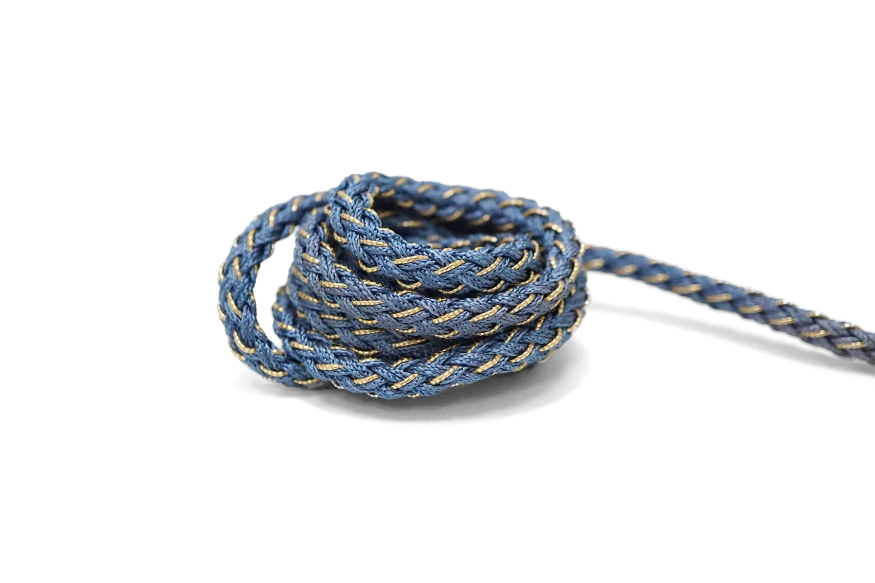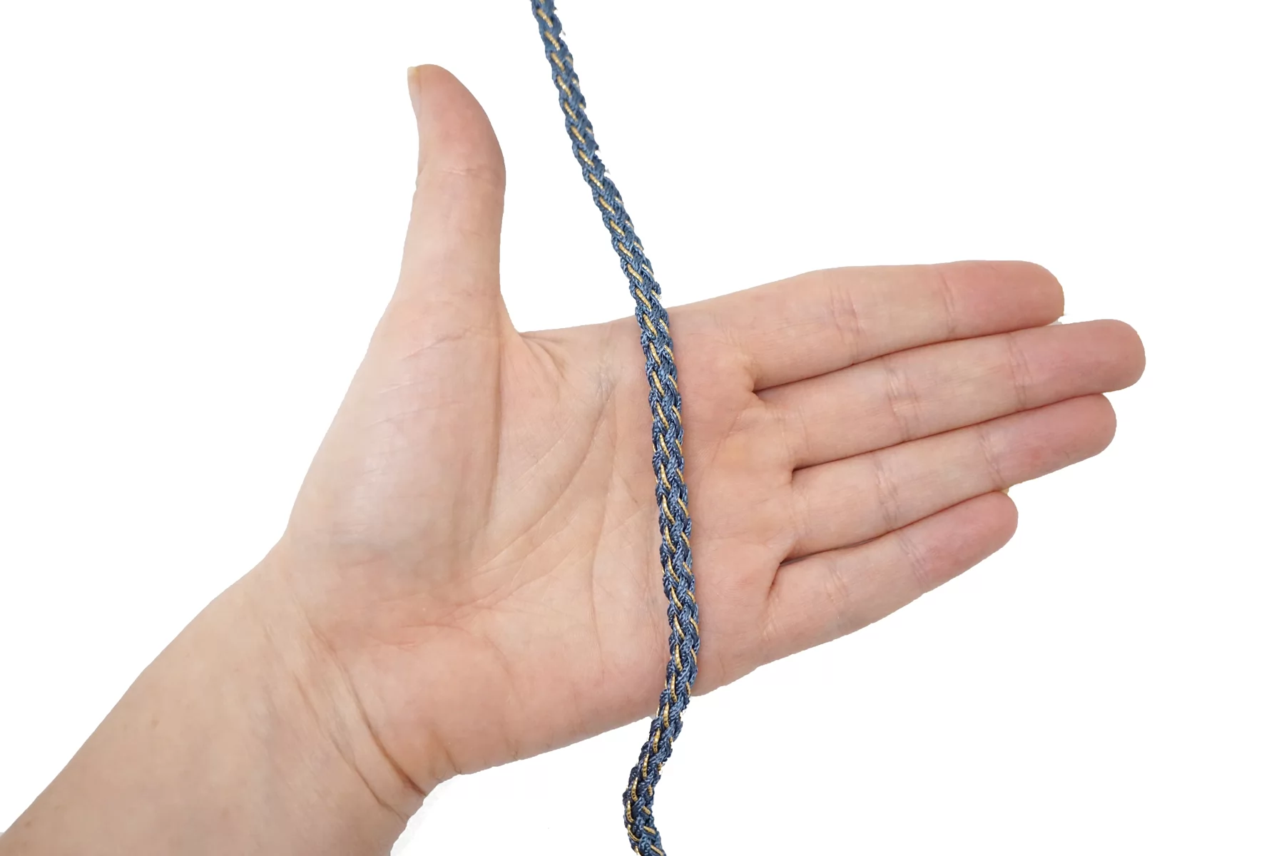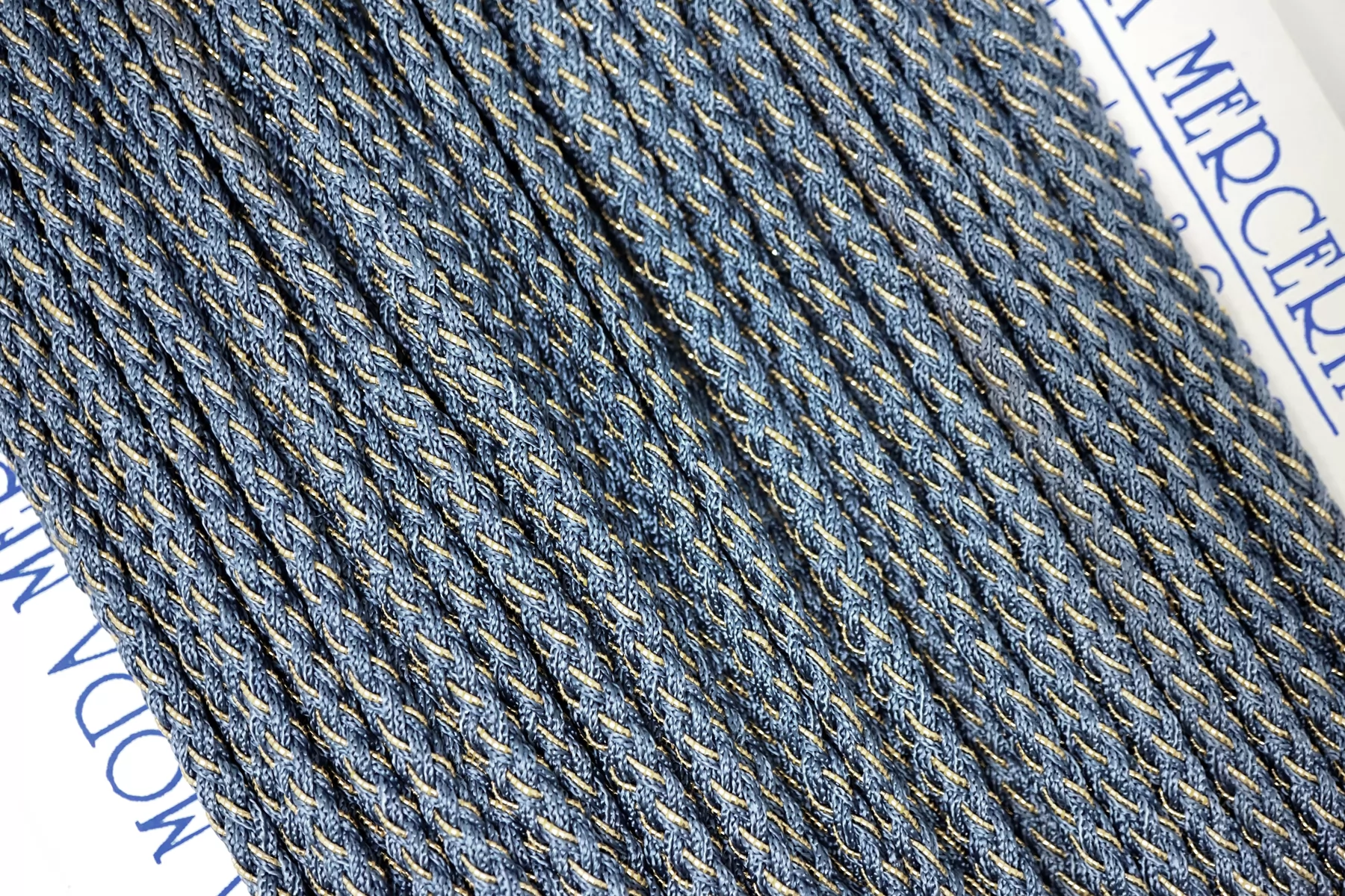 Плетёный шнур, сочетание дымчато-голубого цвета и золотистого люрекса. Форма круглая. Ширина около 5 мм.