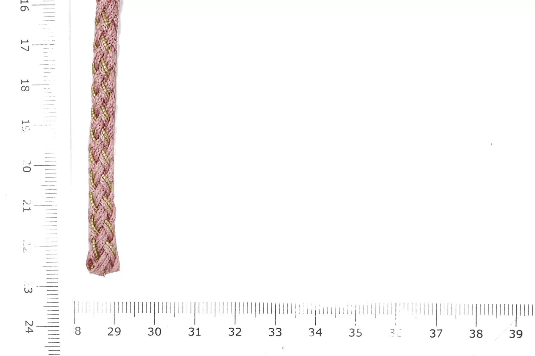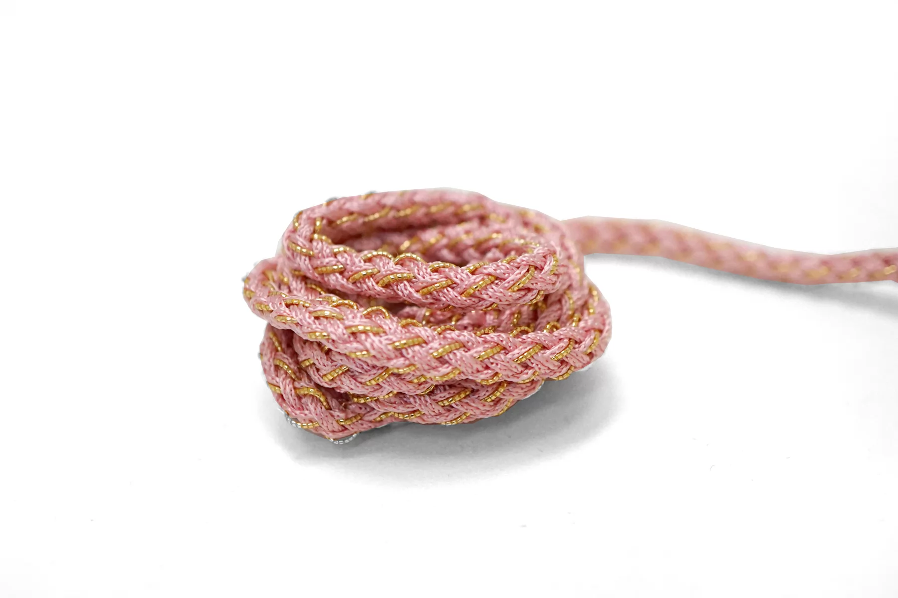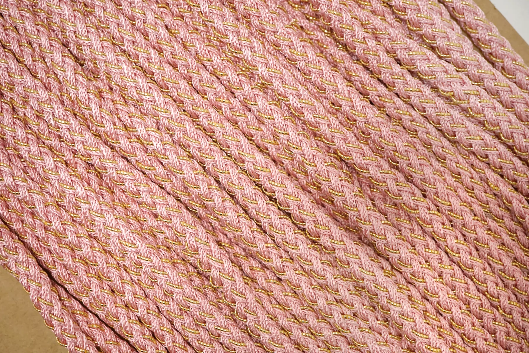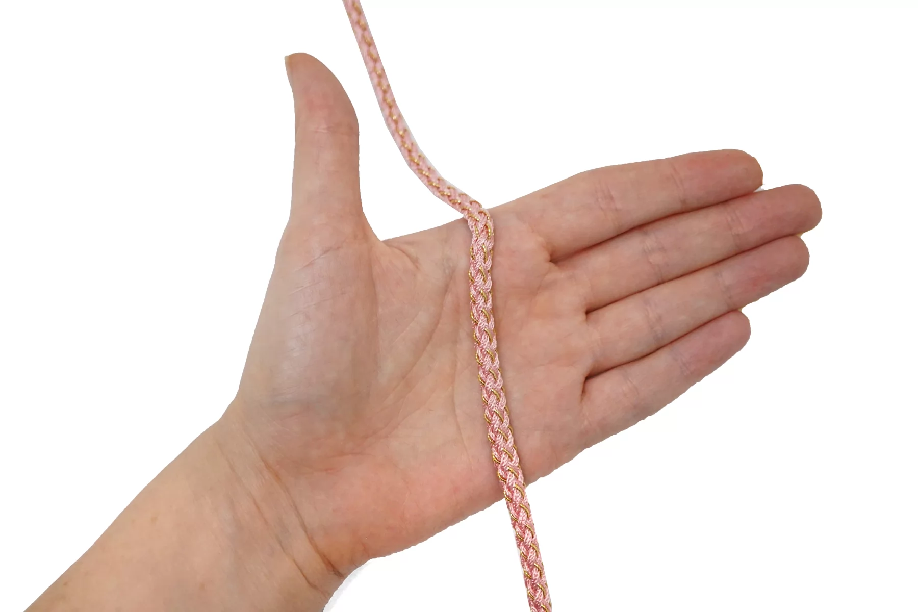 Плетёный шнур, сочетание розового цвета и золотистого люрекса. Форма круглая. Ширина около 5 мм.