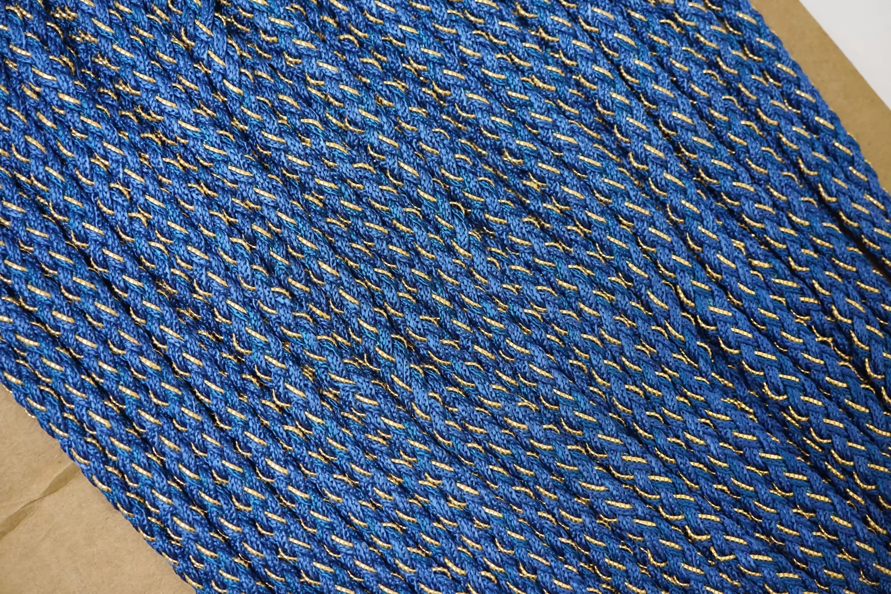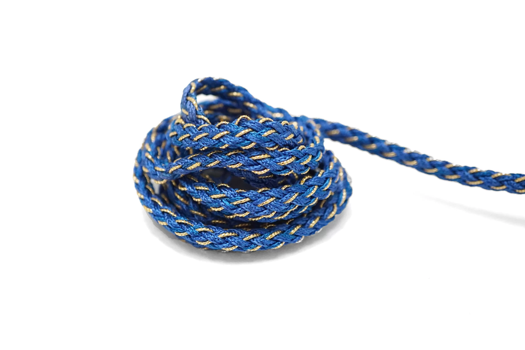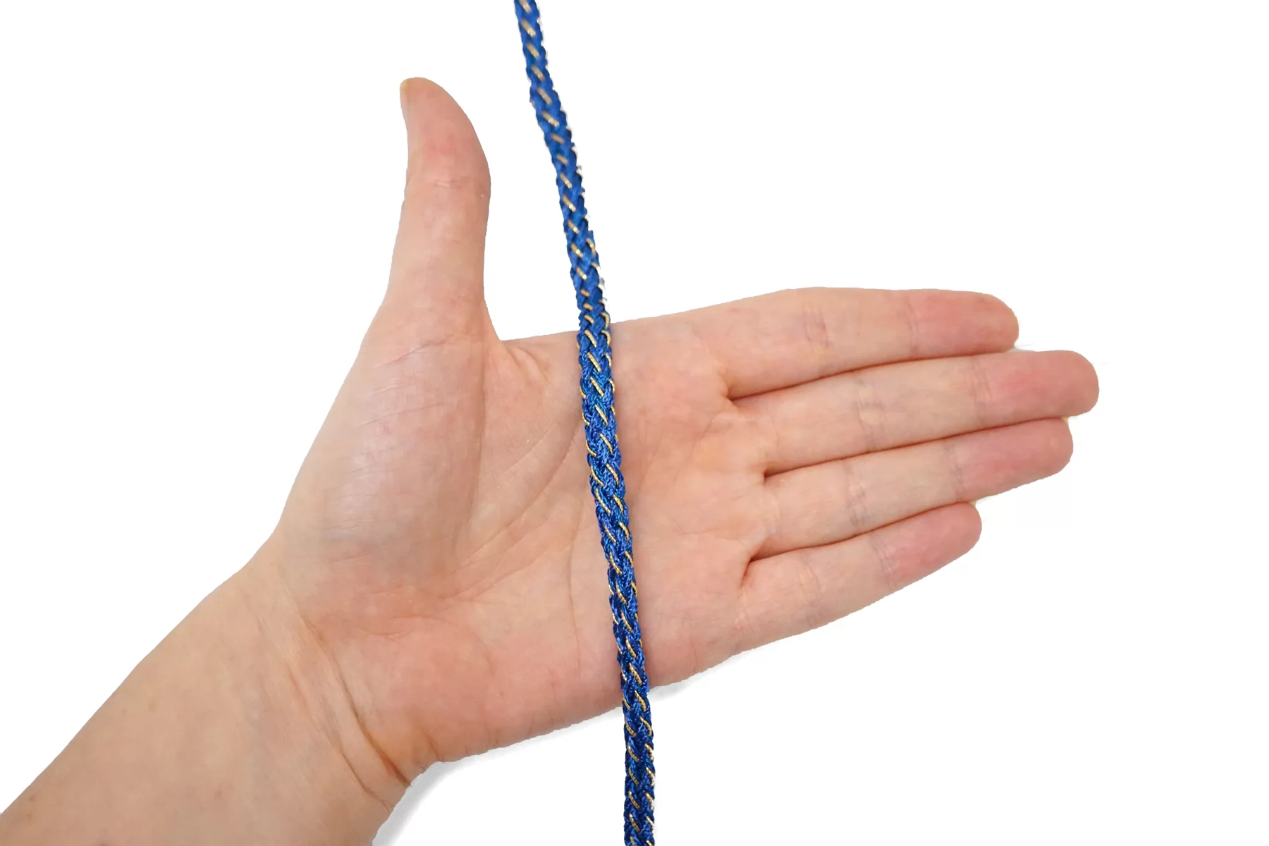 Плетёный шнур, сочетание синего цвета и золотистого люрекса. Форма круглая. Ширина около 5 мм.