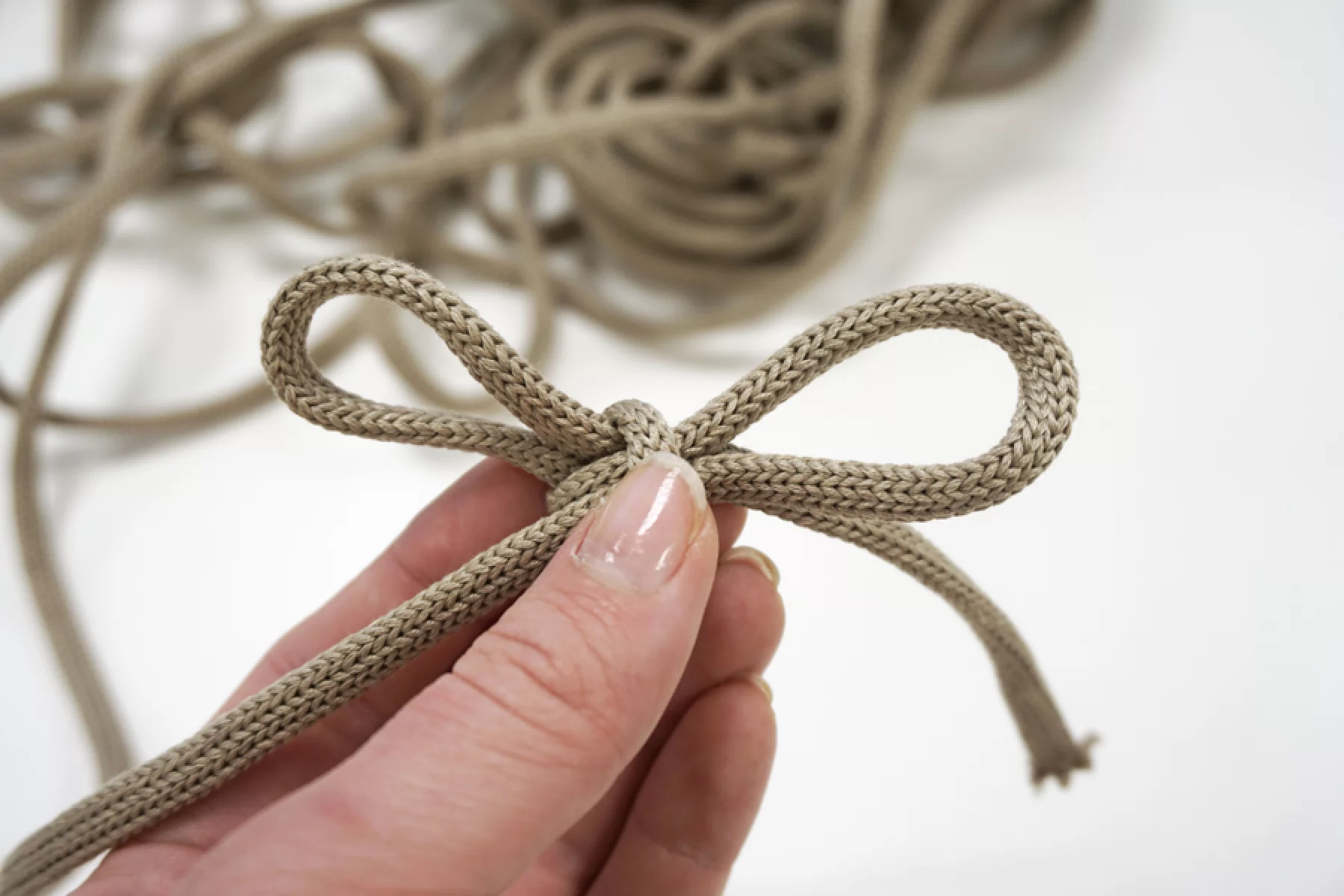 Хлопковый шнур светлого серо-бежевого цвета. Форма овальная. Ширина около 7 мм.