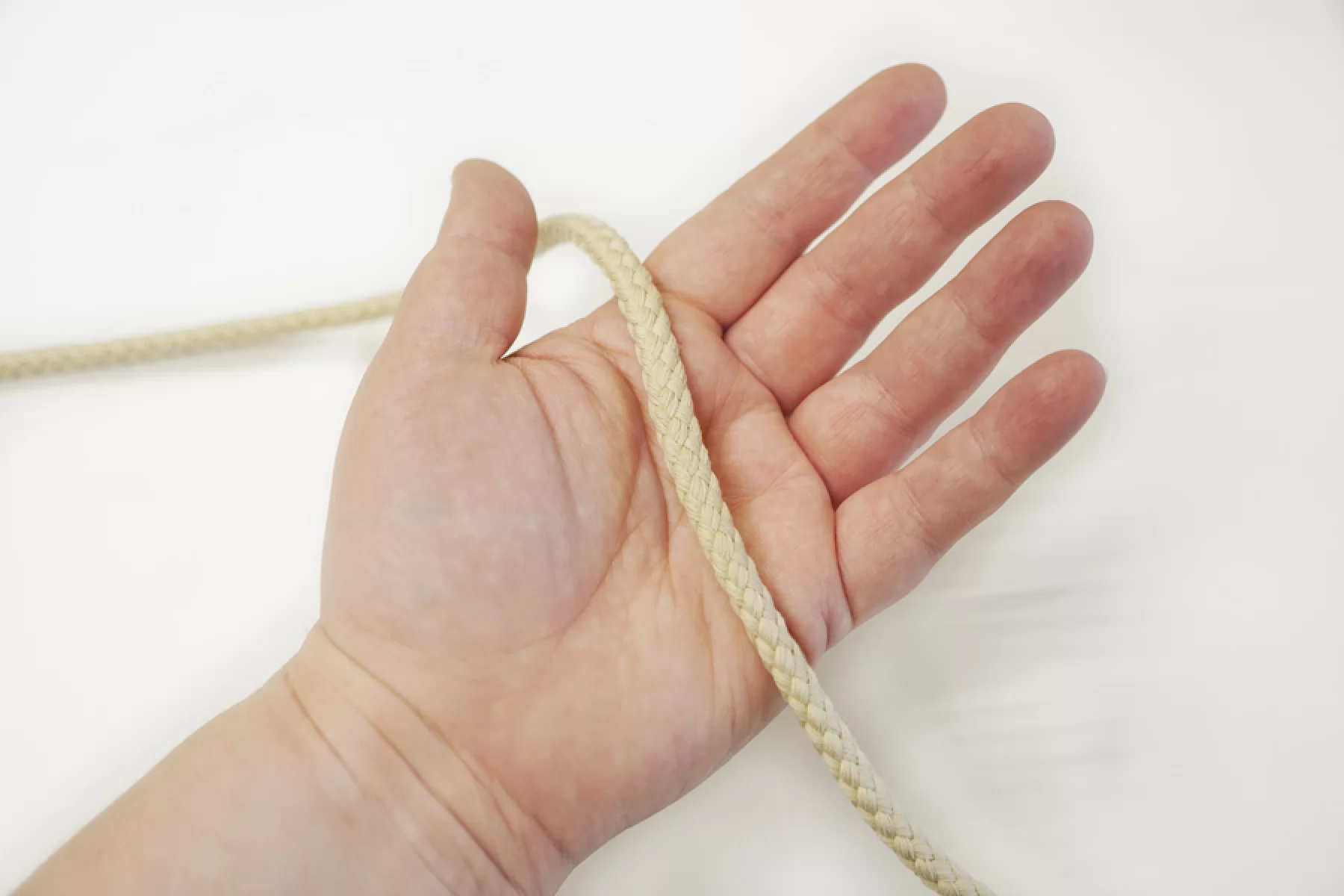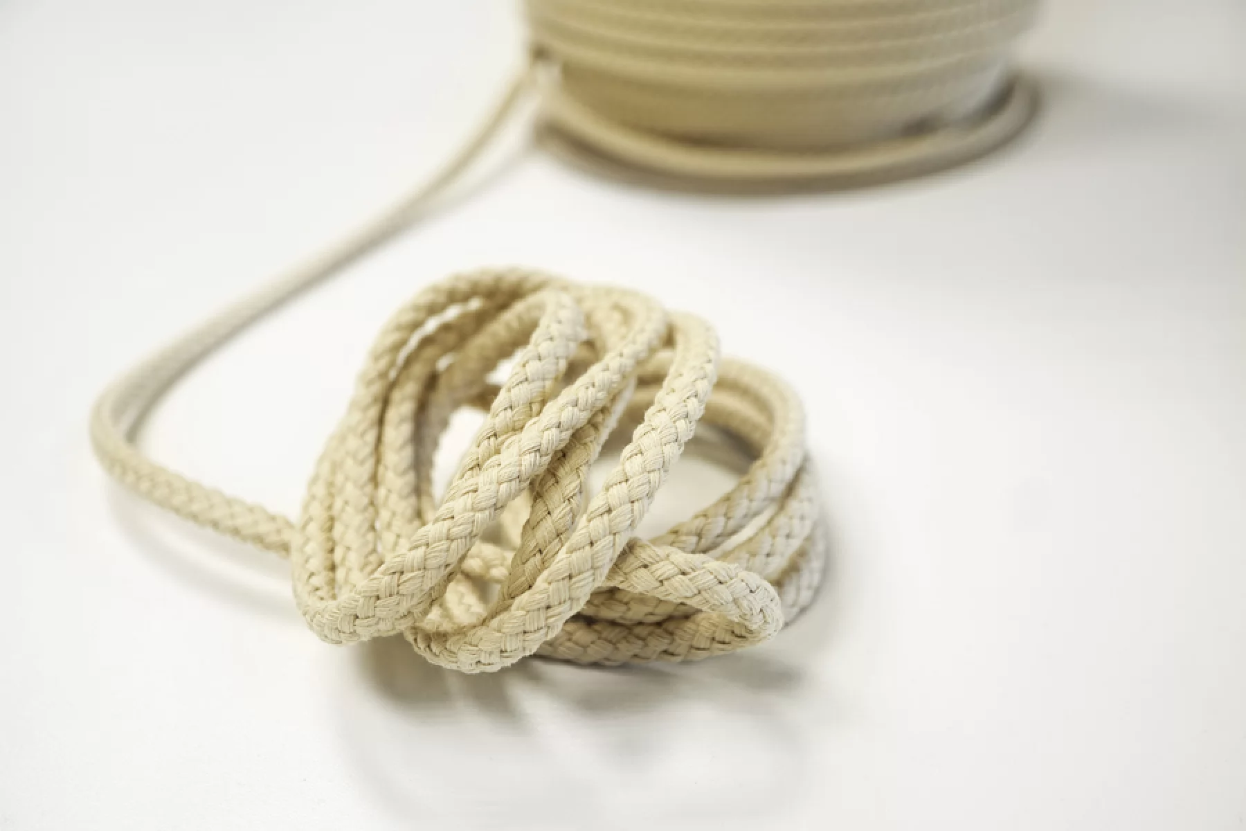 Хлопковый шнур ванильного цвета. Форма круглая. Ширина около 8 мм.