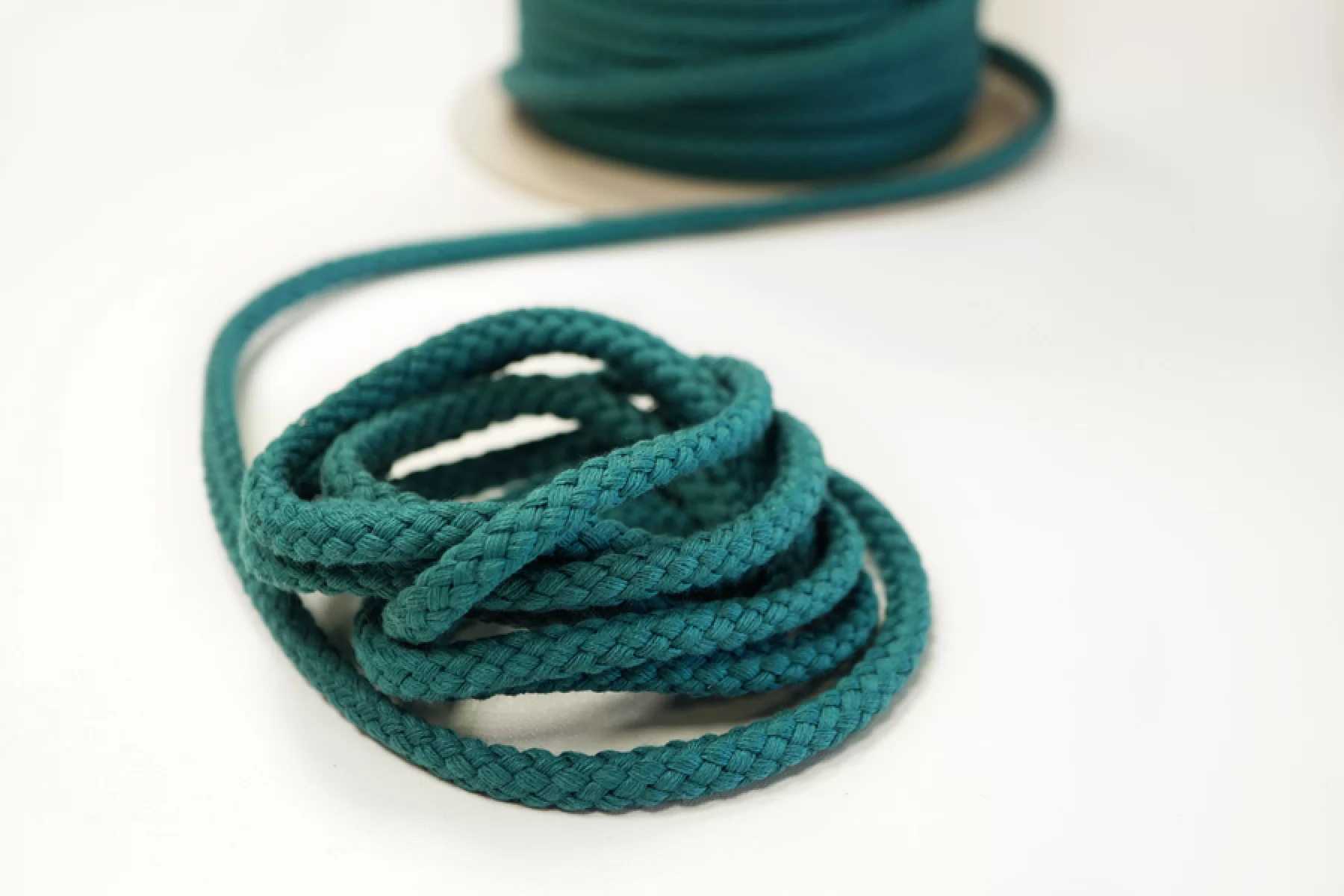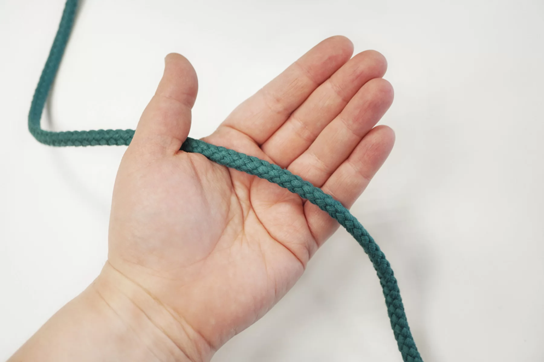 Хлопковый шнур зеленого цвета. Форма круглая. Ширина около 8 мм.