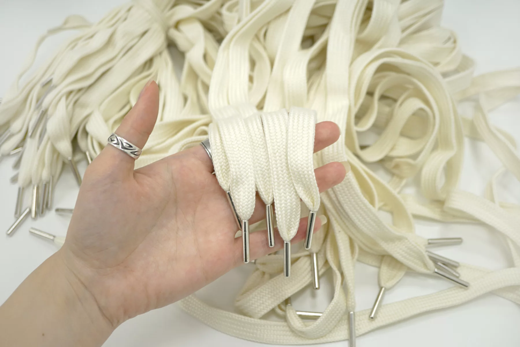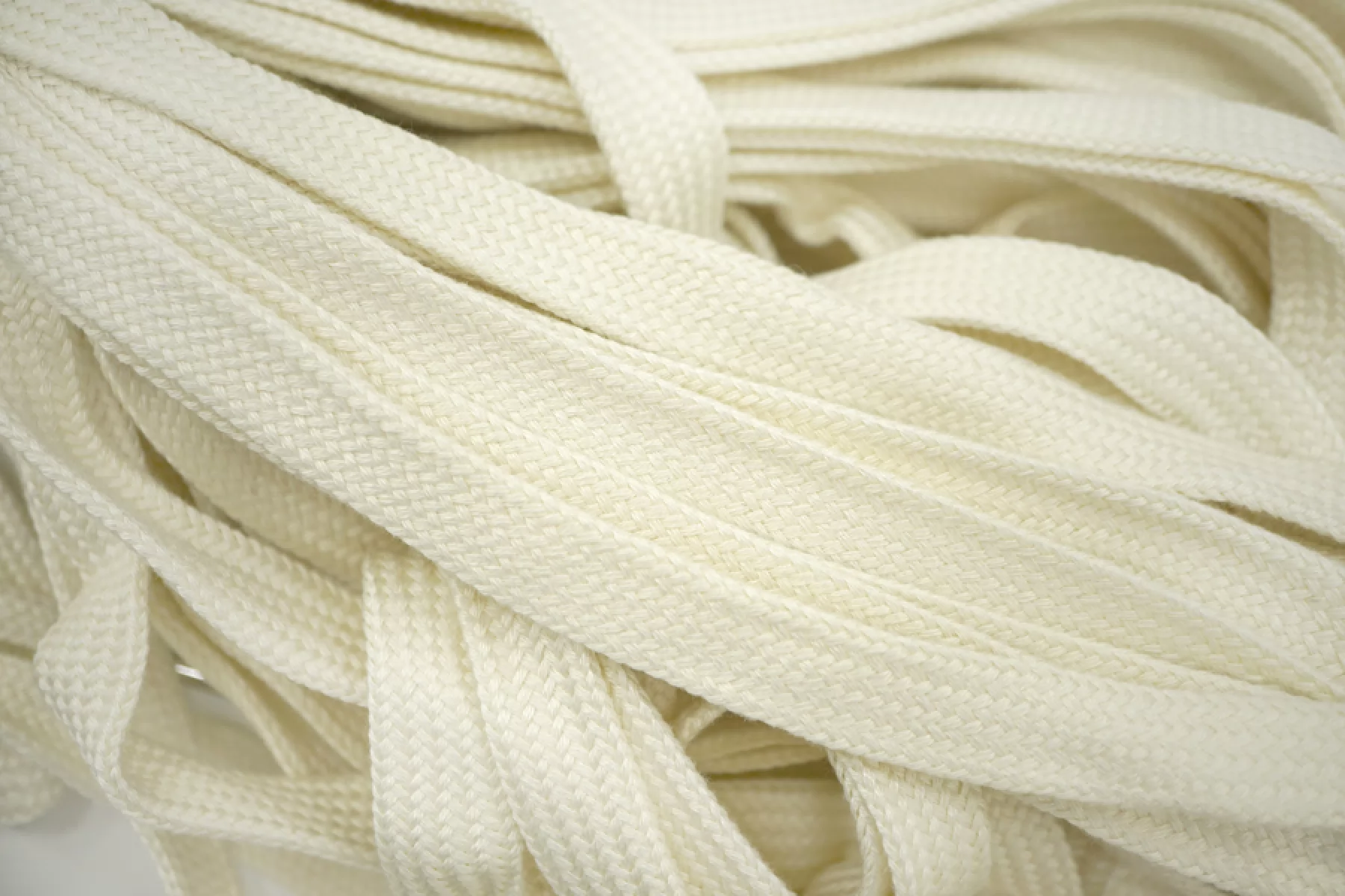 Плоский шнур бело-кремового цвета с серебристыми металлическими эглетами с обеих сторон. Ширина 15 мм, длина 90 см.