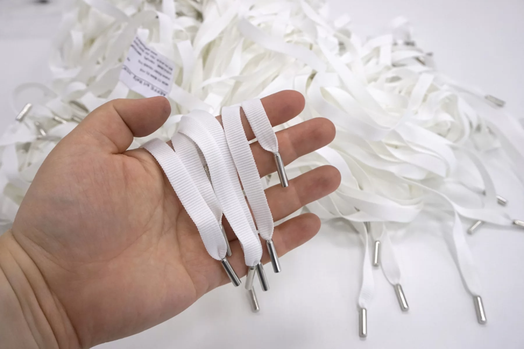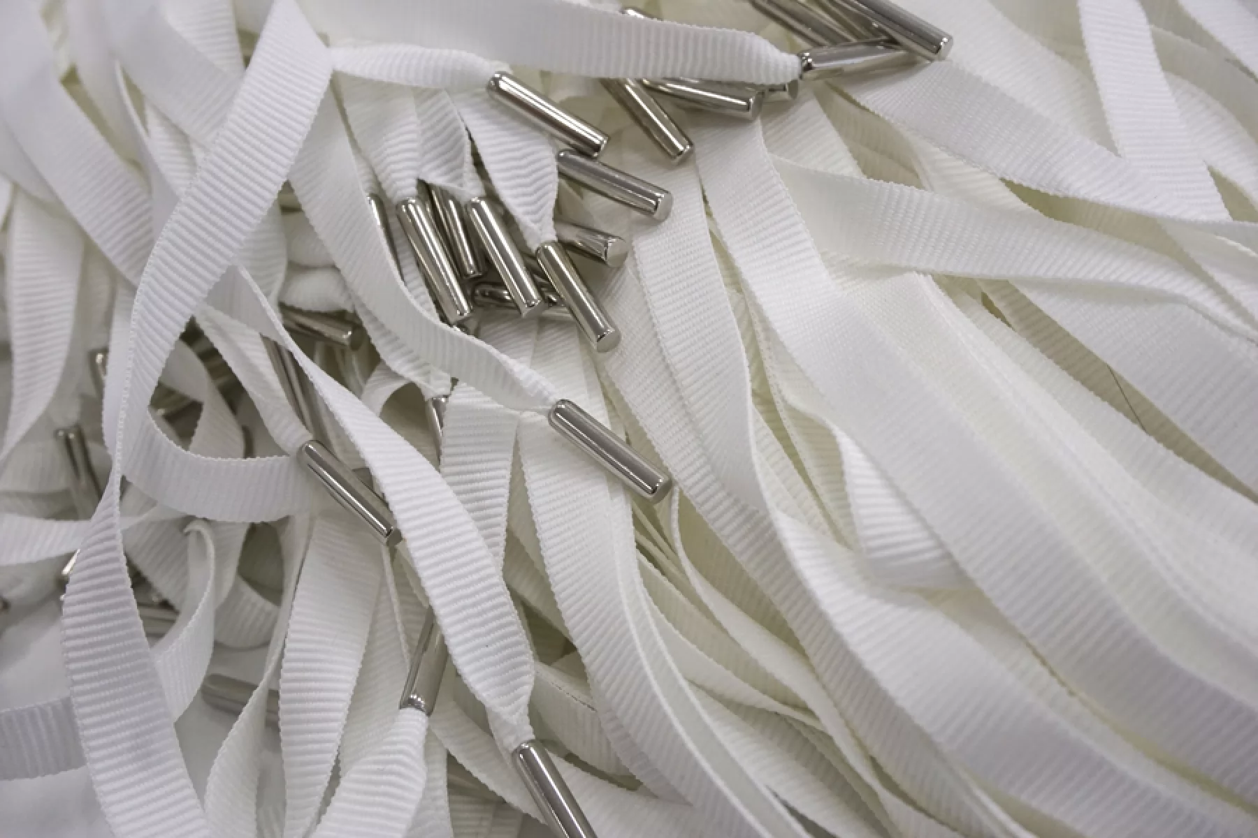 Плоский шнур белого цвета с серебристыми металлическими эглетами с обеих сторон. Ширина 1 см, длина 120 см.