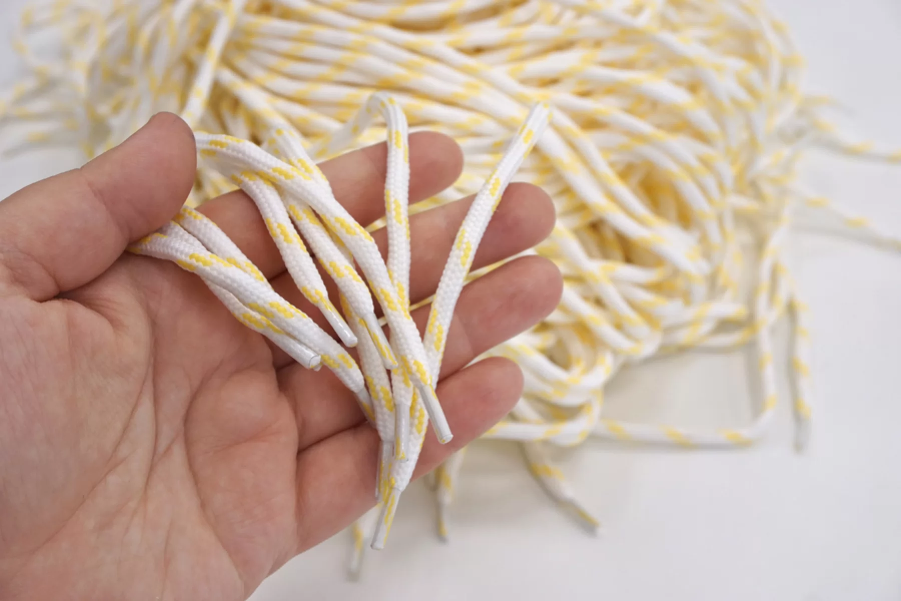 Круглый шнур белого цвета с желтыми полосками и пластиковыми эглетами с обеих сторон. Ширина около 5 мм, длина 84 см.