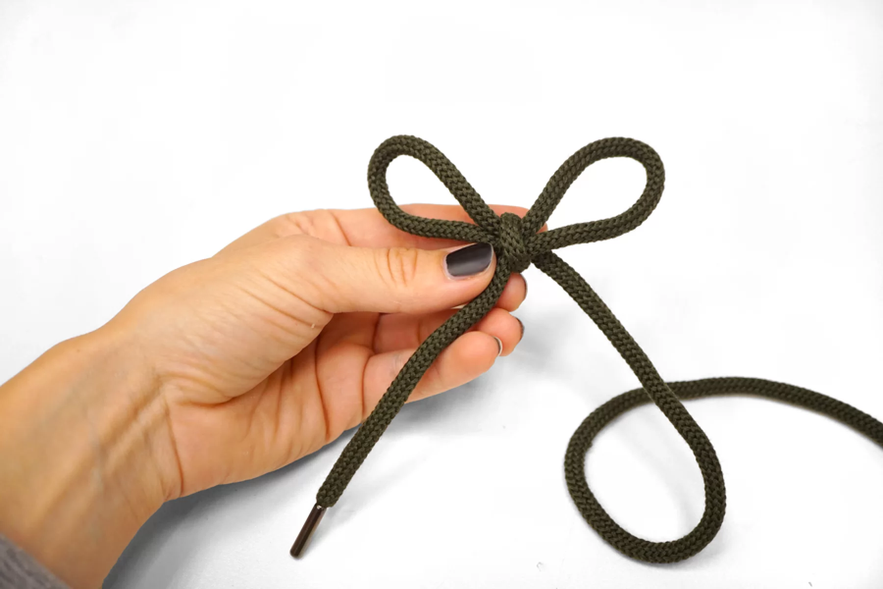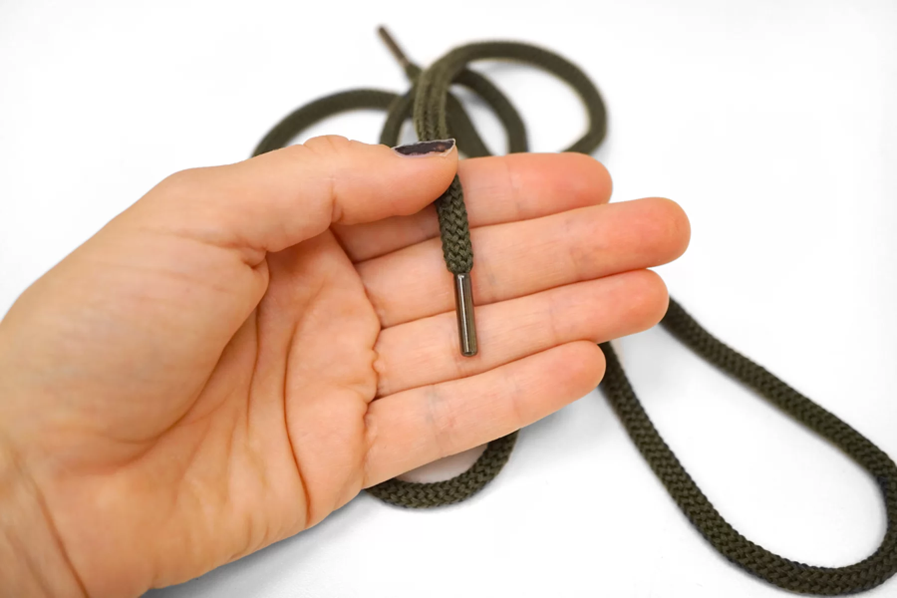 Плоский шнур цвета хаки с металлическими эглетами цвета тёмный никель с обеих сторон. Ширина 6 мм, длина 95 см.