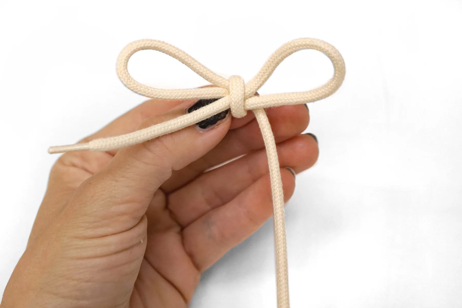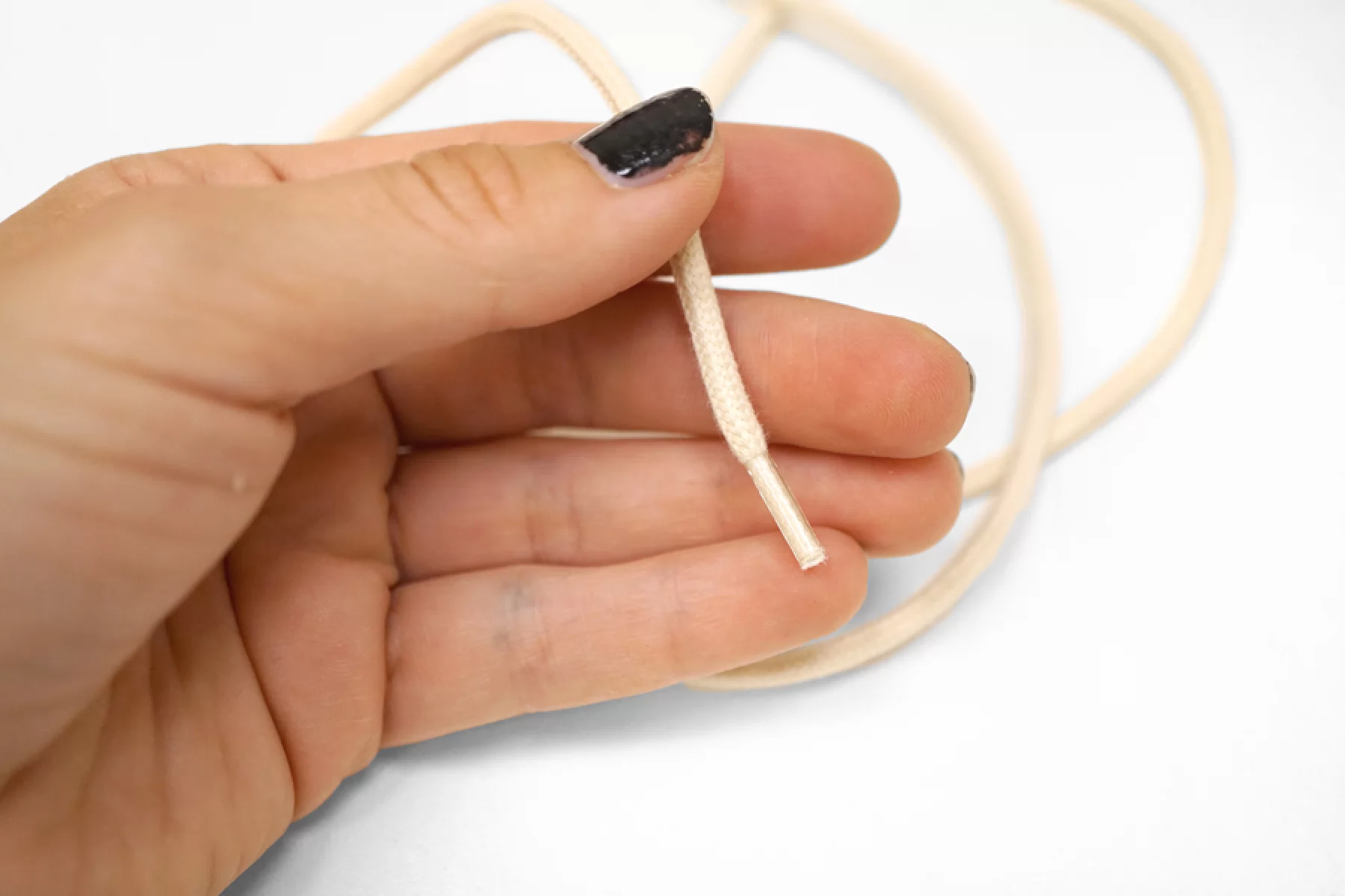 Круглый шнур молочного цвета с пластиковыми эглетами с обеих сторон. Ширина около 4 мм, длина 118 см.
