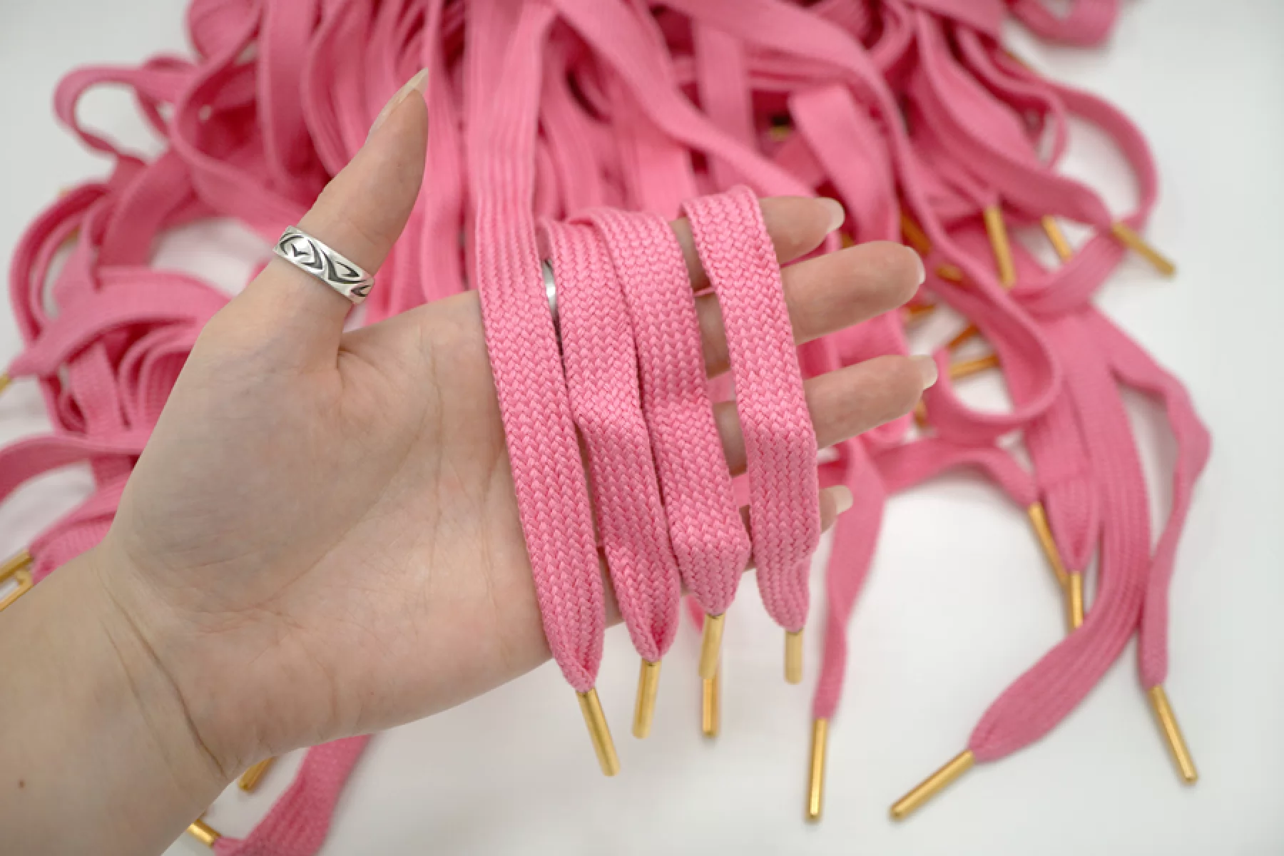 Плоский шнур розового цвета с золотистыми металлическими эглетами с обеих сторон. Ширина 15 мм, длина 100 см.