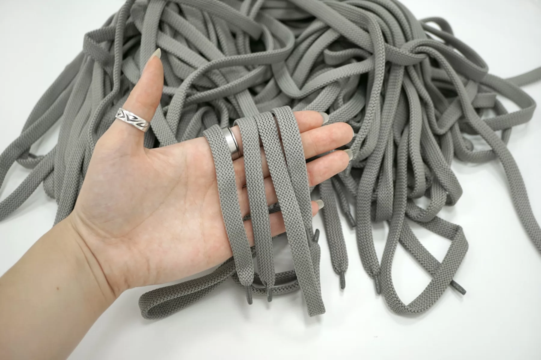 Плоский шнур серого цвета с пластиковыми эглетами с обеих сторон. Ширина 12 мм, длина 100 см.