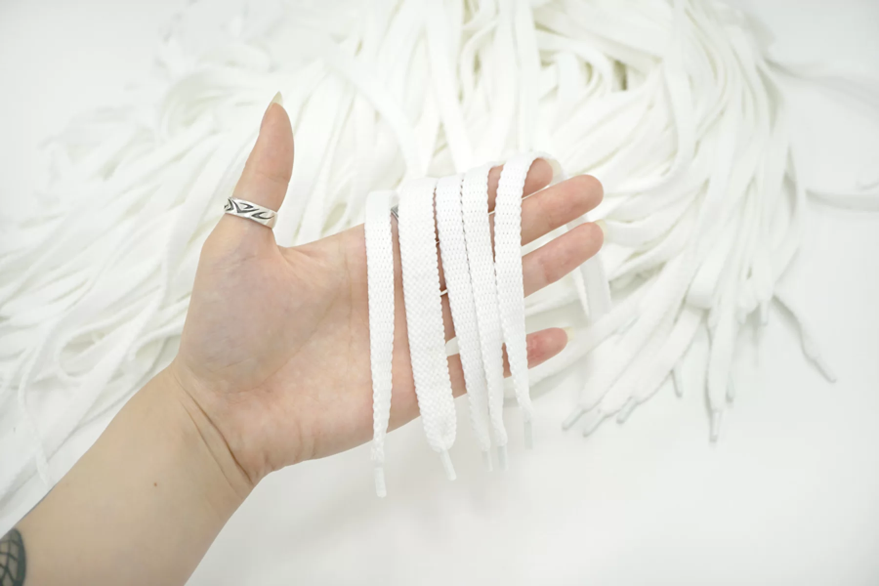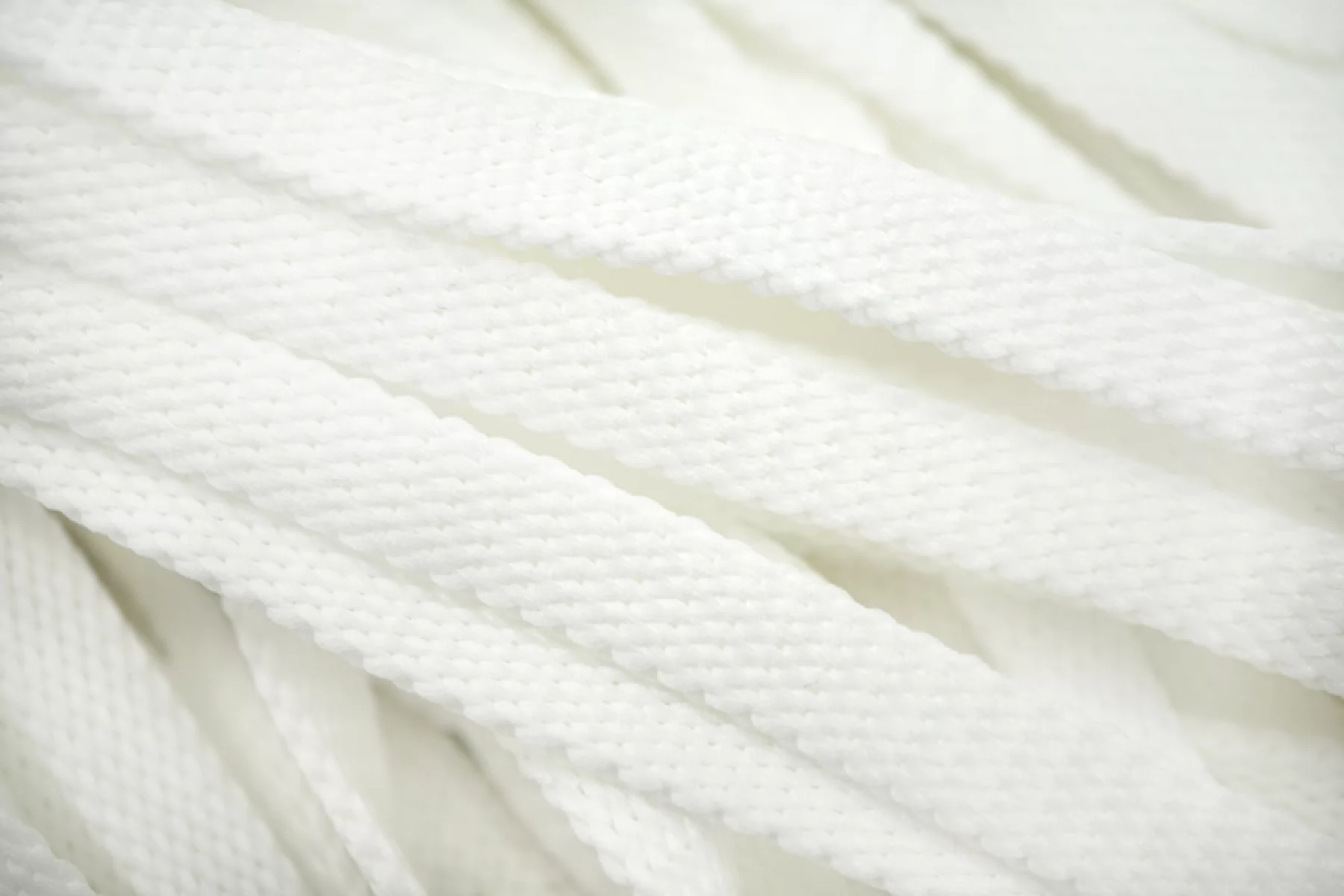 Плоский шнур Simonetta белого цвета с пластиковыми эглетами с обеих сторон. Ширина 10 мм, длина 80 см.
