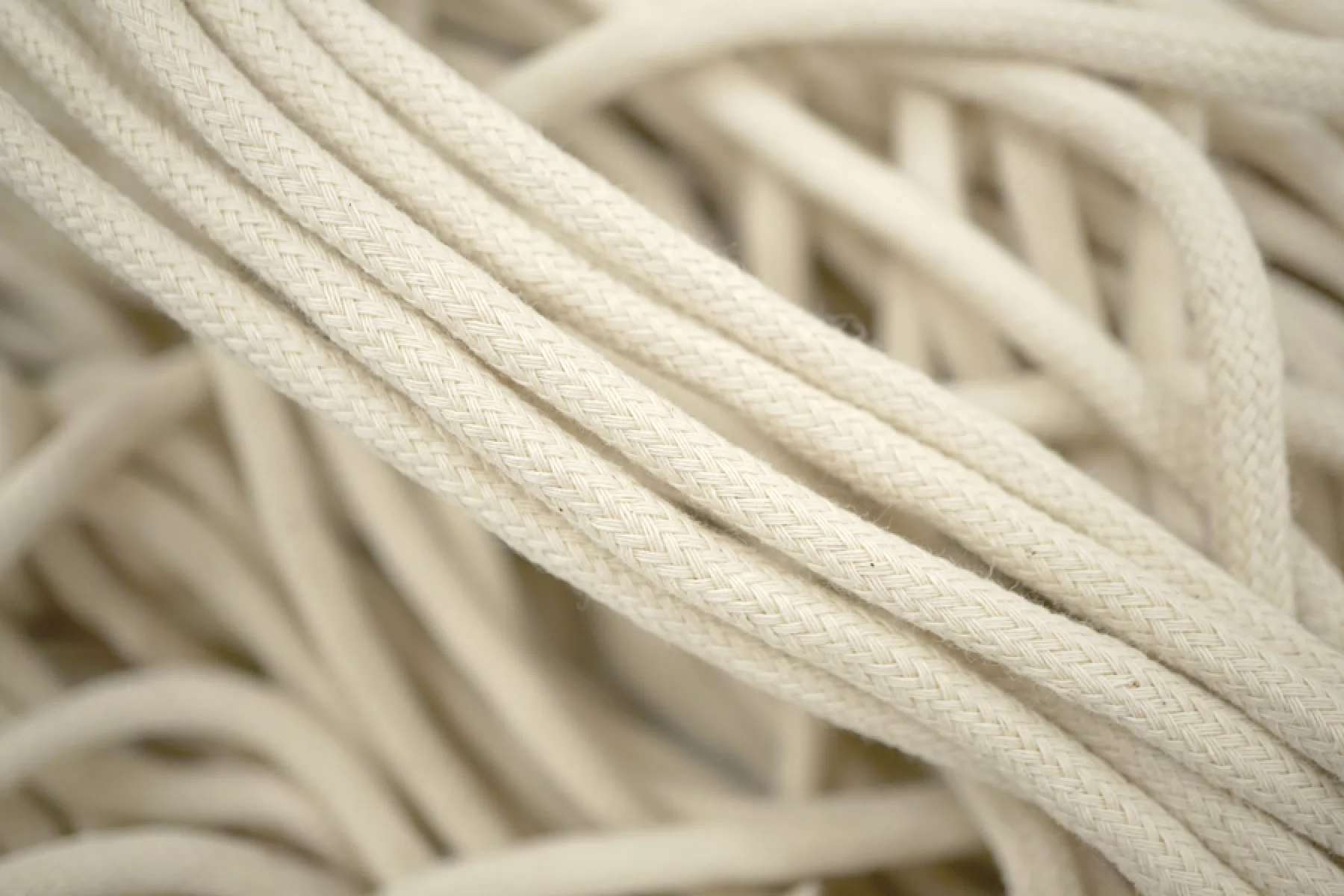 Круглый шнур Simonetta бежевого цвета с пластиковыми эглетами с обеих сторон. Ширина около 5 мм, длина 120 см.