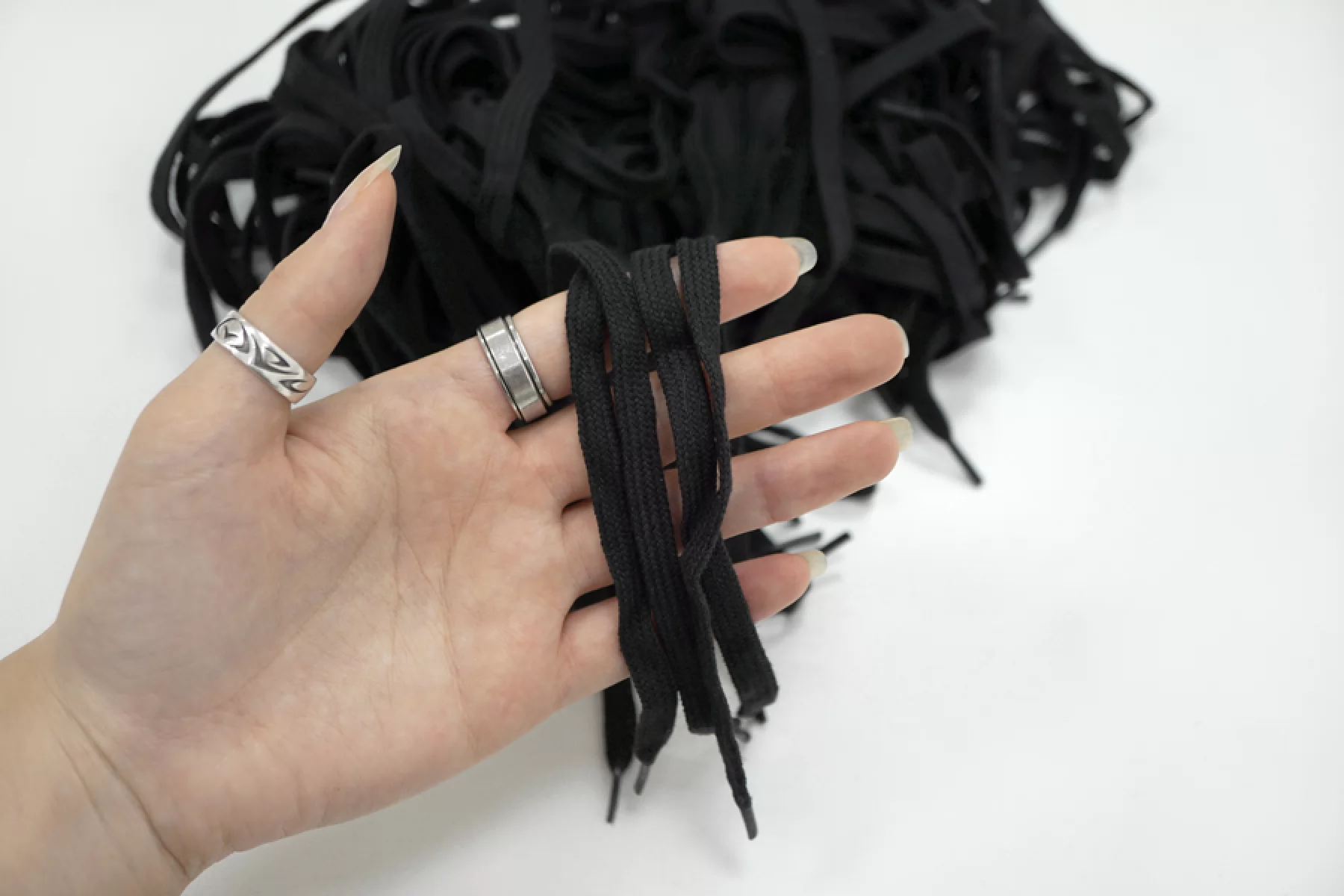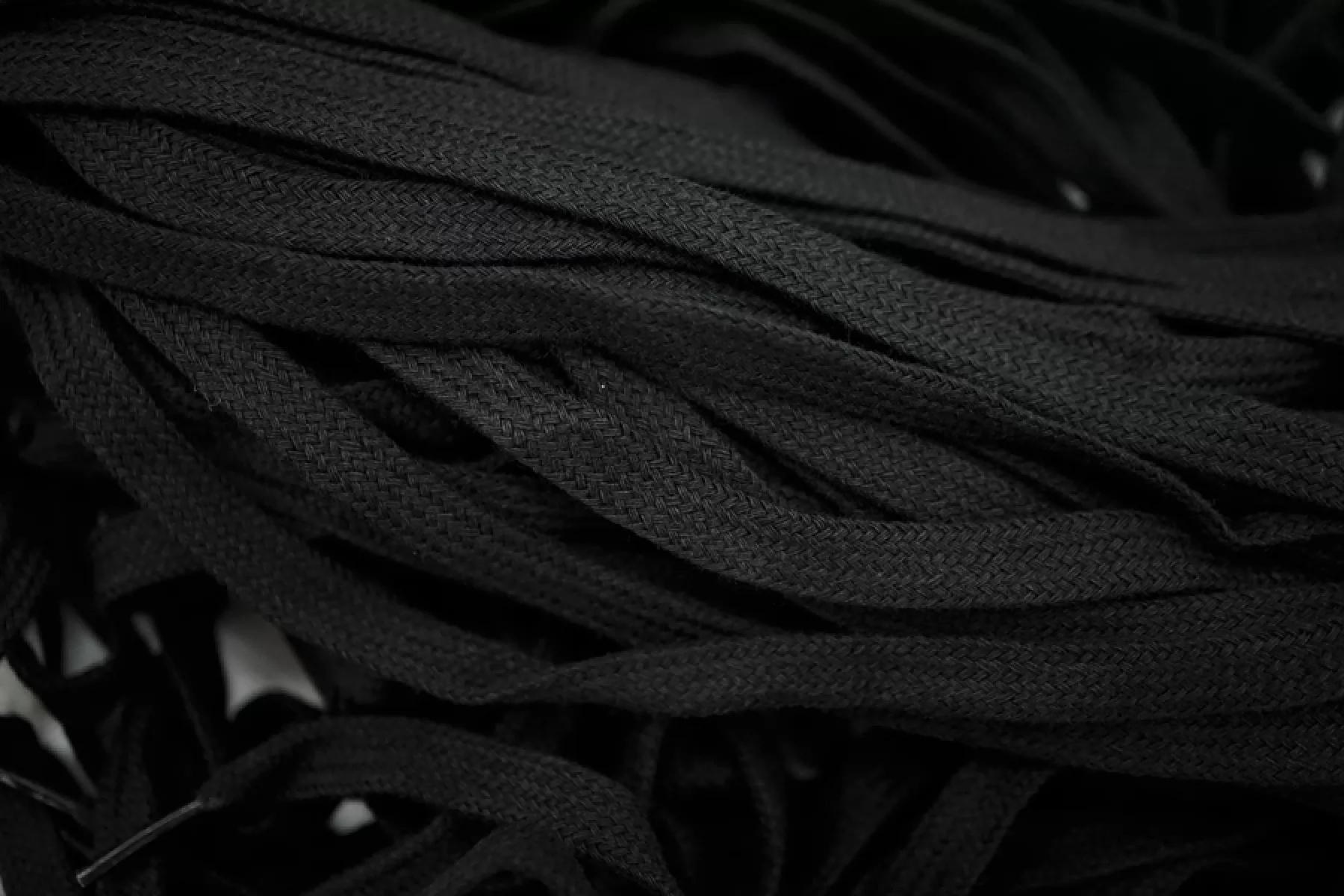 Плоский шнур Simonetta черного цвета с пластиковыми эглетами с обеих сторон. Ширина 7 мм, длина 86 см.