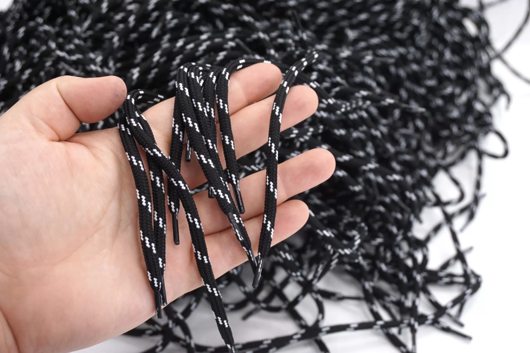 Круглый шнур Simonetta черного цвета с белыми полосками и пластиковыми эглетами с обеих сторон. Ширина около 5 мм, длина 94 см.