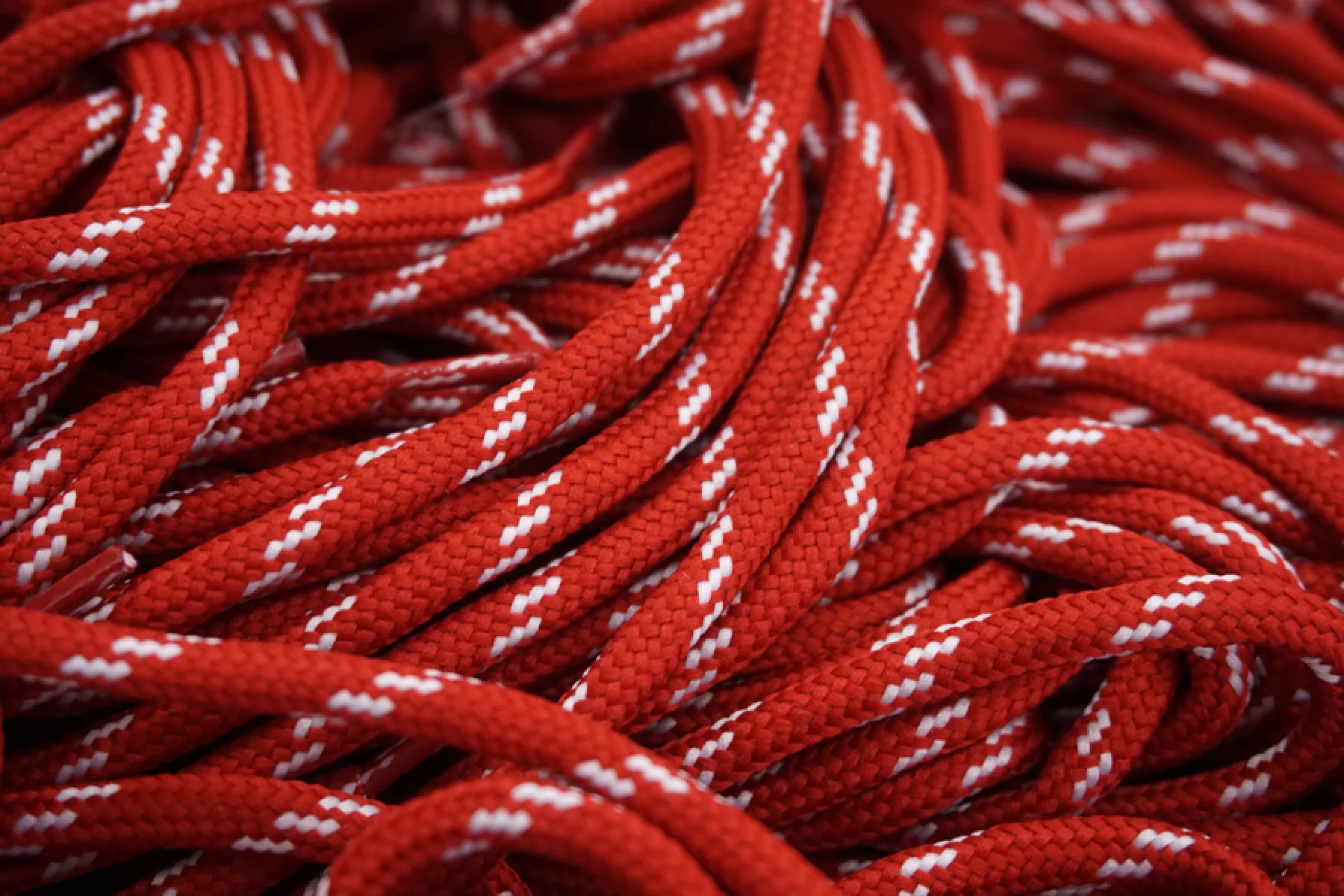 Круглый шнур Simonetta красного цвета с белыми полосками и пластиковыми эглетами с обеих сторон. Ширина около 5 мм, длина 35 см.