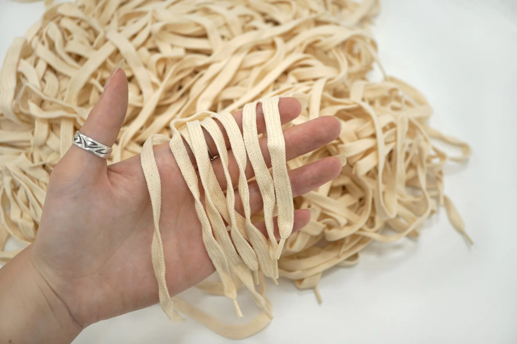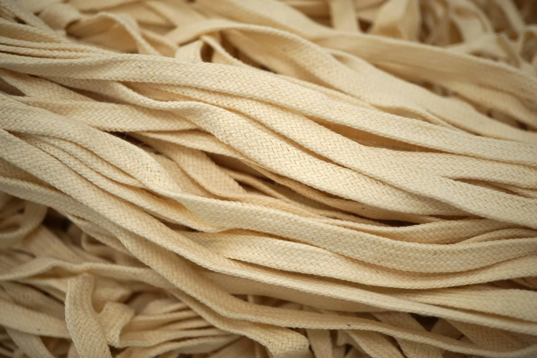 Плоский шнур Simonetta кремового цвета с пластиковыми эглетами с обеих сторон. Ширина 7 мм, длина 103 см.