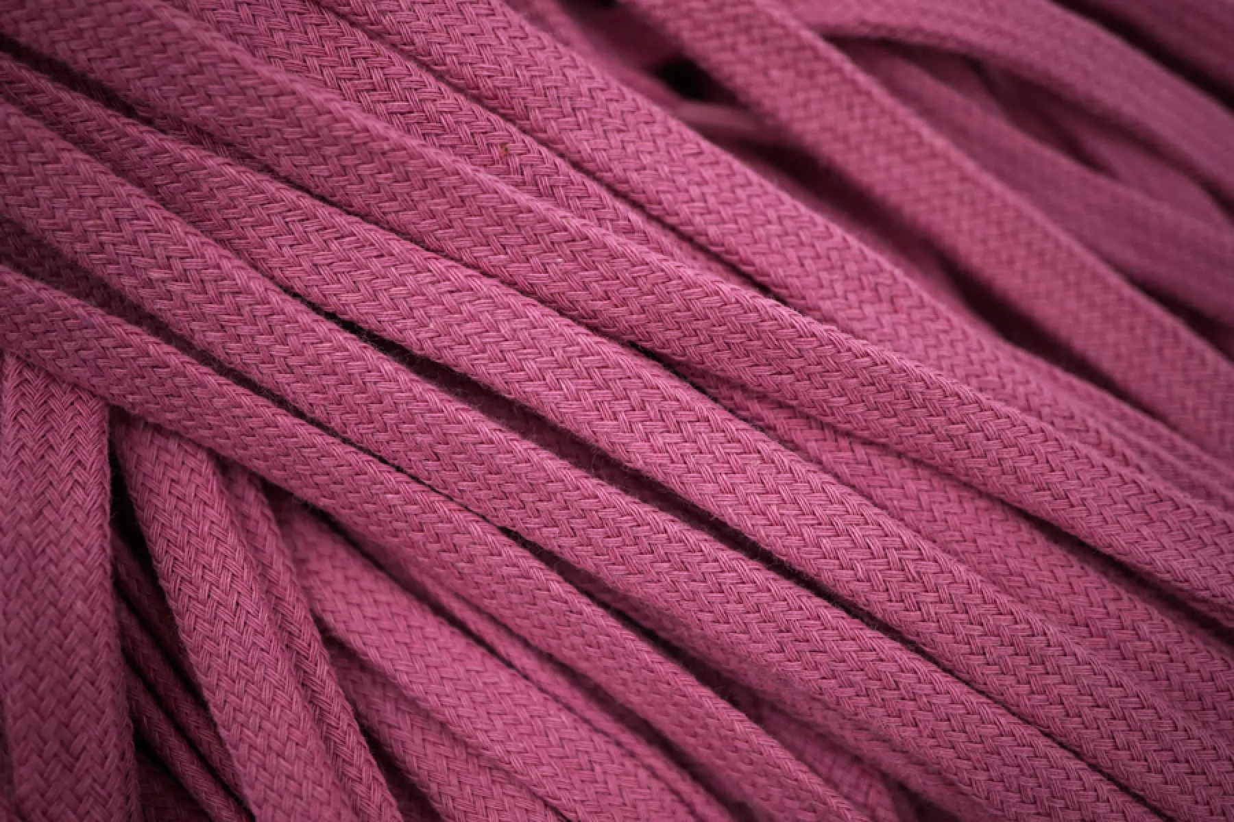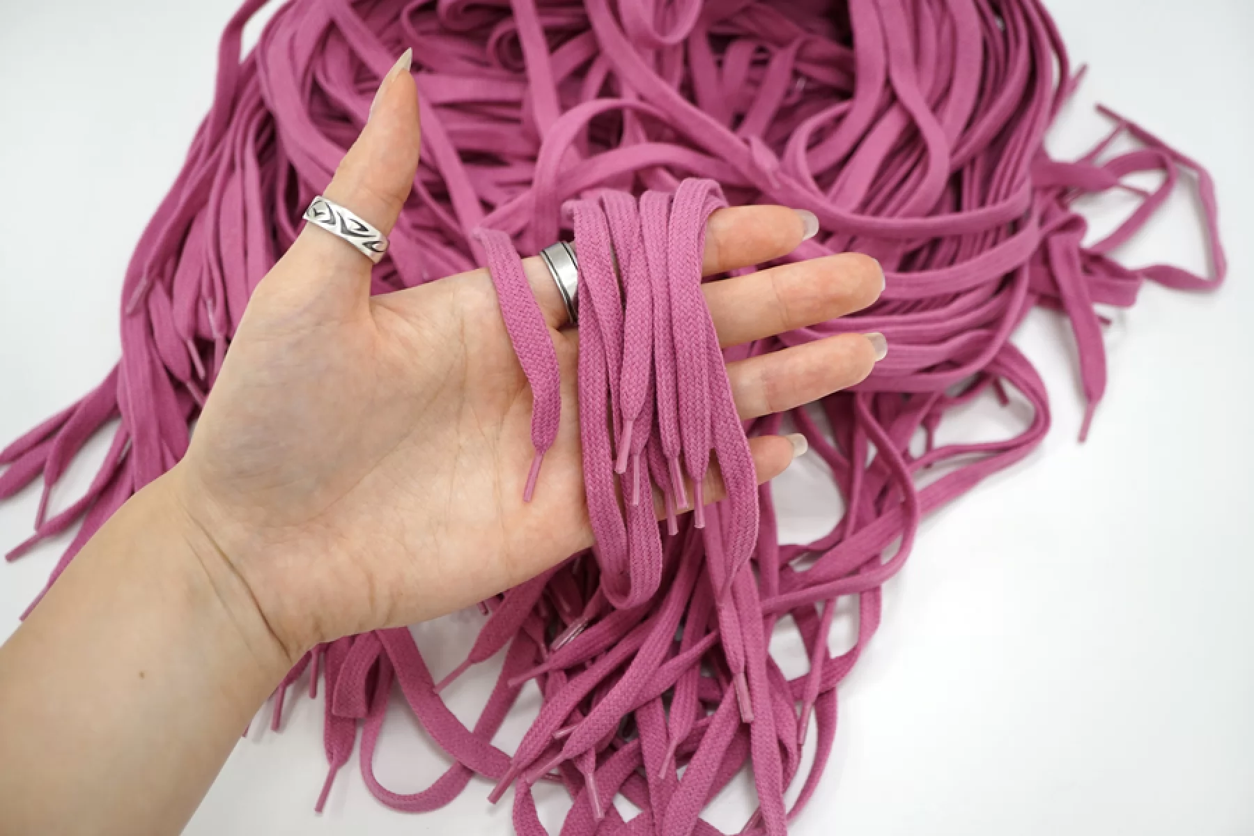 Плоский шнур Simonetta приглушенная фуксия с пластиковыми эглетами с обеих сторон. Ширина 7 мм, длина 89 см.