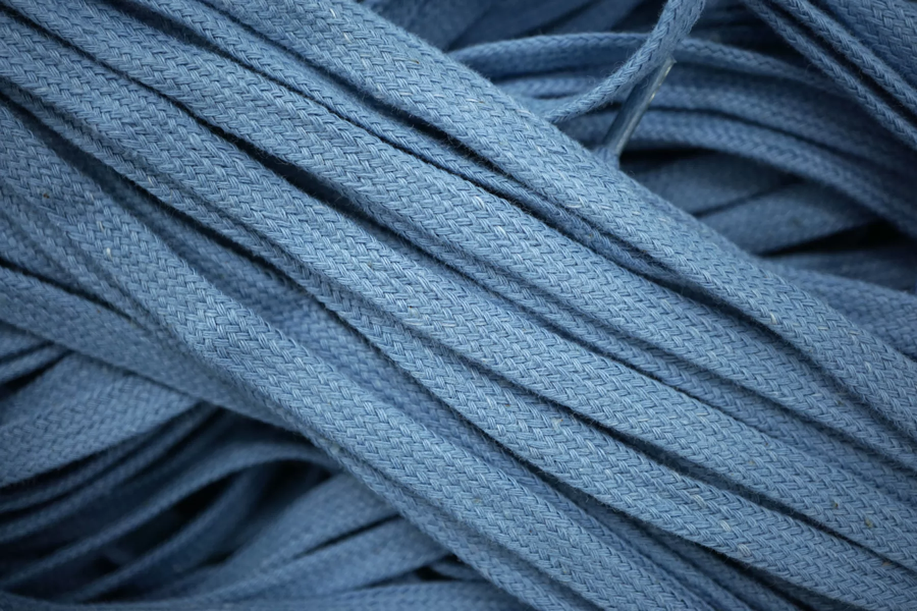 Плоский шнур Simonetta пыльно-голубого цвета с пластиковыми эглетами с обеих сторон. Ширина 7 мм, длина 102 см.