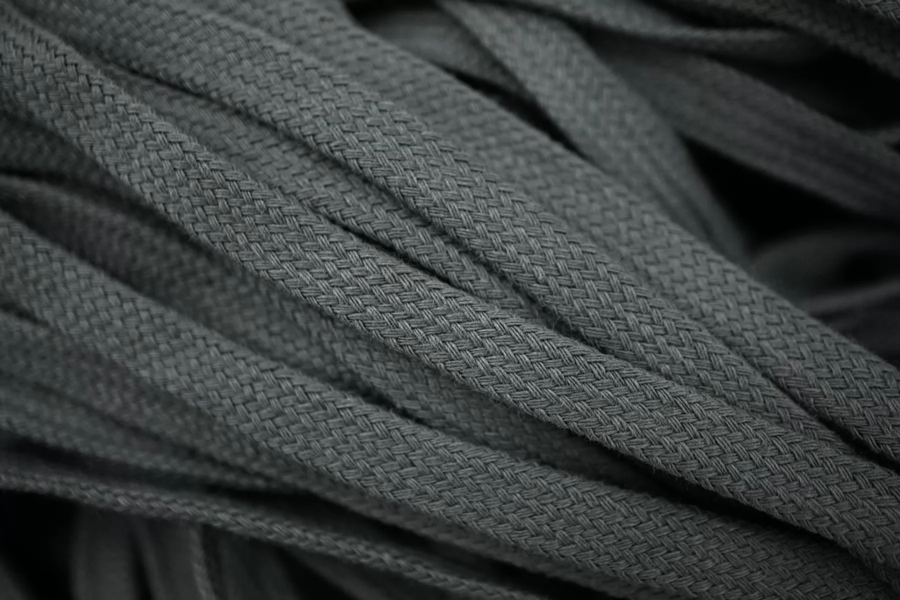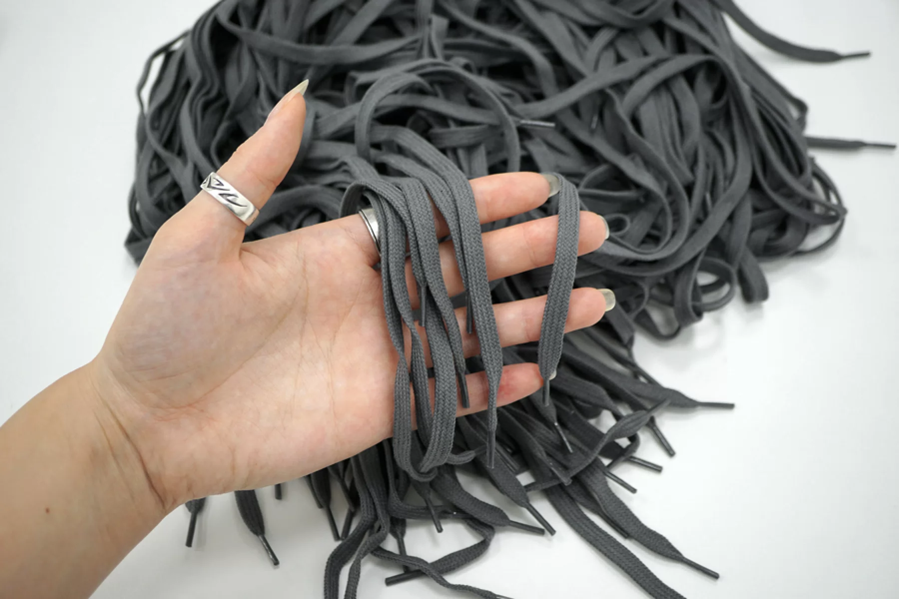 Плоский шнур Simonetta серого цвета с пластиковыми эглетами с обеих сторон. Ширина 7 мм, длина 150 см.