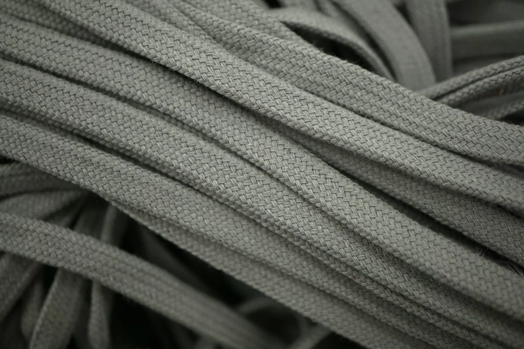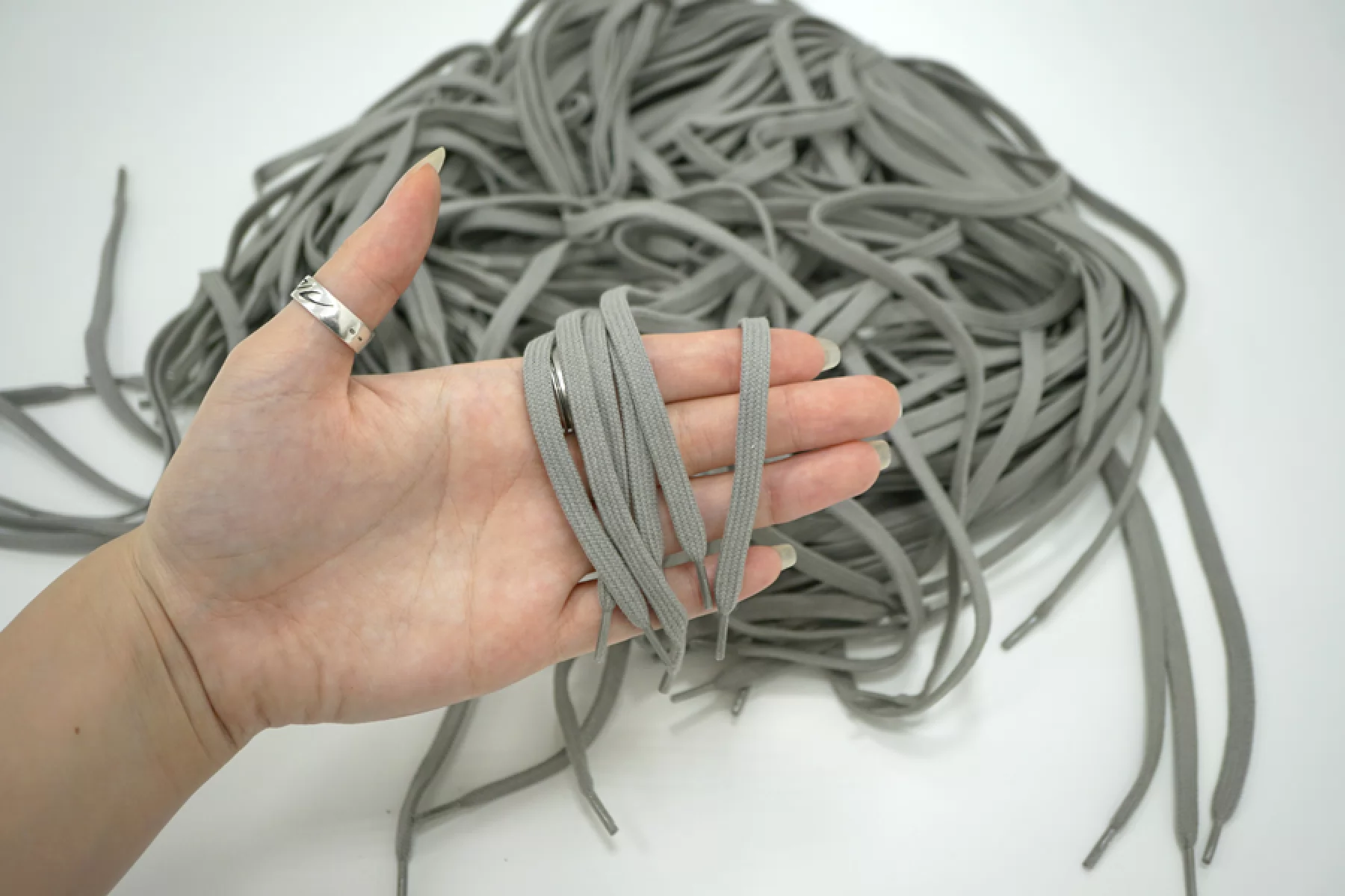 Плоский шнур Simonetta светло-серого цвета с пластиковыми эглетами с обеих сторон. Ширина 5 мм, длина 68 см.