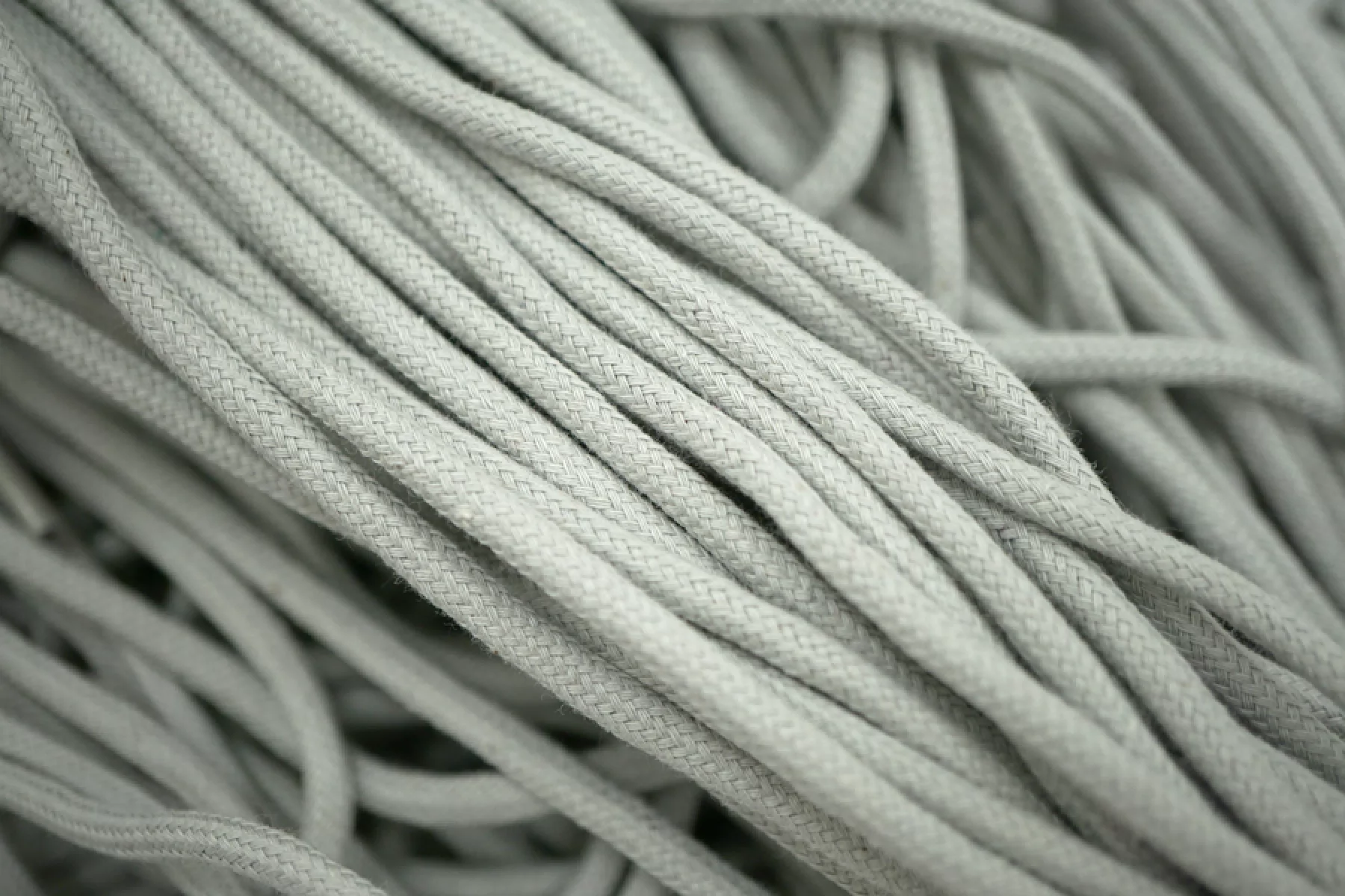 Круглый шнур Simonetta светло-серого цвета с пластиковыми эглетами с обеих сторон. Ширина около 4 мм, длина 96 см.