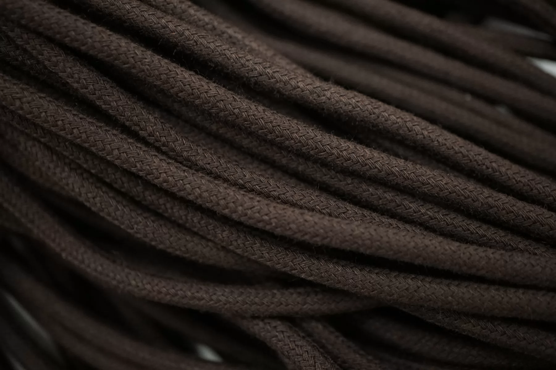 Круглый шнур Simonetta темно-коричневого цвета с пластиковыми эглетами с обеих сторон. Ширина около 4 мм, длина 100 см.
