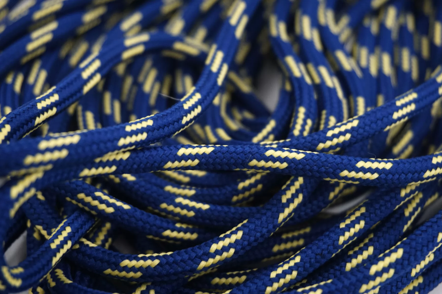 Круглый шнур синего цвета с желтыми полосками и пластиковыми эглетами с обеих сторон. Ширина около 5 мм, длина 86 см.