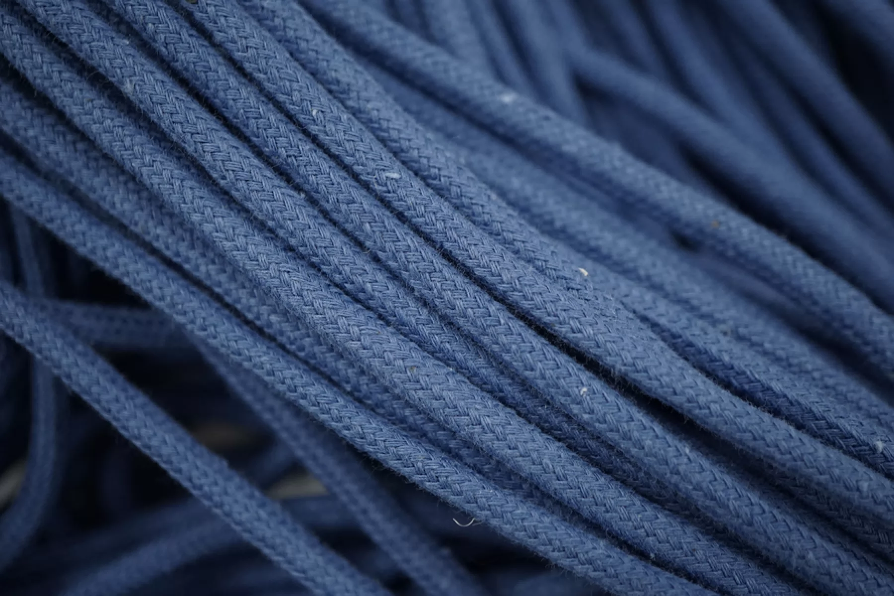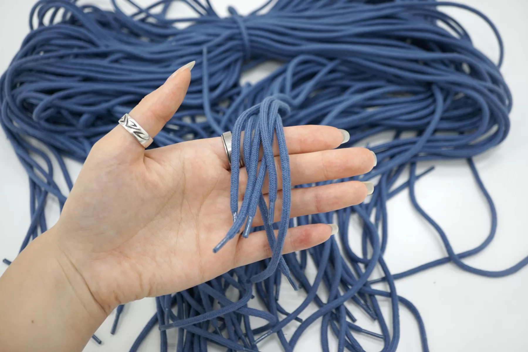 Круглый шнур темно-голубого цвета с пластиковыми эглетами с обеих сторон. Ширина 4 мм, длина 102 см.