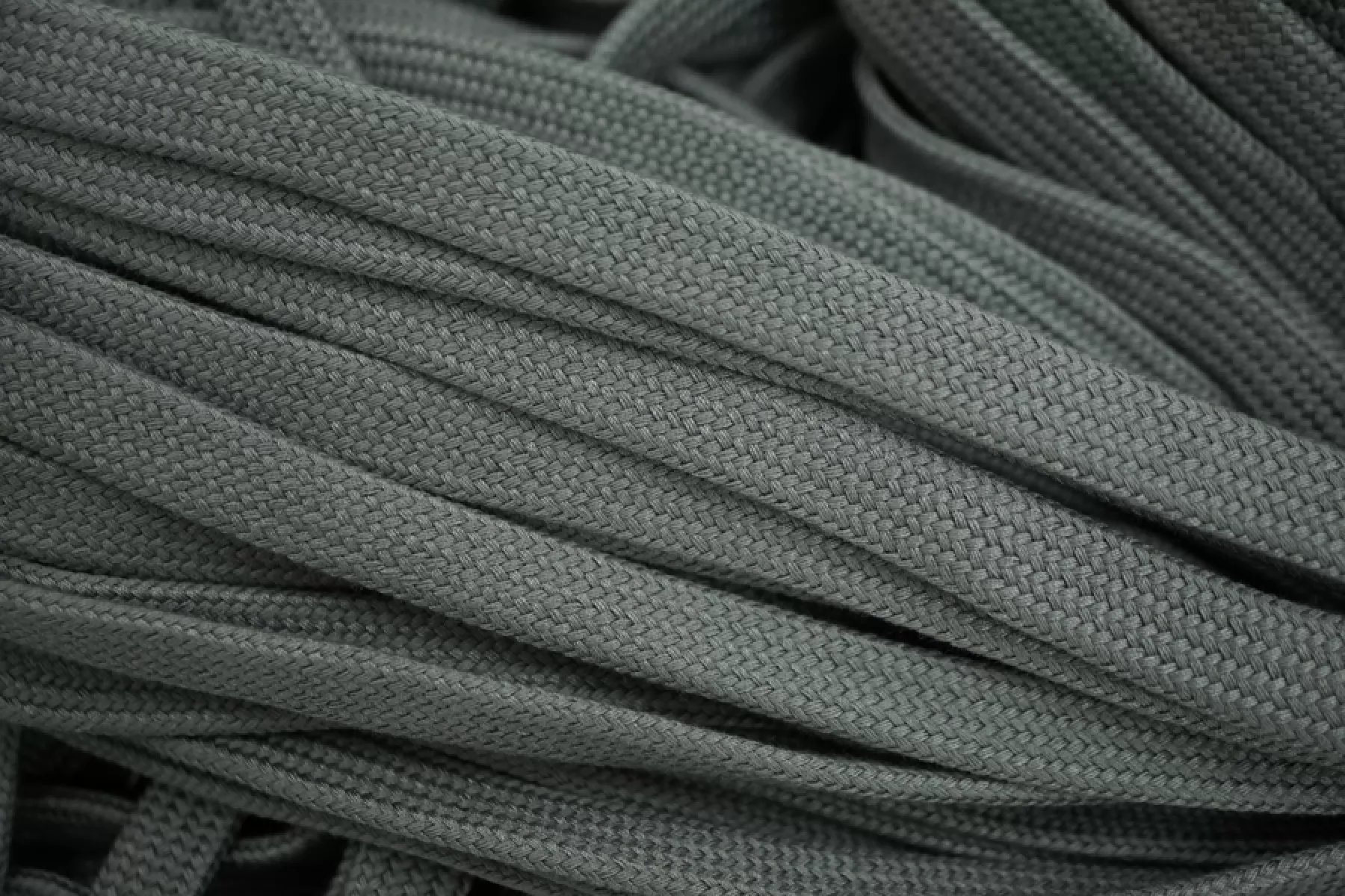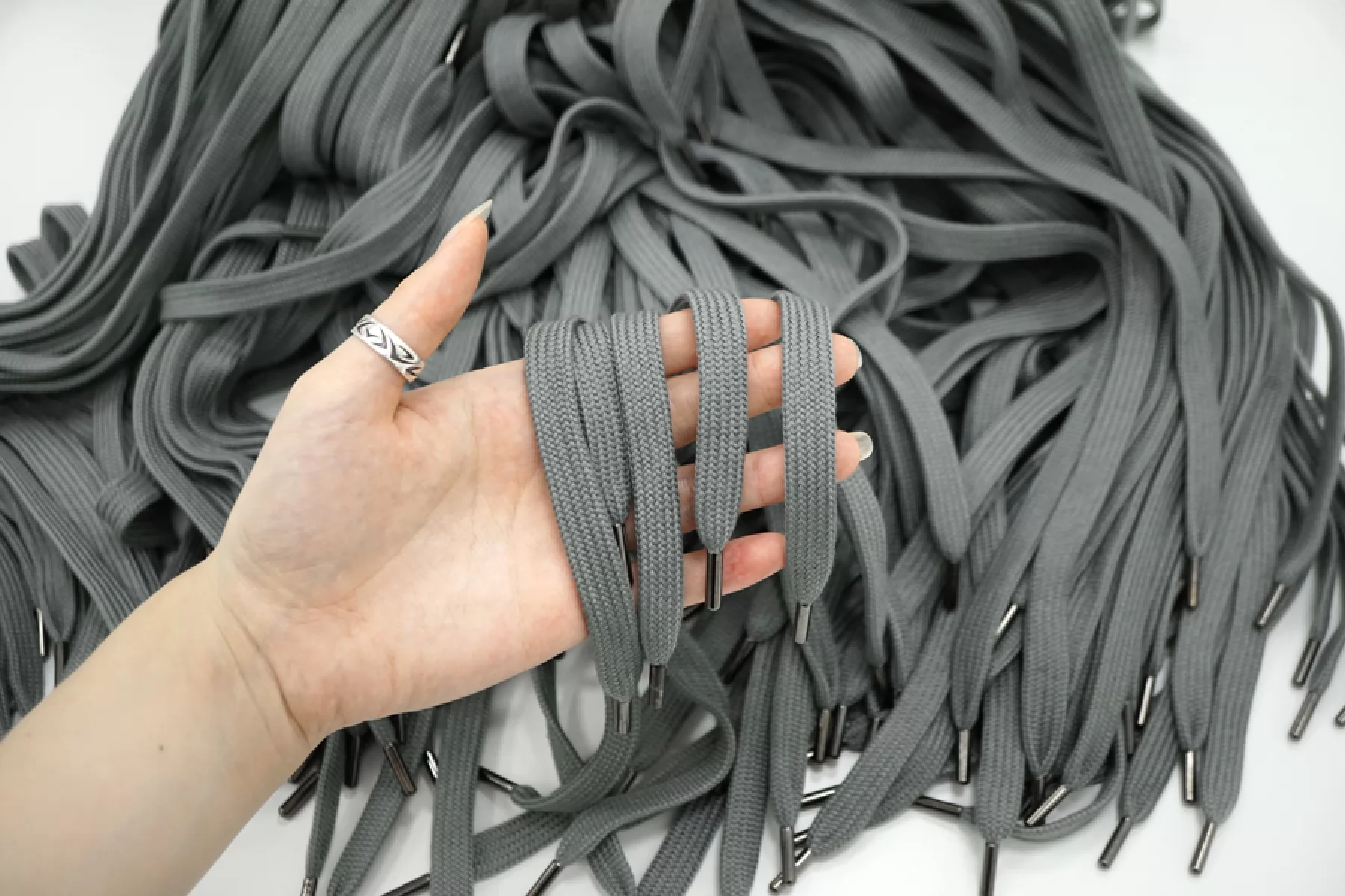 Плоский шнур темно-серого цвета с металлическими эглетами цвета никель с обеих сторон. Ширина 17 мм, длина 114 см.