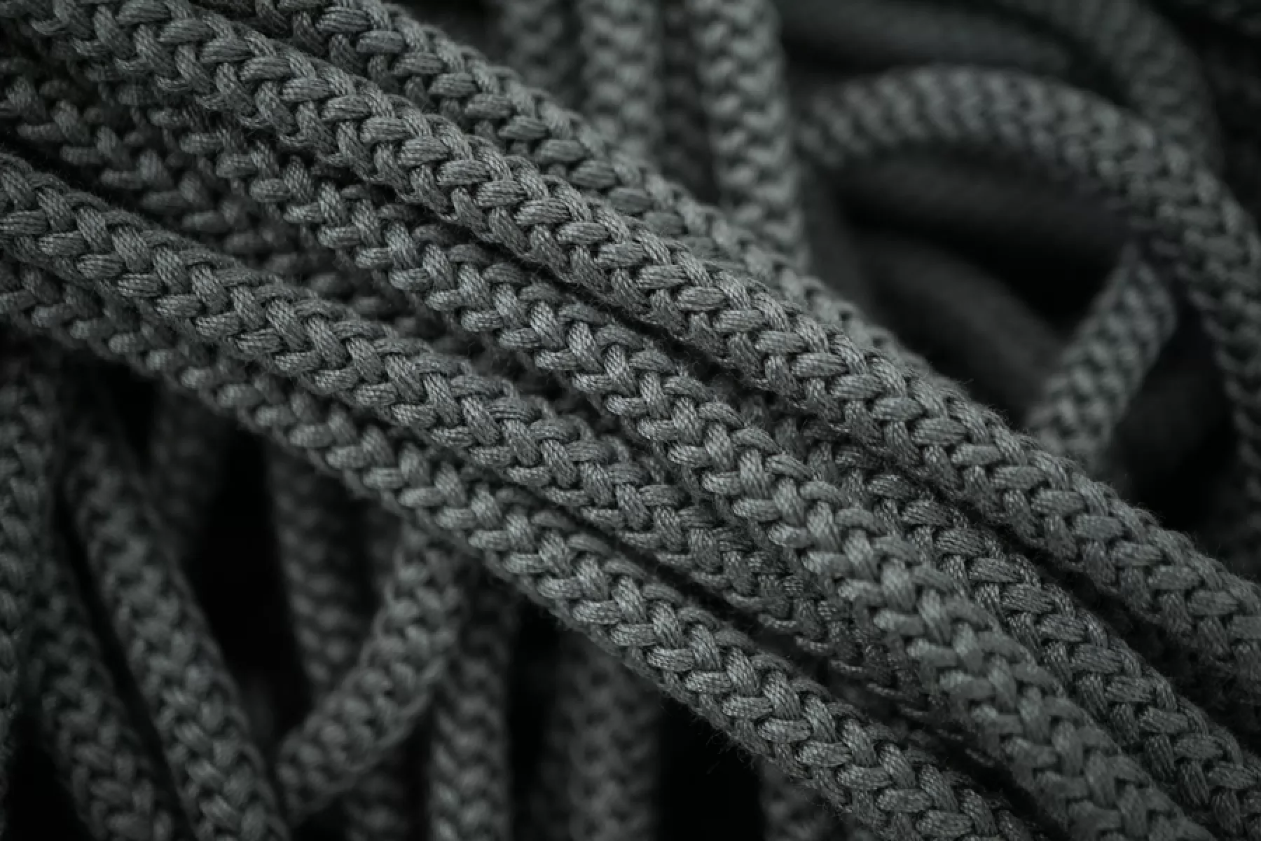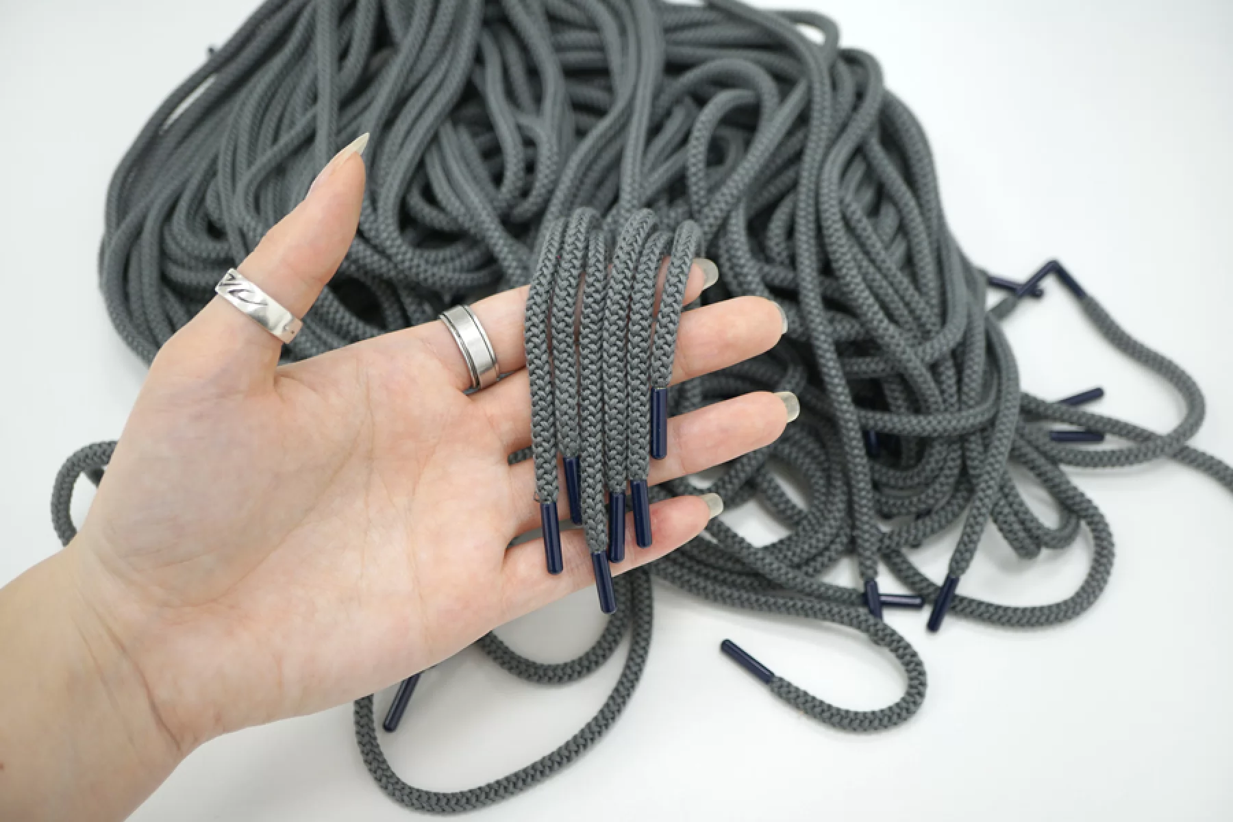 Круглый шнур темно-серого цвета с эглетами темно-синего цвета с обеих сторон. Ширина 5 мм, длина 90 см.