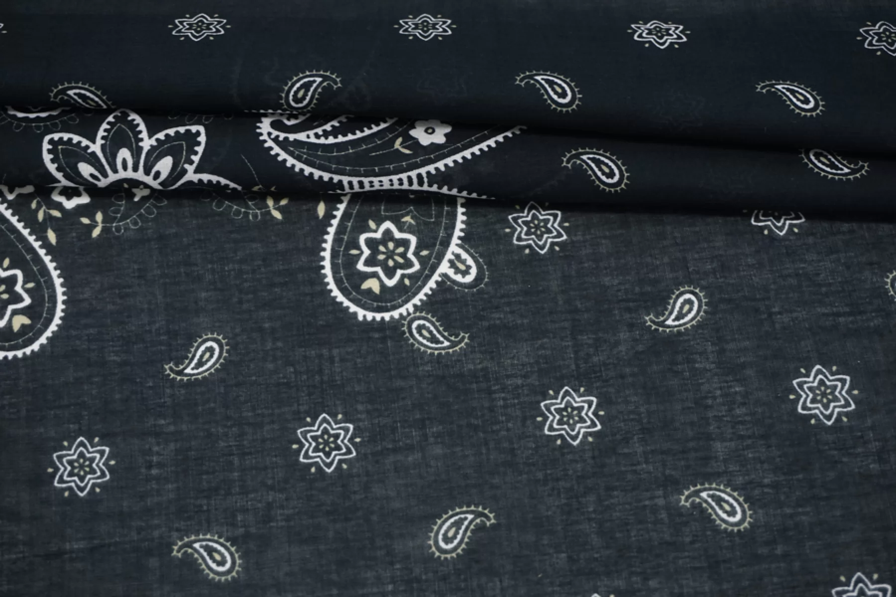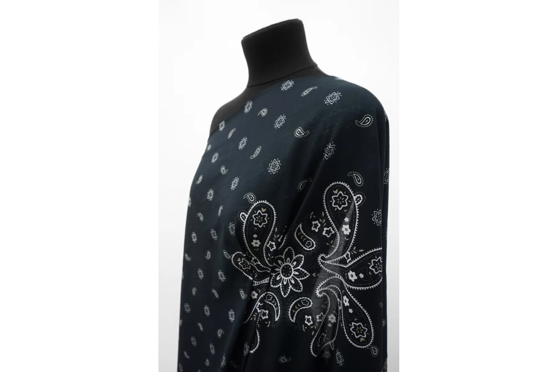 Ткань купонная, длина купона 97 см, цена за купон 1152,36 руб. Плательный тонкий штапель с принтом - небольшие белые огурцы разбавлены орнаментом на черном фоне. Тонкий, пластичный, просвечивает. Подойдет для пошива платья, топа, блузки, юбки. Для поясных изделий советуем подкладку. При работе с этой тканью советуем использовать тонкие иглы и нитки.
