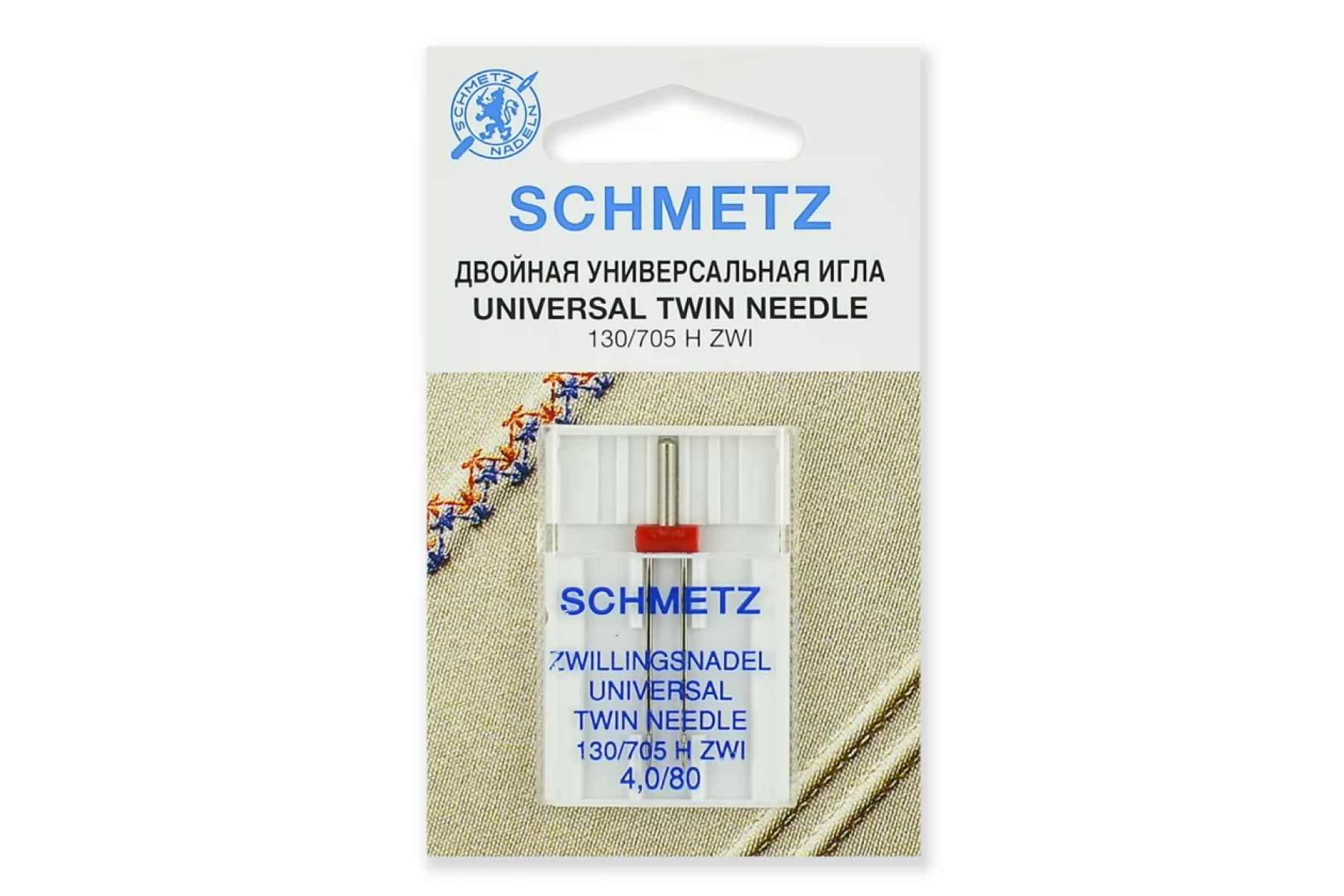 Двойные иглы (две иглы на одном держателе) применяются для создания двойной строчки. Они используются для выполнения рельефных защипов, декоративных швов, для пришивания тесьмы. Универсальные иглы со слегка закругленным острием, для беспроблемной обработки многочисленных видов материала. Расстояние между иглами 4 мм.