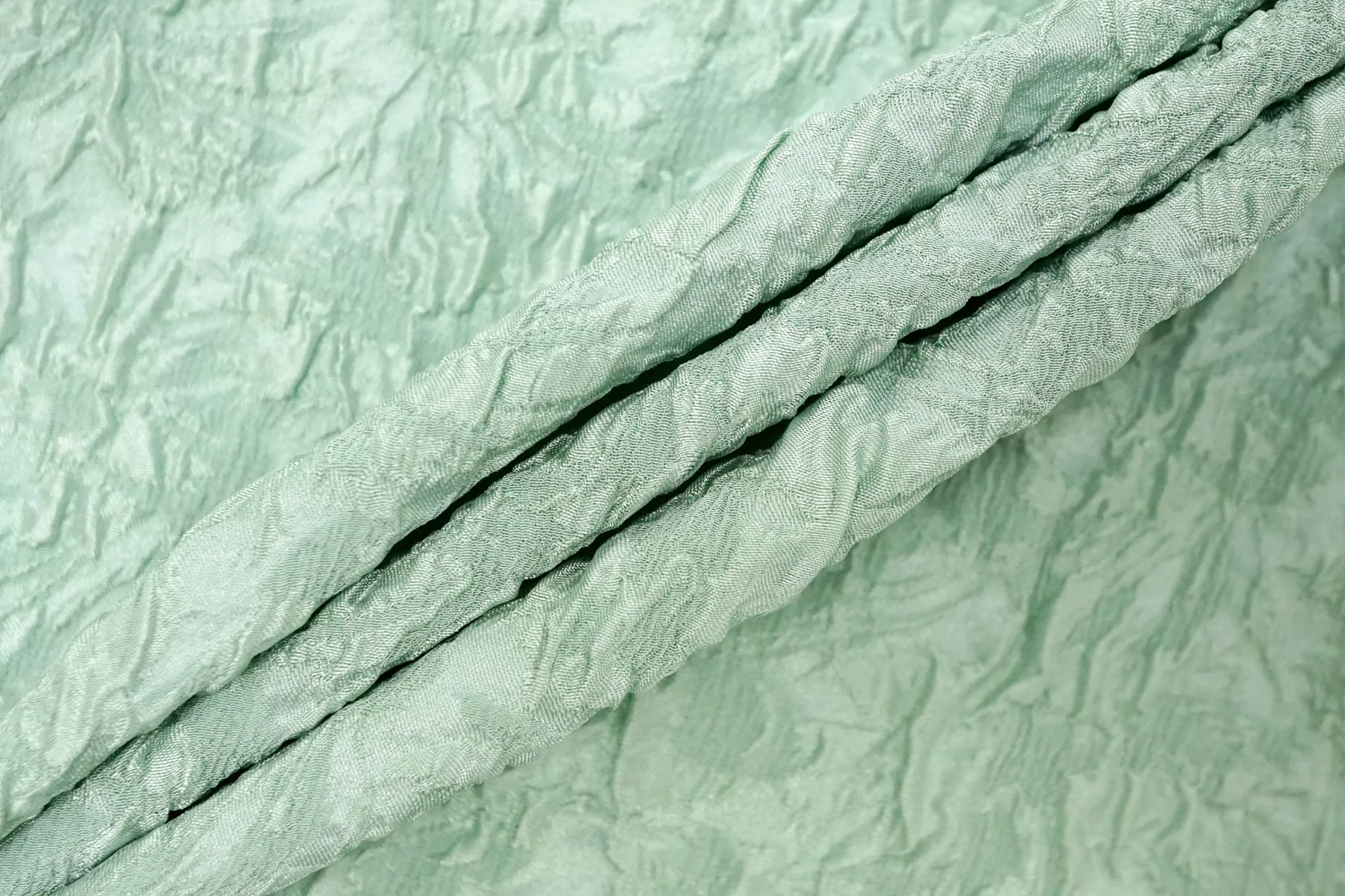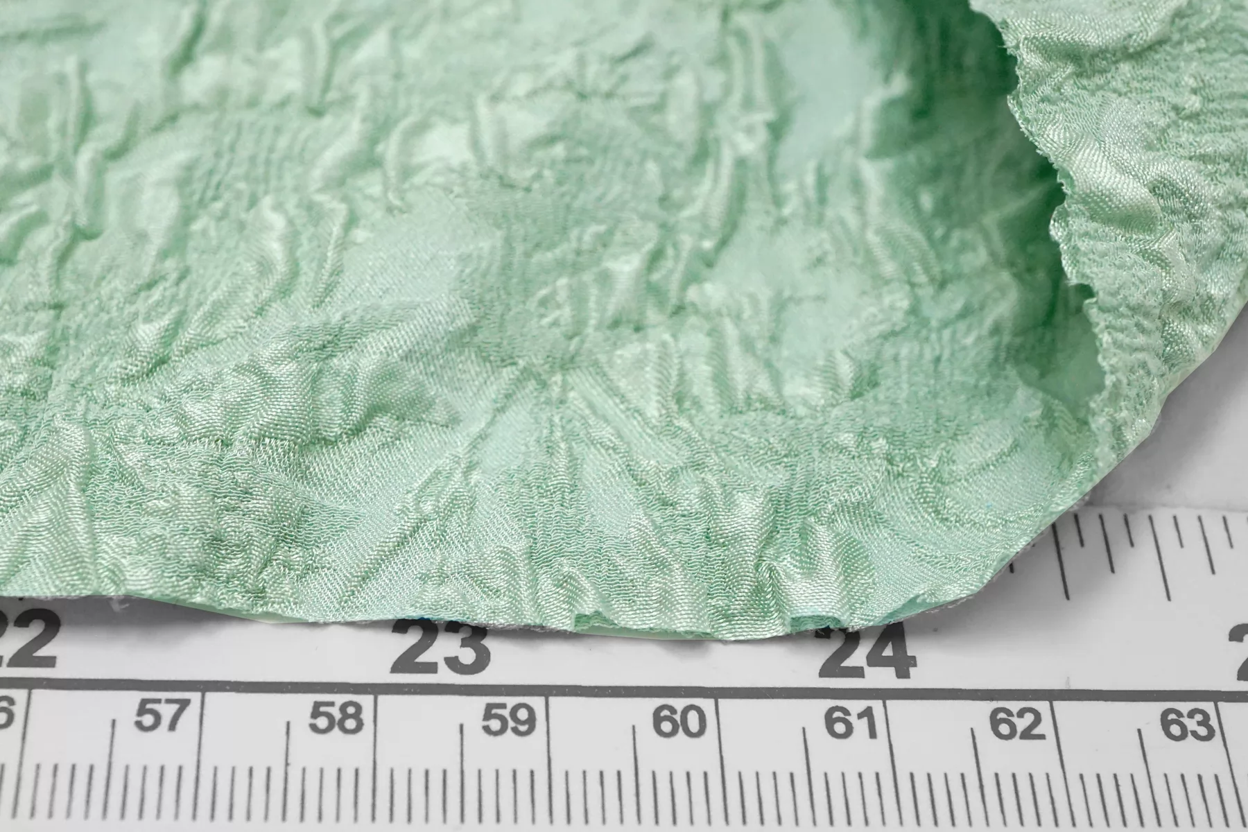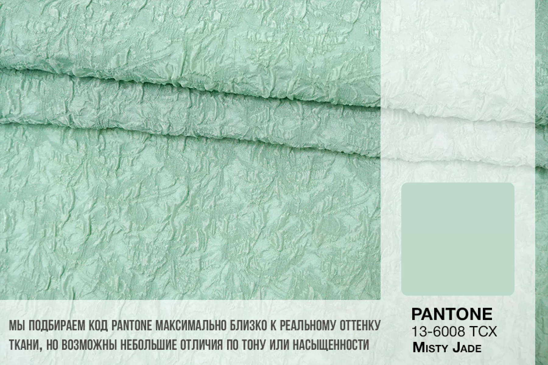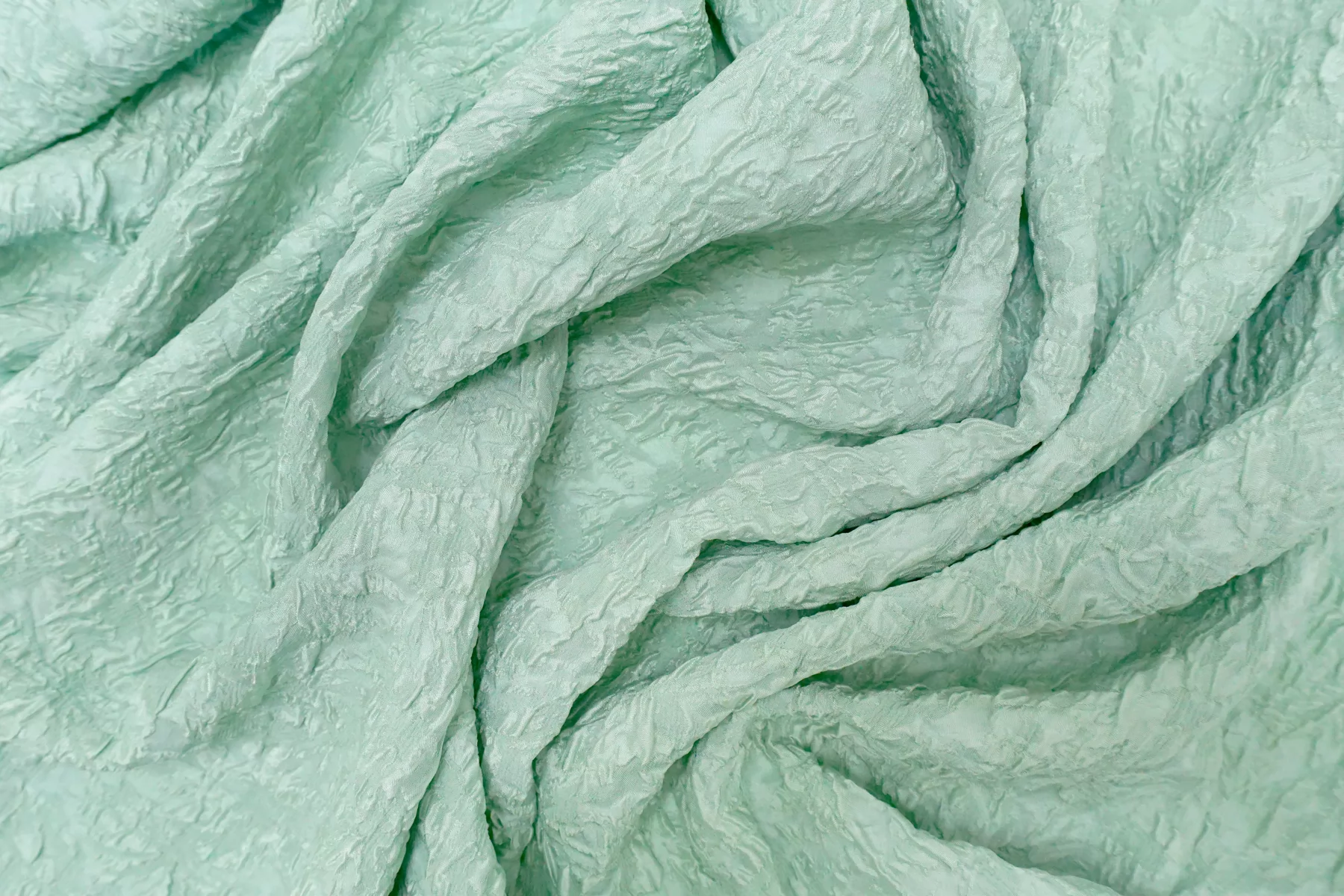Необычная шёлковая ткань-фукра, с объёмной фактурой, в нежном мятном оттенке. Тактильно шероховатая. Пружинит за счет плетения. Слегка сминается. Немного просвечивает. Шьем блузки, платья, юбки и не только. При необходимости используйте подкладочный материал.