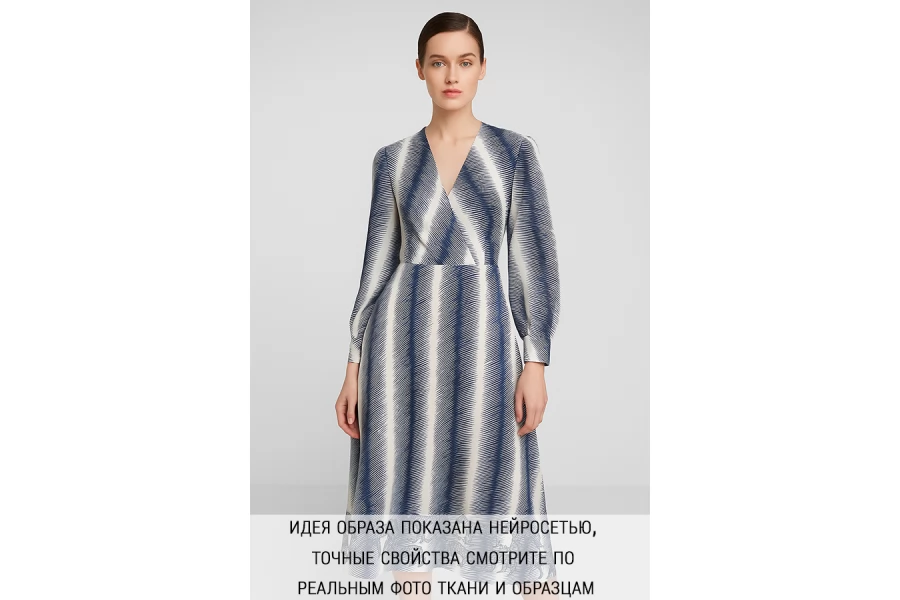 Интересный плательно-блузочный шёлк от бренда Max Mara с абстрактно-полосатым принтом, в тёмно-синем, белом и черном цветах. Очень приятный тактильно, гладкий. Средней плотности, пластичный. Обладает красивым шелковым лоском. Не тянется. Светлые участки слегка просвечивают. Немного мнется. Упруго держит форму. Прекрасный легкий вариант на блузки, рубашки, платья и юбки. При необходимости используйте подкладочный материал. Уход за шелком деликатный, при пошиве используйте тонкие иглы и нитки.