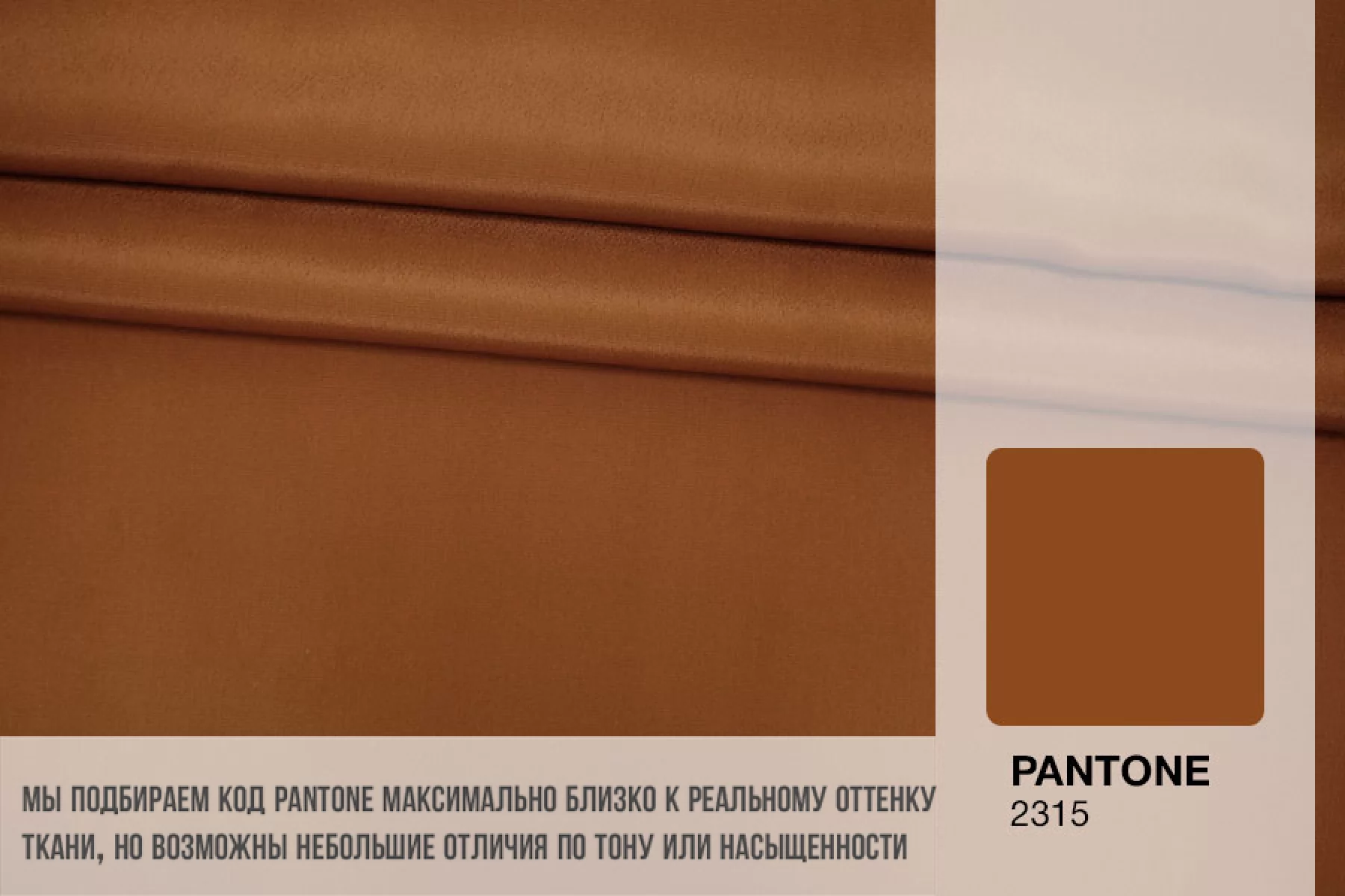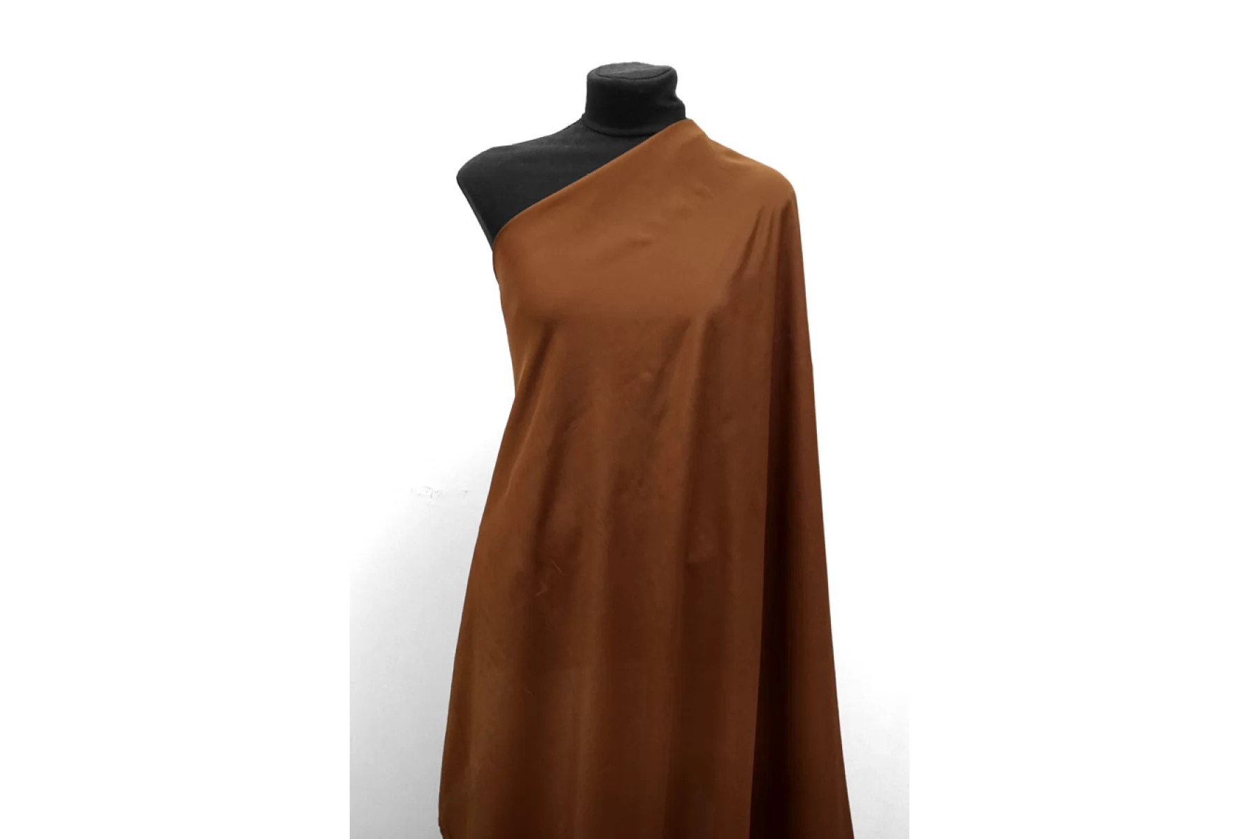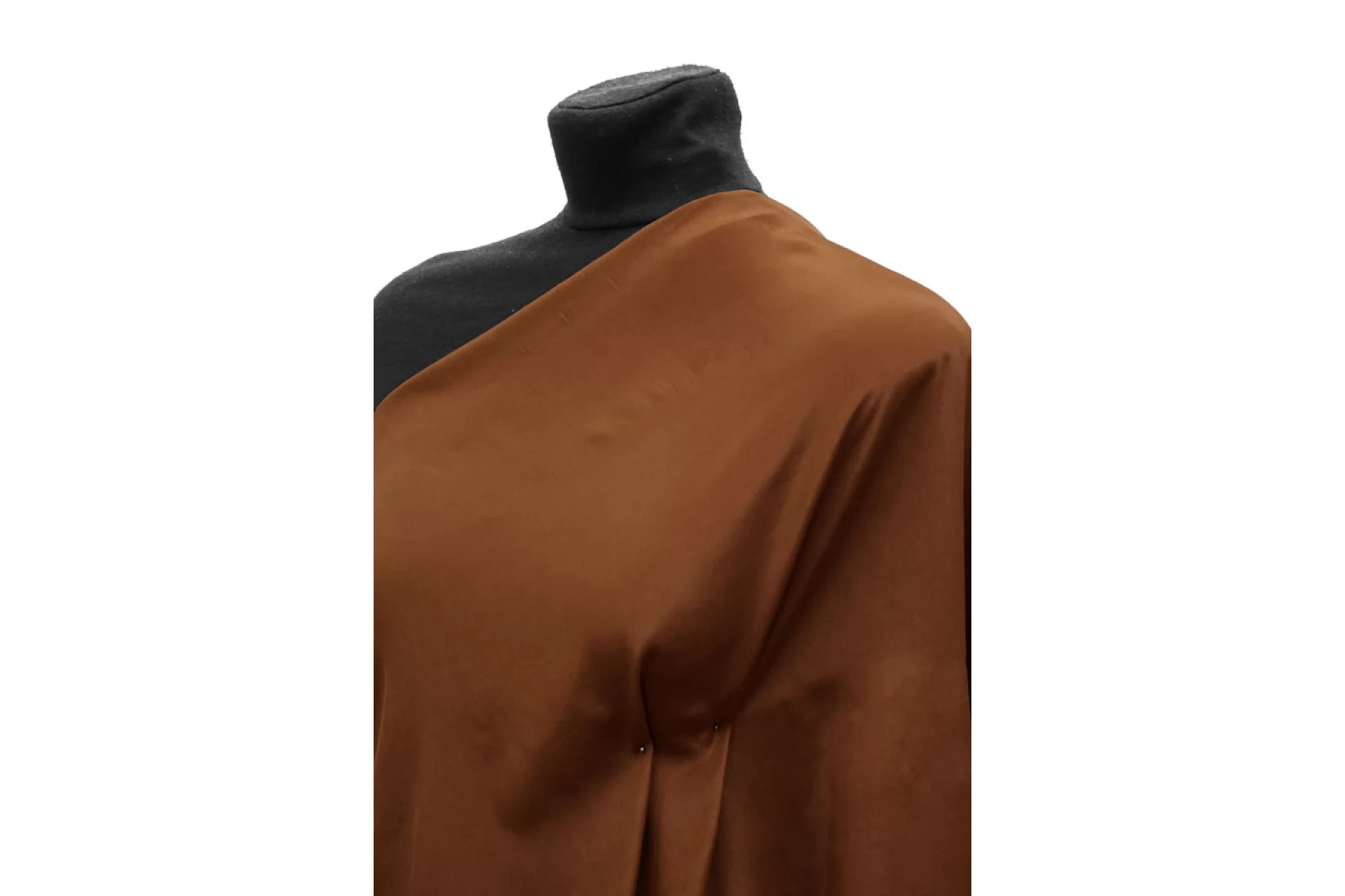 Плательно-блузочный по плотности, крепдешин из шёлка с ацетатом в красивом, коричном оттенке коричневого. Присутствует муарный эффект. Тактильно слегка шероховатый, легкий и воздушный. Не тянется. Красив в своей пластике и в складках. Немного просвечивает в один слой. Отлично подойдет на платья, юбки, туники и блузки. Уход - деликатный.