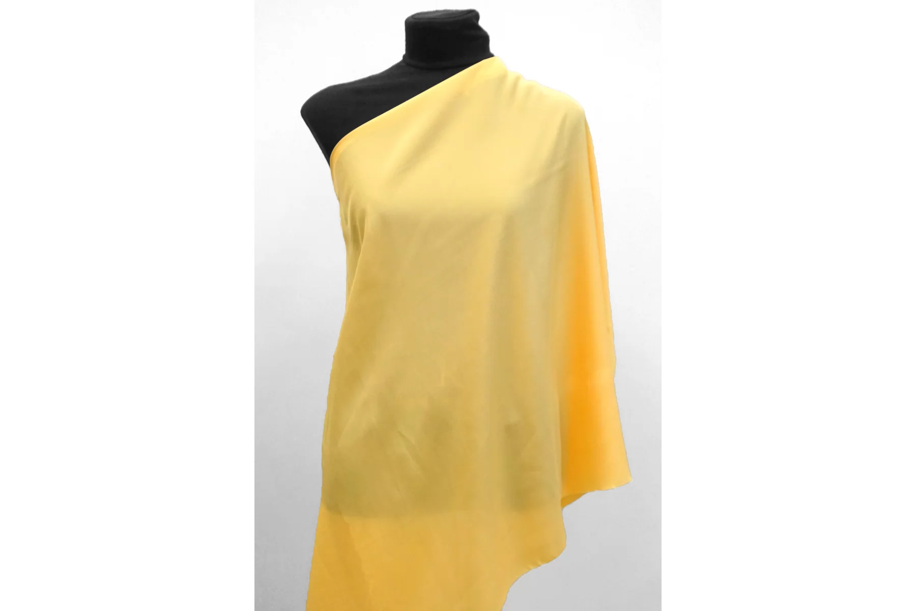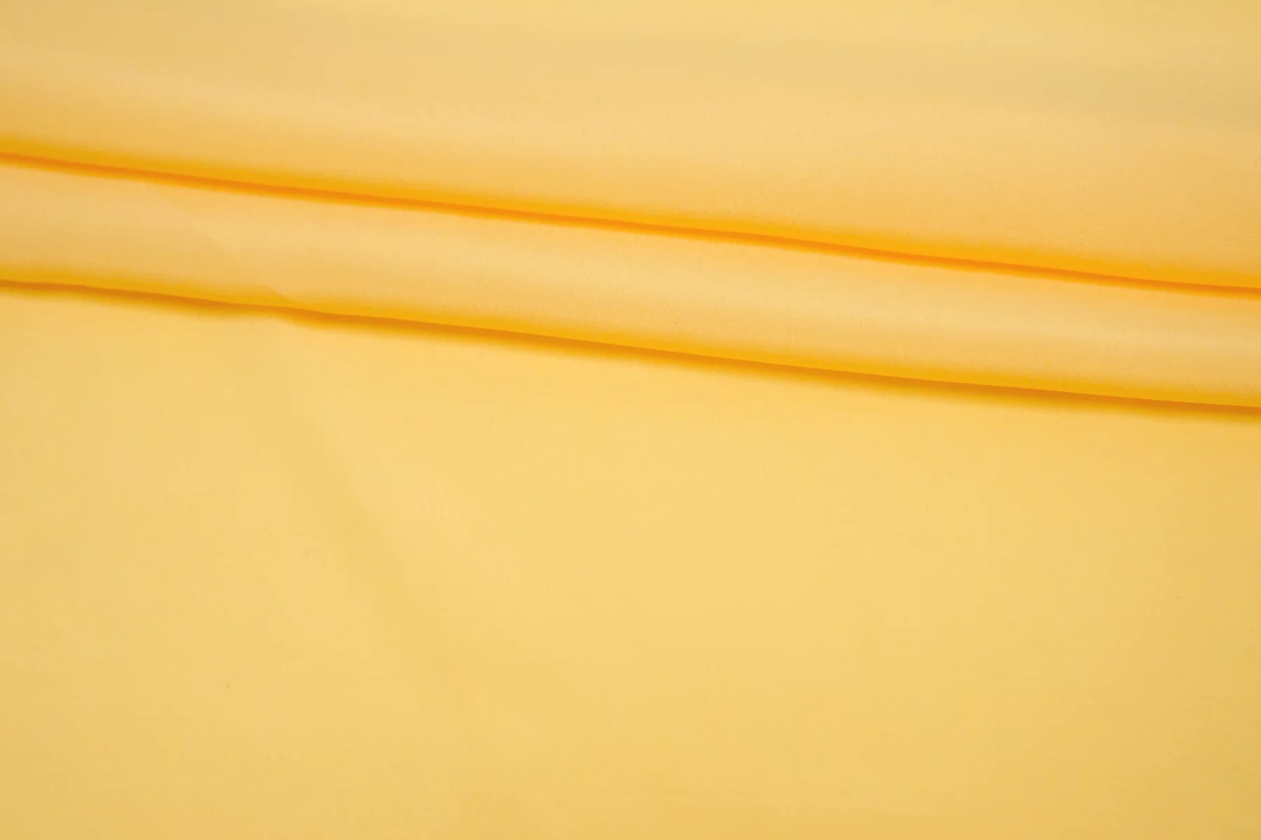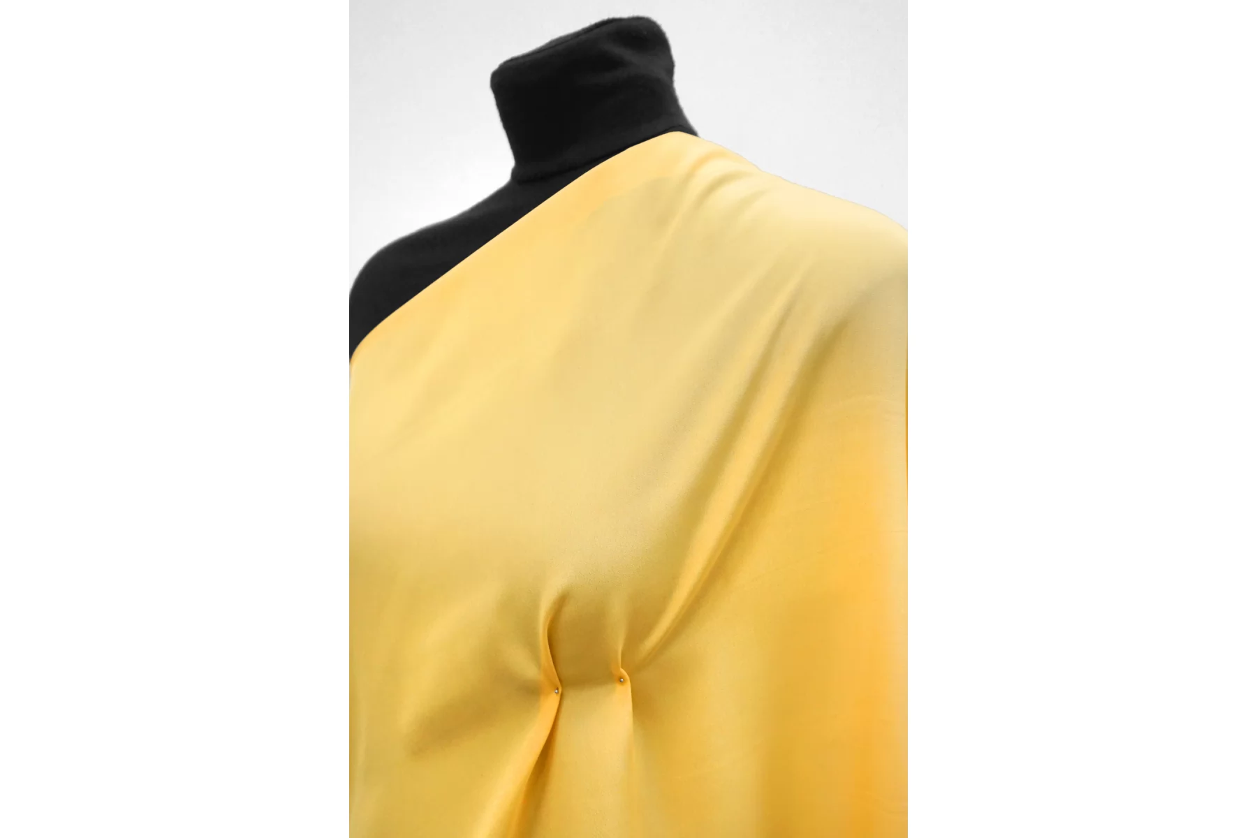 Плательно-блузочный по плотности, крепдешин из шёлка с ацетатом в красивом, насыщенном но при этом нежном, тёплом жёлтом оттенке. Присутствует муарный эффект. Тактильно слегка шероховатый, легкий и воздушный. Не тянется. Красив в своей пластике и в складках. Немного просвечивает. Отлично подойдет на платья, юбки, туники и блузки. Уход - деликатный.