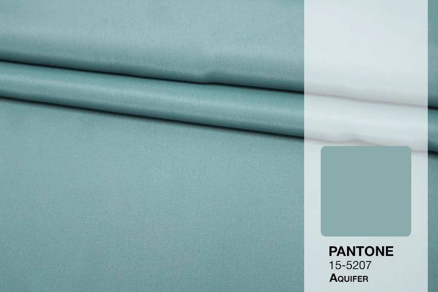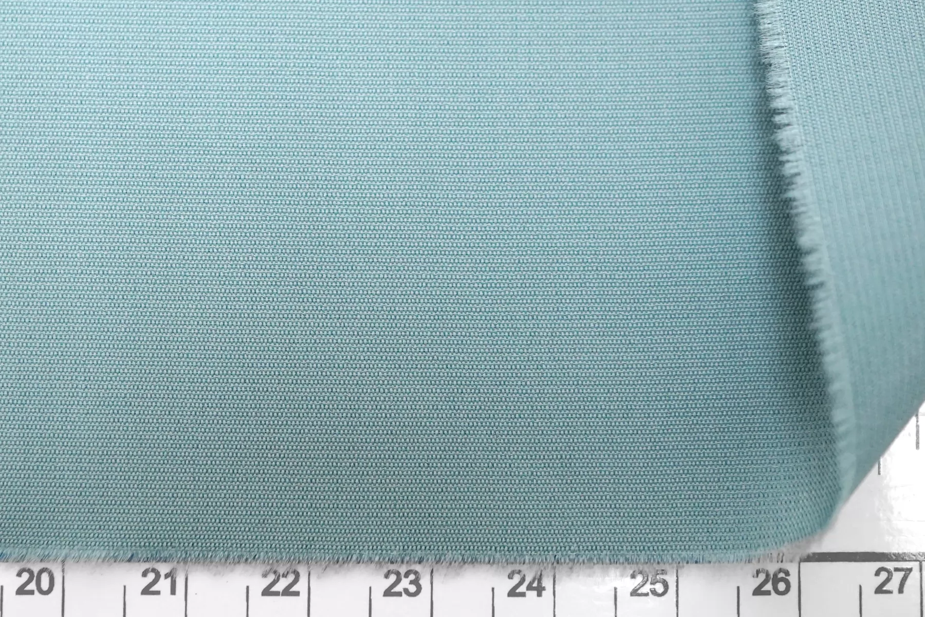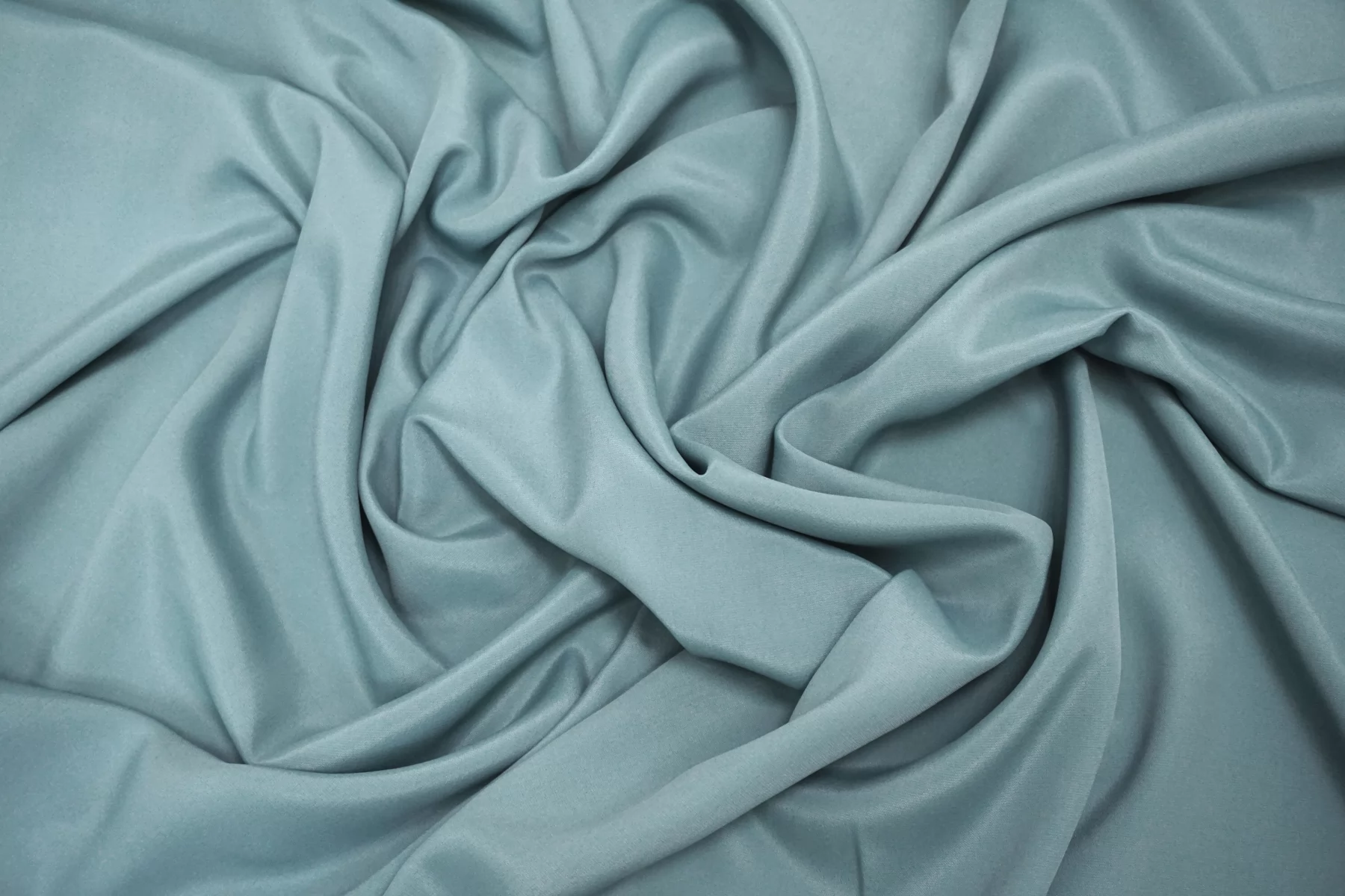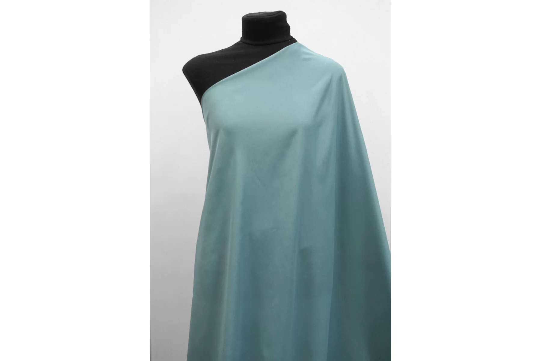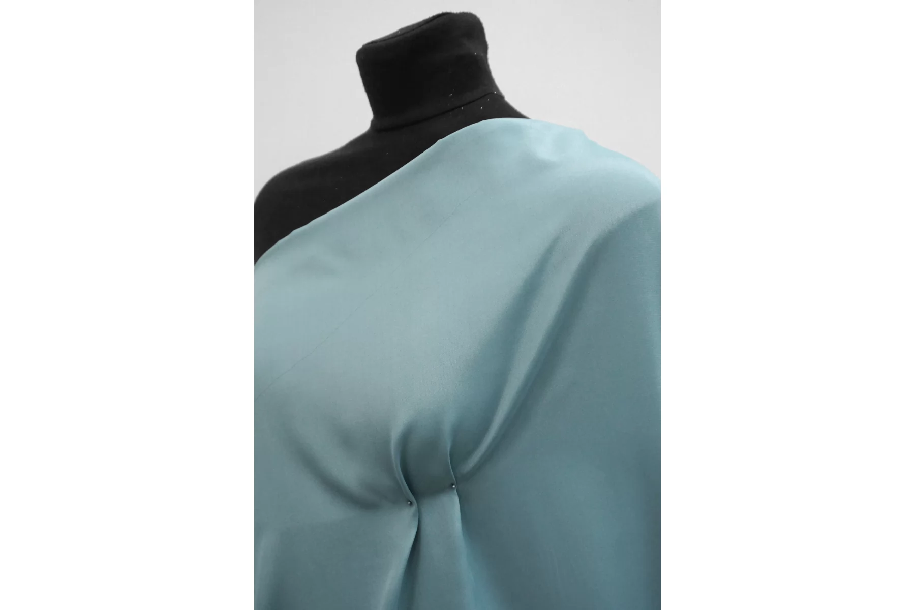 Плательно-блузочный по плотности, крепдешин из шёлка с ацетатом в красивом, приглушённом мятно-голубом оттенке. Присутствует муарный эффект. Тактильно слегка шероховатый, легкий и воздушный. Не тянется. Красив в своей пластике и в складках. Немного просвечивает в один слой. Отлично подойдет на платья, юбки, туники и блузки. Уход - деликатный.