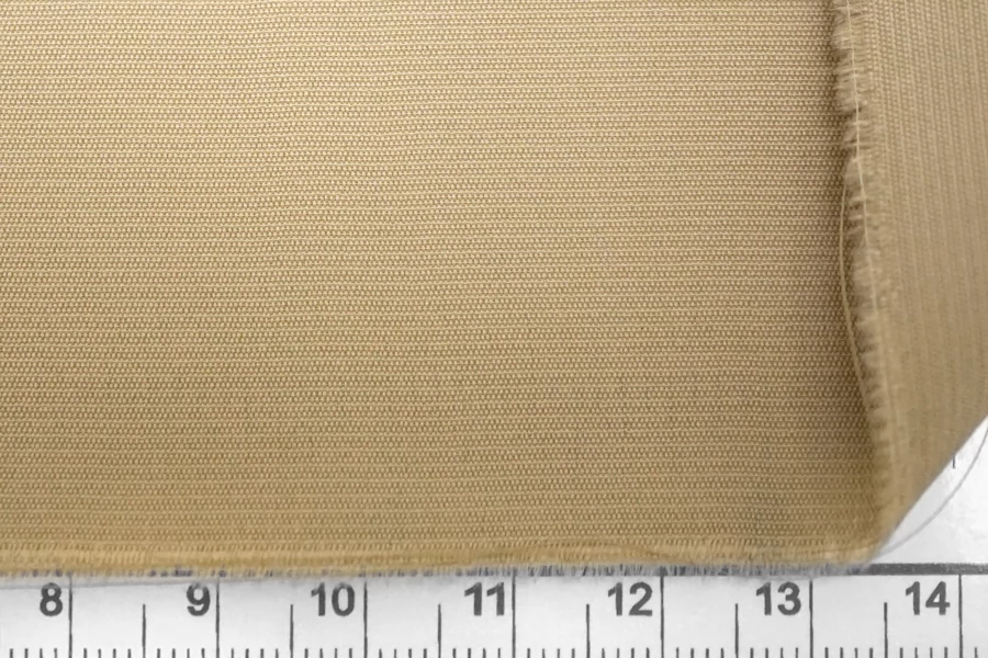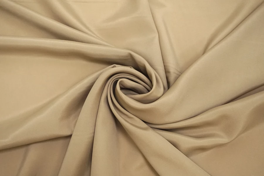Плательно-блузочный по плотности, крепдешин из шёлка с ацетатом в приглушённом, чуть сероватом оттенке бежевого (тёплый, с желтинкой). Тактильно слегка шероховатый, легкий и воздушный. Не тянется. Красив в своей пластике и в складках. Немного просвечивает в один слой. Отлично подойдет на платья, юбки, туники и блузки. Можно использовать в качестве нижнего платья под просвечивающие материалы (но учитывайте что темнее кожи на несколько тонов). Уход - деликатный.