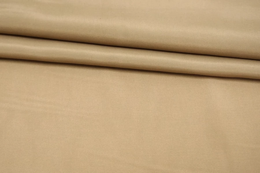 Плательно-блузочный по плотности, крепдешин из шёлка с ацетатом в приглушённом, чуть сероватом оттенке бежевого (тёплый, с желтинкой). Тактильно приятный, скользящий, легкий и воздушный. Не тянется. Красив в своей пластике и в складках. Немного просвечивает в один слой. Отлично подойдет на платья, юбки, туники и блузки. Можно использовать в качестве нижнего платья под просвечивающие материалы (но учитывайте что темнее кожи на несколько тонов). Уход - деликатный.