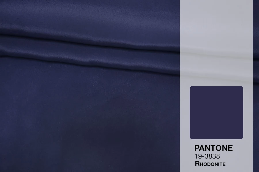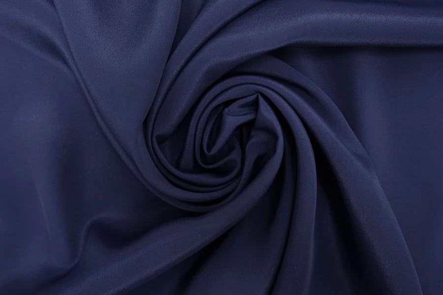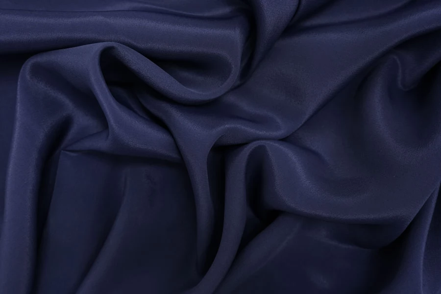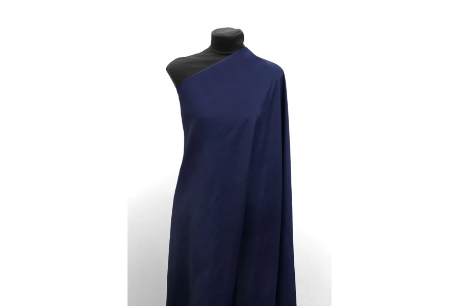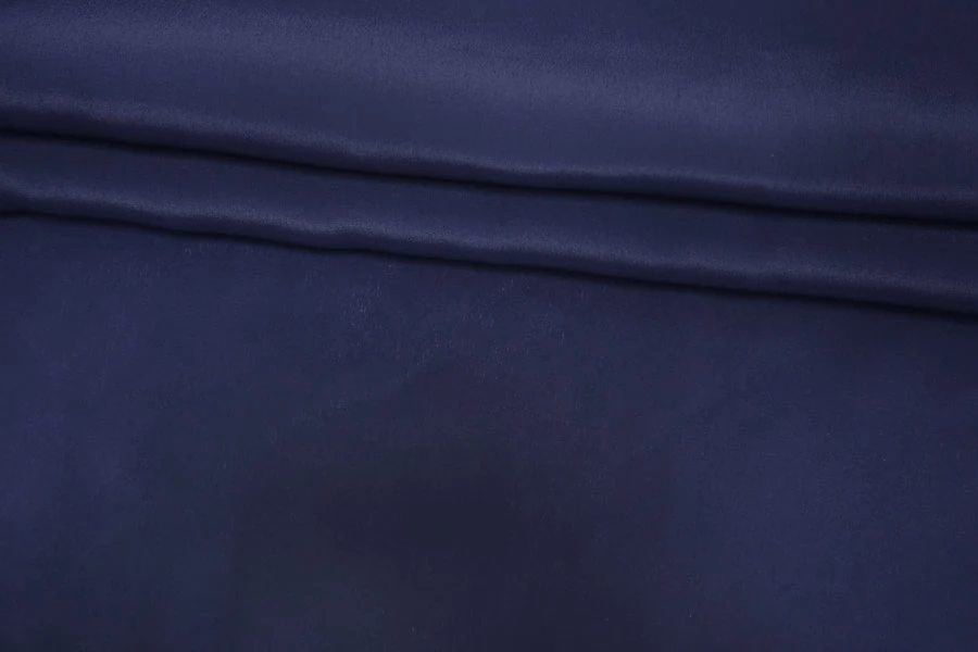 Плательно-блузочный по плотности, крепдешин из шёлка с ацетатом в красивом, приглушённом синем цвете с лёгким фиолетовым подтоном. Присутствует муарный эффект. Тактильно слегка шероховатый, легкий и воздушный. Не тянется. Красив в своей пластике и в складках. Немного просвечивает в один слой. Отлично подойдет на платья, юбки, туники и блузки. Уход - деликатный.
