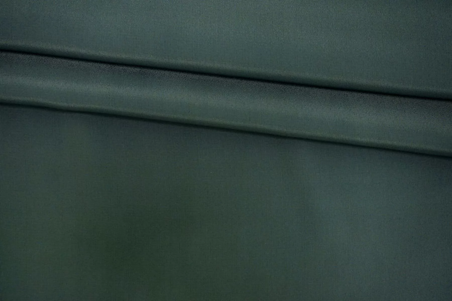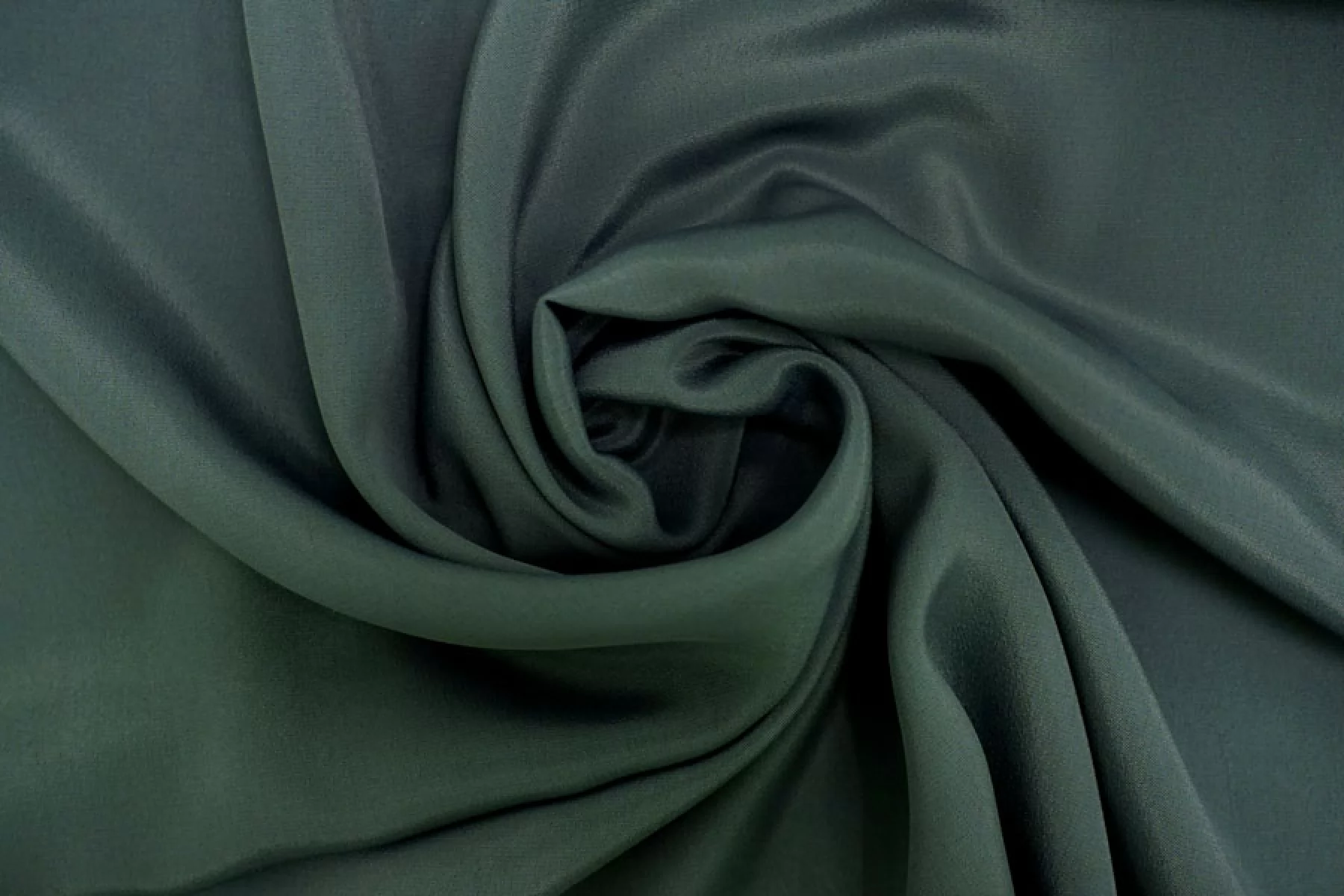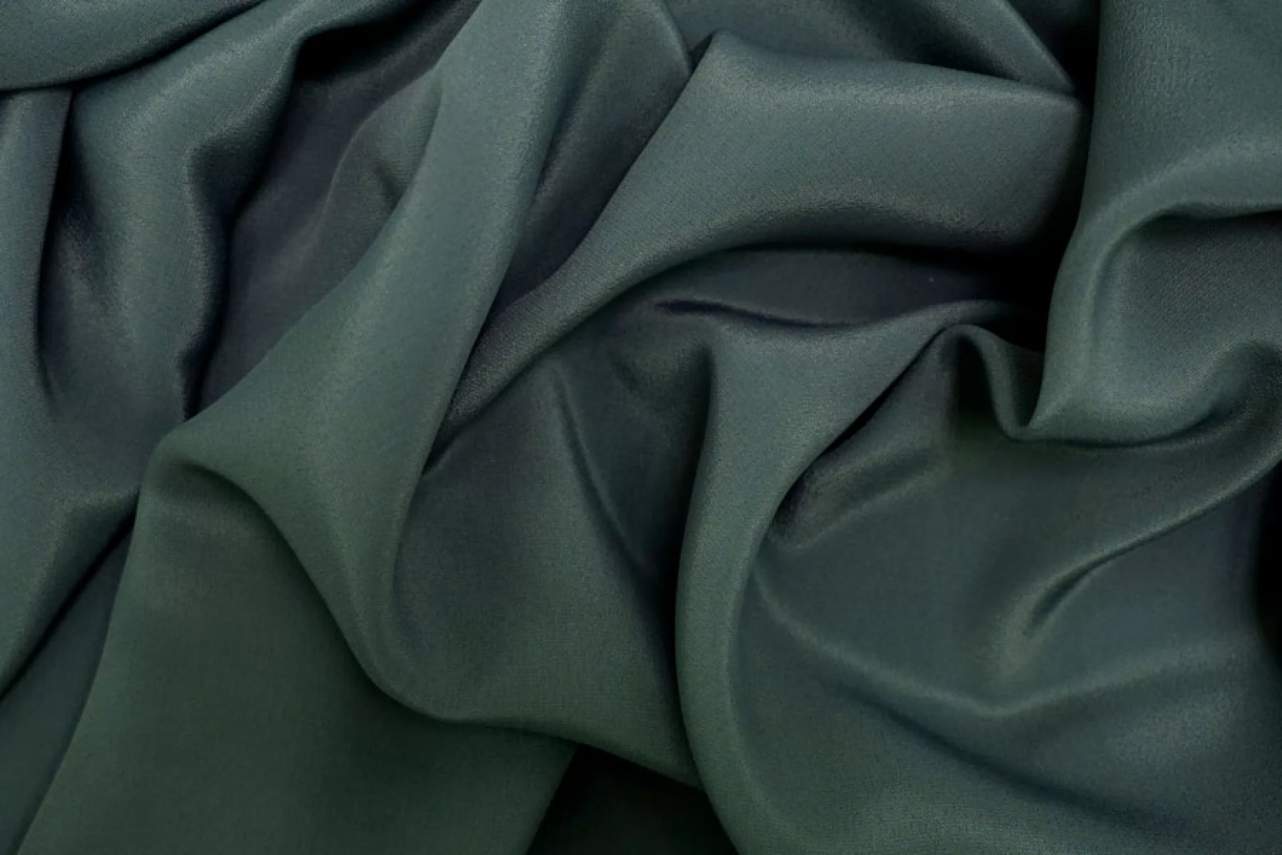 Плательно-блузочный по плотности, крепдешин из шёлка с ацетатом в тёмно-изумрудном, ненасыщенном цвете. Присутствует муарный эффект. Тактильно слегка шероховатый, легкий и воздушный. Не тянется. Красив в своей пластике и в складках. Немного просвечивает в один слой. Отлично подойдет на платья, юбки, туники и блузки. Уход - деликатный.