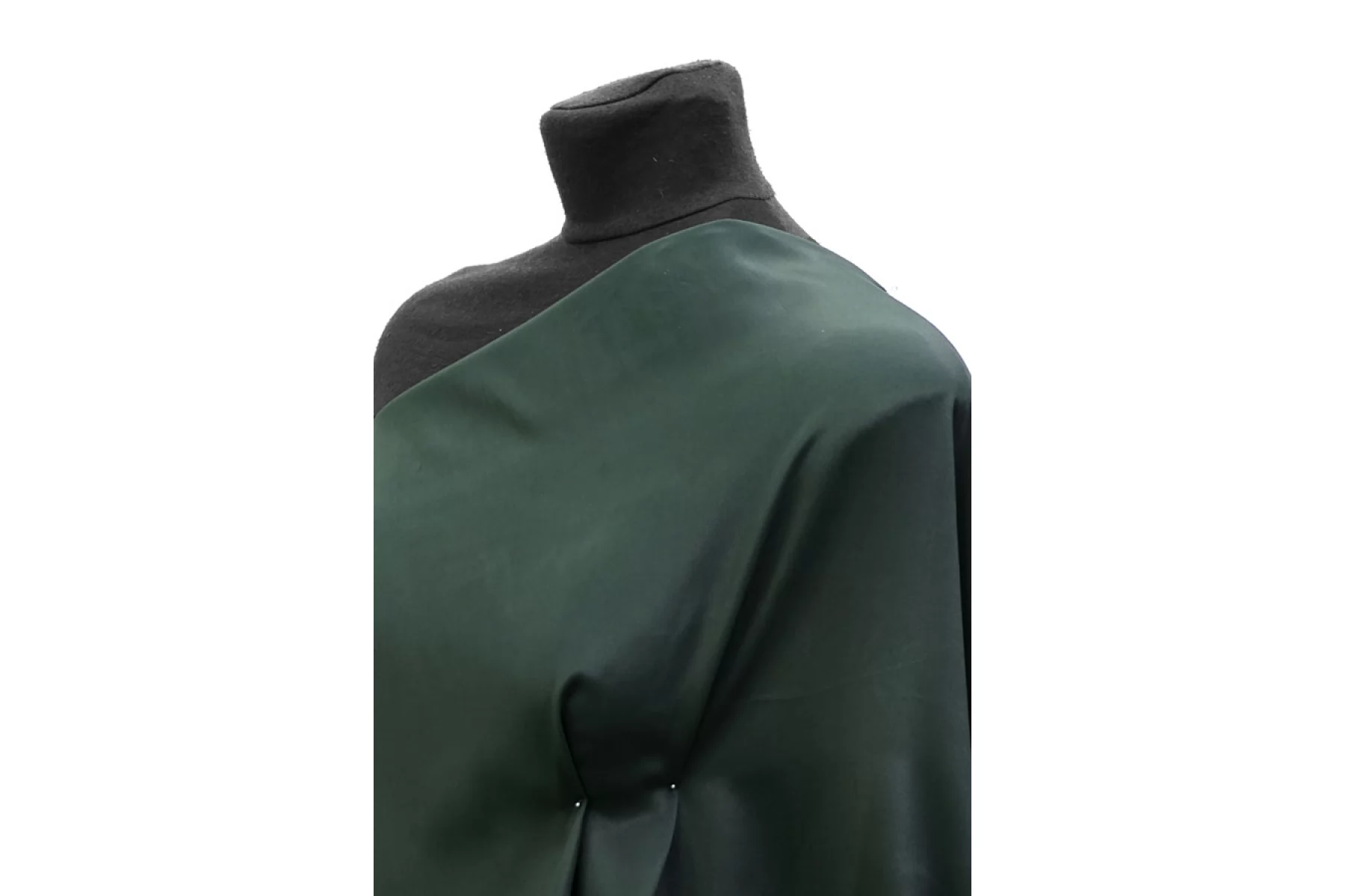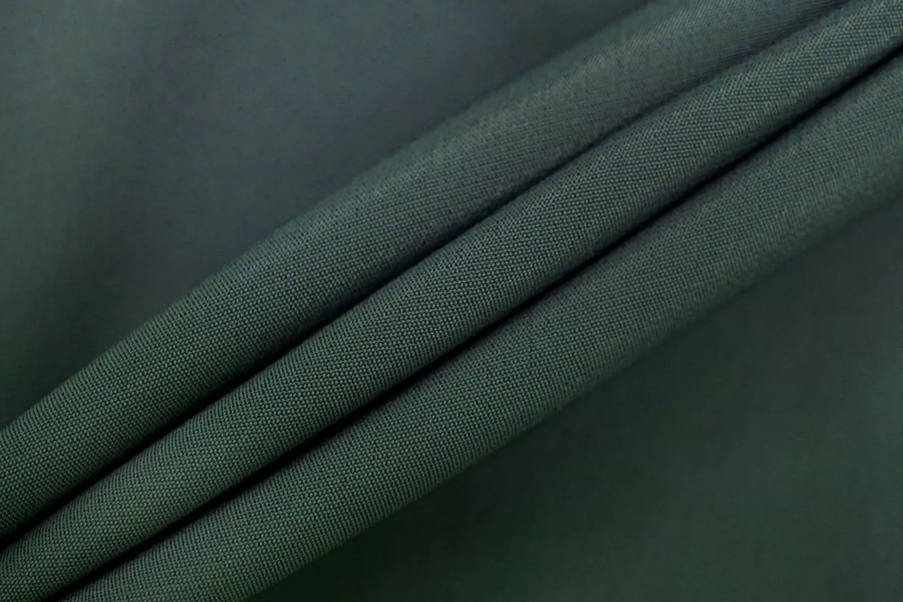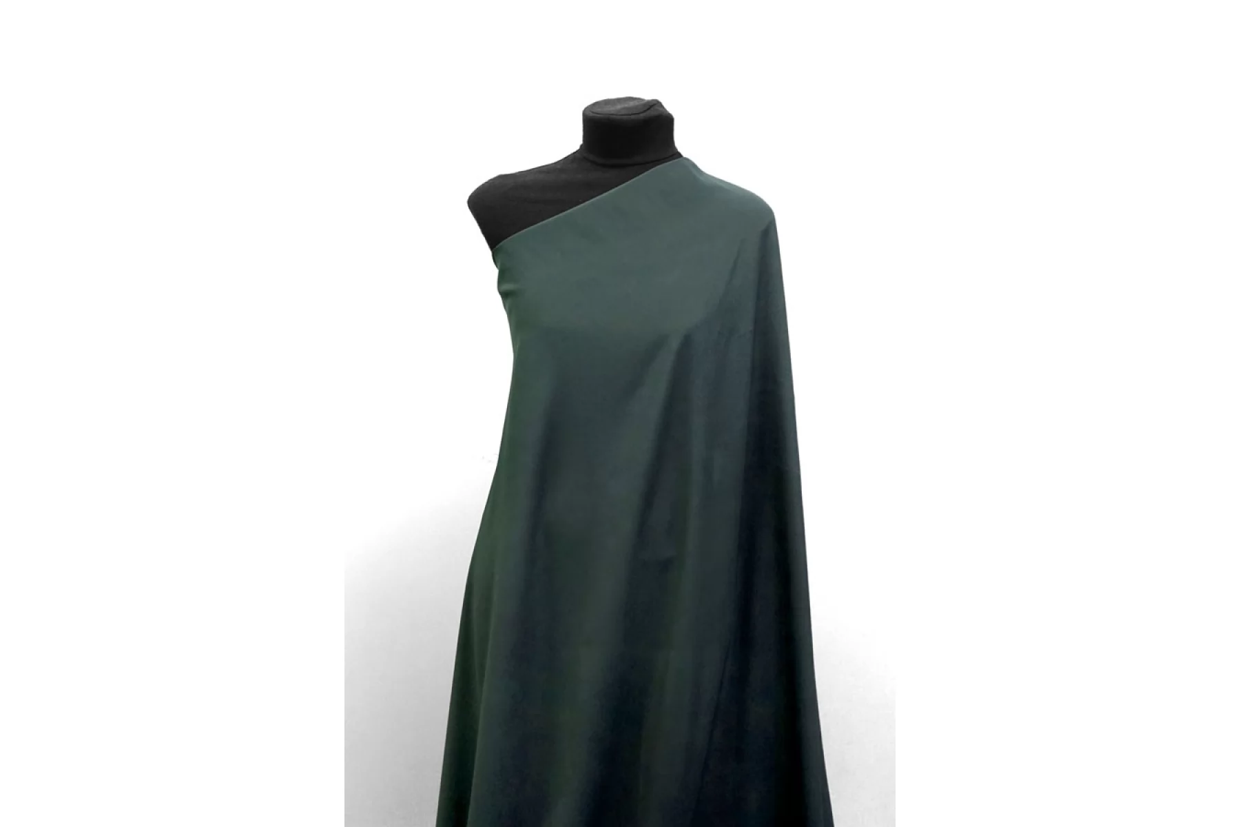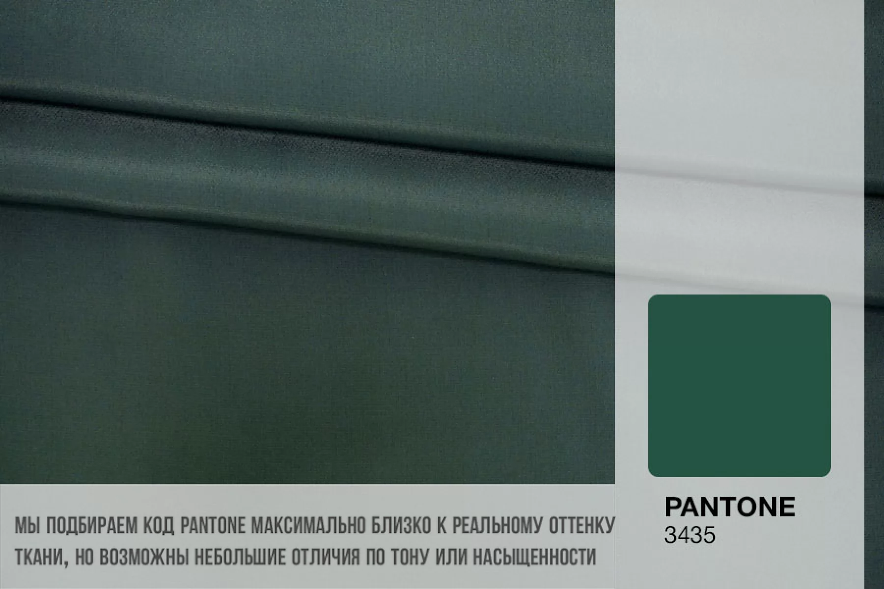 Плательно-блузочный по плотности, крепдешин из шёлка с ацетатом в тёмно-изумрудном, ненасыщенном цвете. Присутствует муарный эффект. Тактильно слегка шероховатый, легкий и воздушный. Не тянется. Красив в своей пластике и в складках. Немного просвечивает в один слой. Отлично подойдет на платья, юбки, туники и блузки. Уход - деликатный.