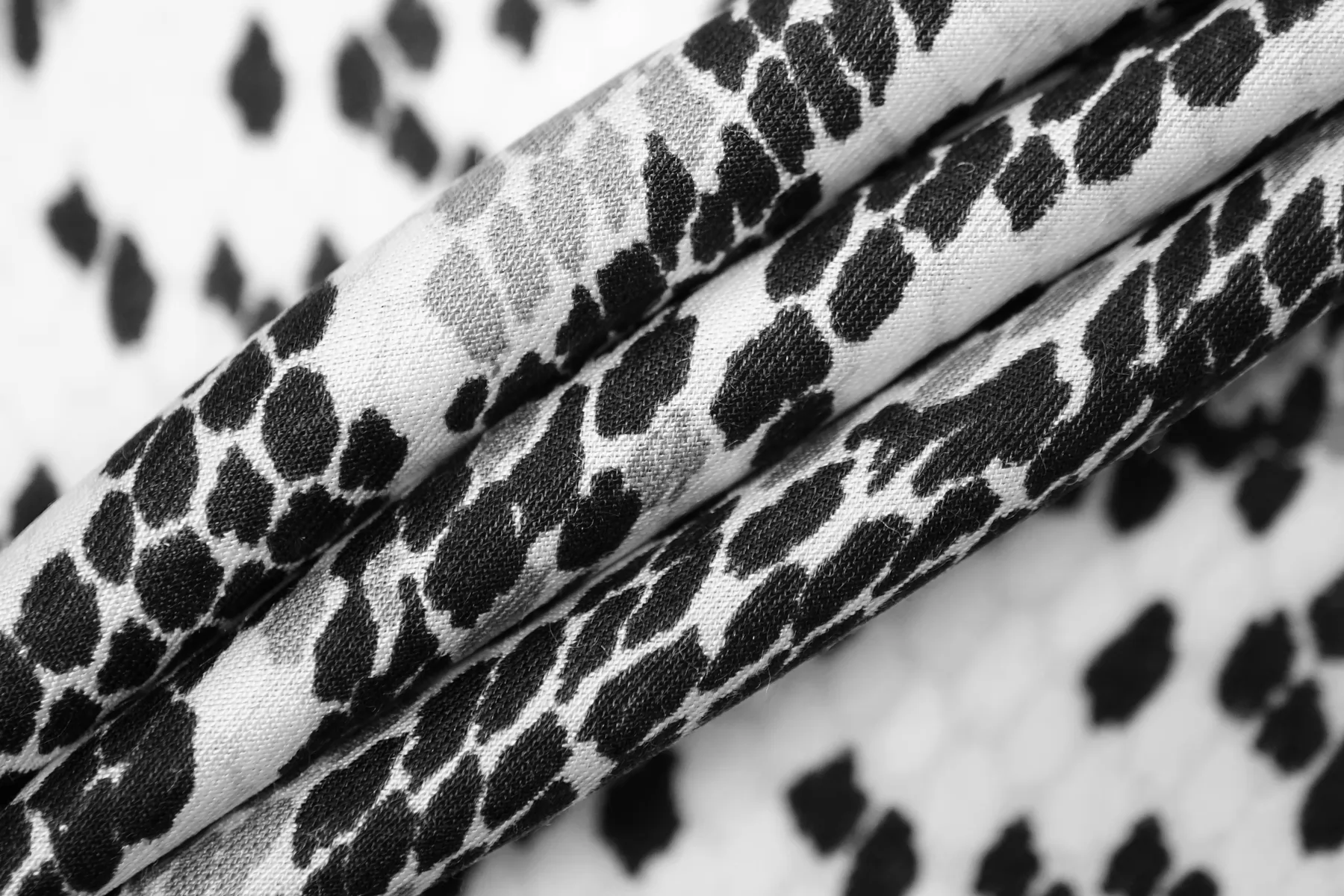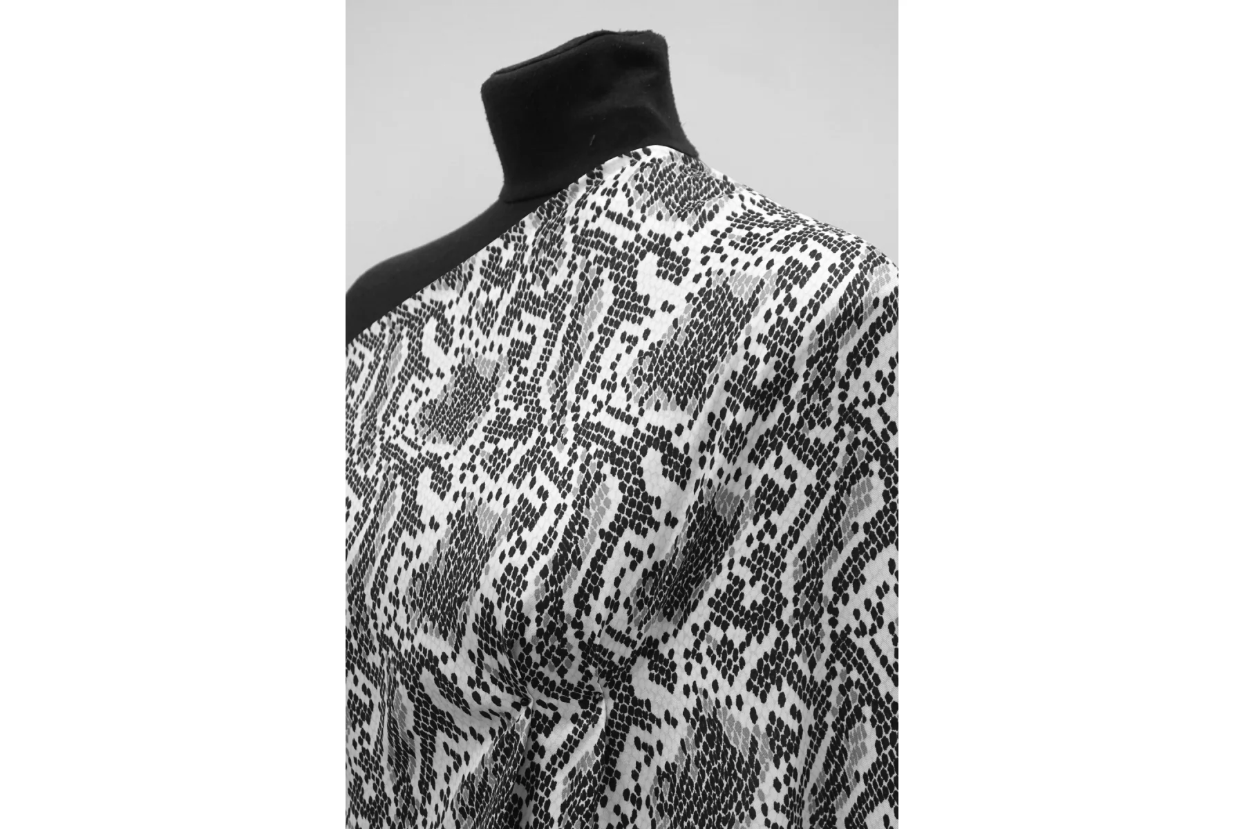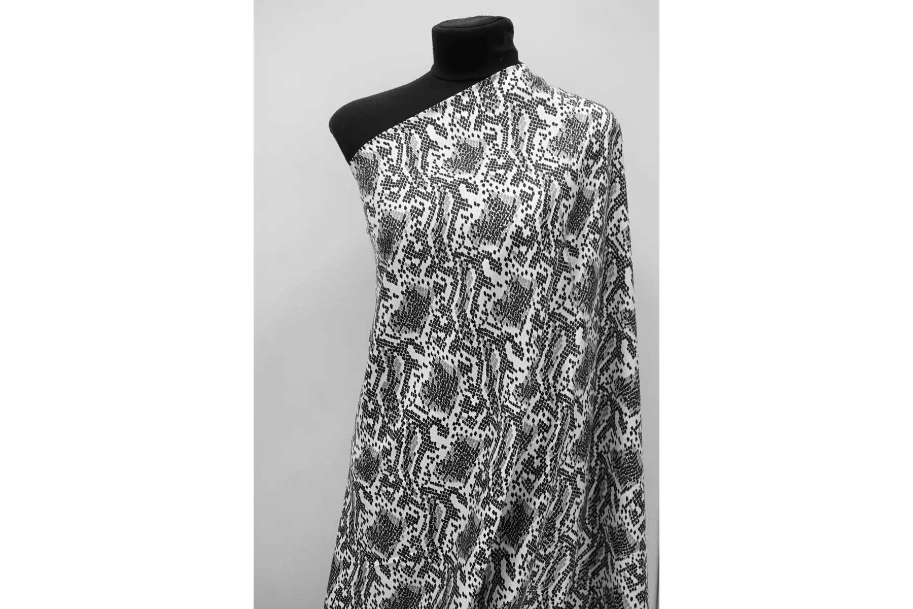Итальянский плательно-блузочный шёлк с вискозой со стилизованным принтом - узором рептилии в чёрно-бело-серой гамме. Плетение диагональное. Поверхность материала гладкая и скользящая, очень приятная тактильно. Не тянется. Струится. Просвечивает силуэт на просвет. Не мнется. Форму не держит, но красив в драпировке. Отличный вариант на летние платья, блузки и юбки. При необходимости используйте подкладочный материал. Уход, как и за любым шелком, деликатный.