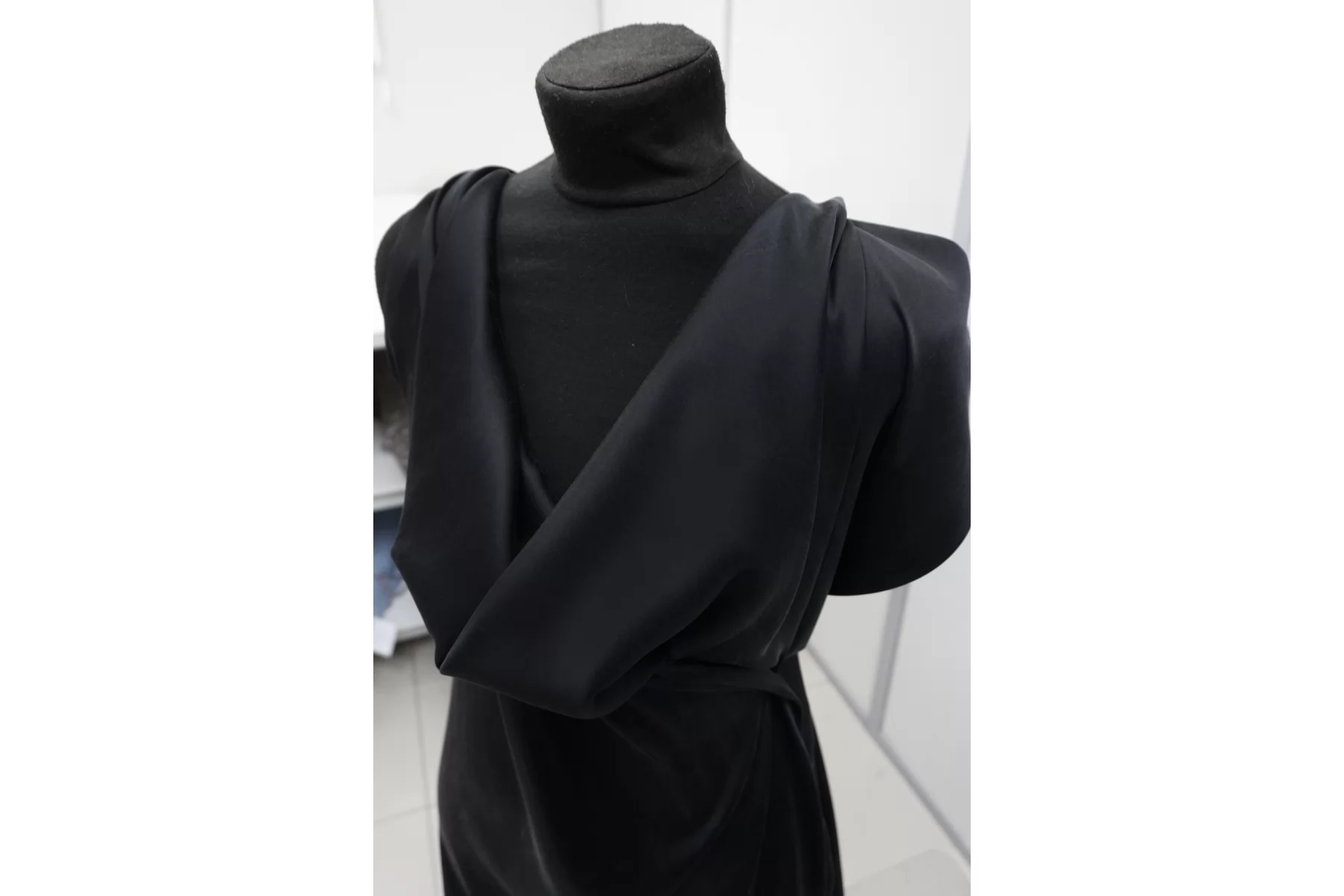 Прекрасный вареный шёлк в очень тёмном синем цвете. Очень приятный и мягкий, шелковистый. Тонкий (но плотный), пластичный, струящийся, легкий. Обладает мягким лоском. С характерным для варёного шёлка белёсым отливом. Упруго тянется. Не просвечивает. Немного мнется. Форму не держит, очень красиво смотрится в драпировке. Прекрасный вариант для пошива нарядного платья, юбки, топа, кимоно, струящихся брюк. Уход за шелком деликатный. При необходимости используйте подкладочный материал.