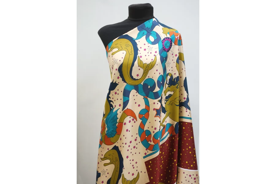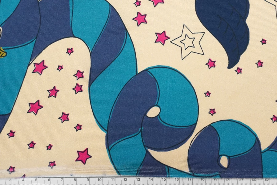 ВНИМАНИЕ! Ткань продаётся по купонам, длина купона 87 см, цена за купон -4 440 руб. Твиловый шёлк от Max Mara с ярким фантазийным принтом в виде морских коньков. Очень приятный и мягкий, гладкий. Достаточно плотный, пластичный, струящийся, легкий. Обладает красивым шелковым лоском. Не тянется. Не просвечивает. Не мнется. Форму не держит, но красиво смотрится в драпировке. Прекрасный легкий вариант на блузки, платья и юбки. Уход за шёлком деликатный.