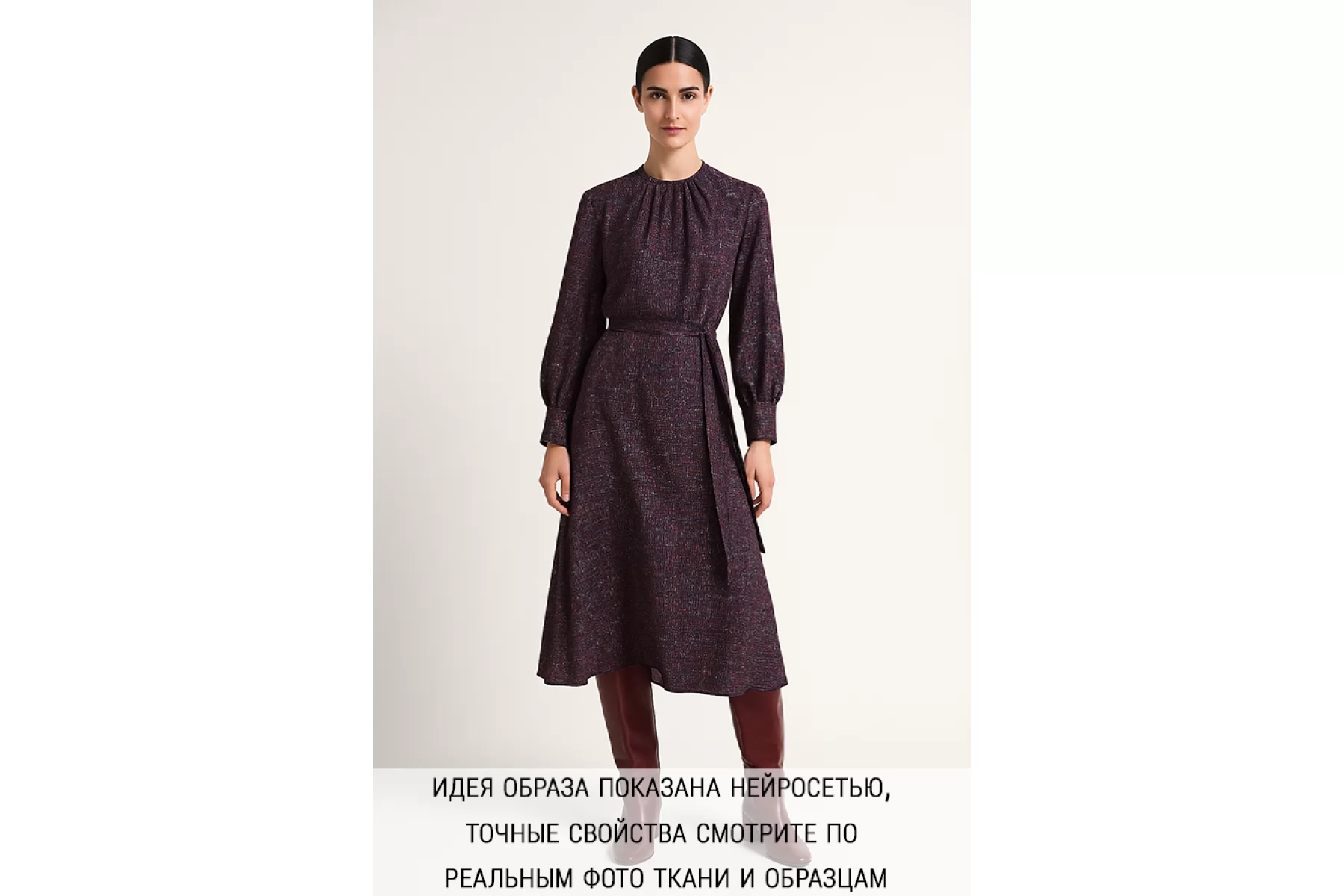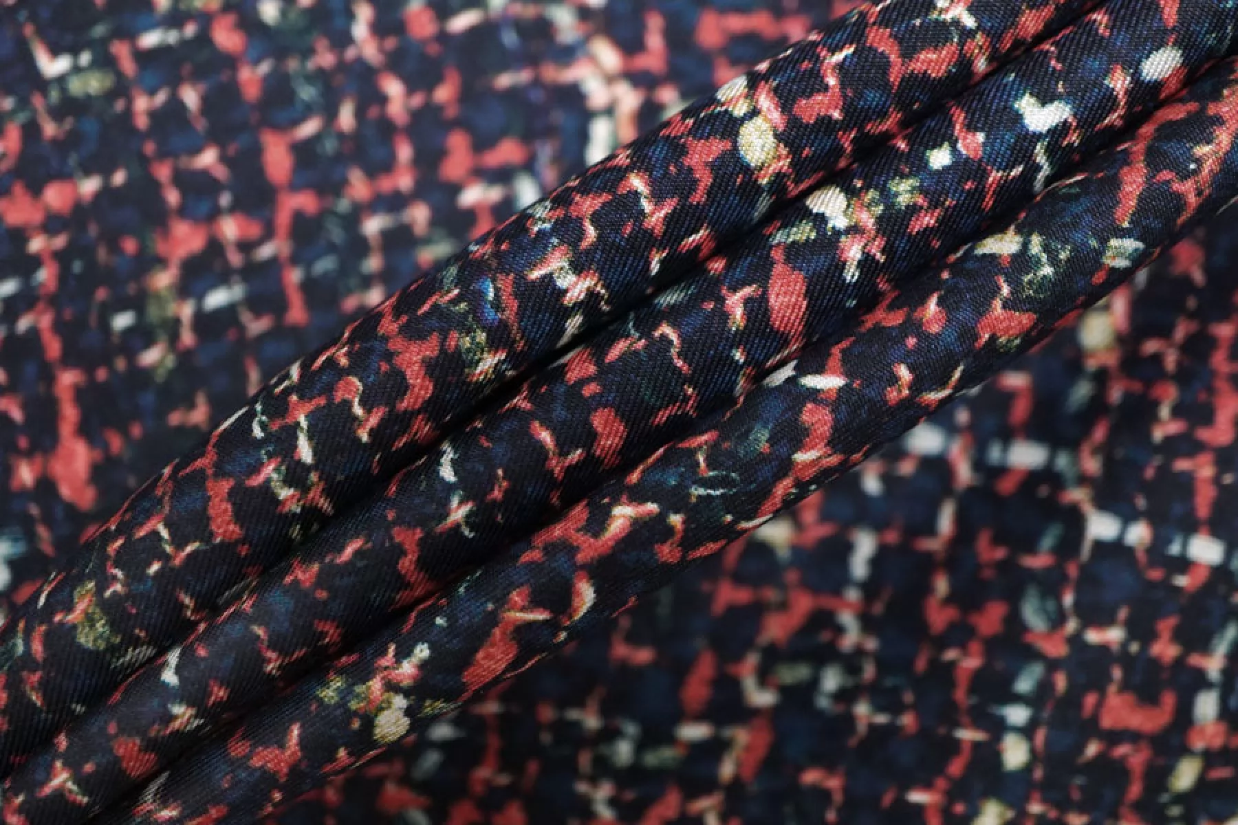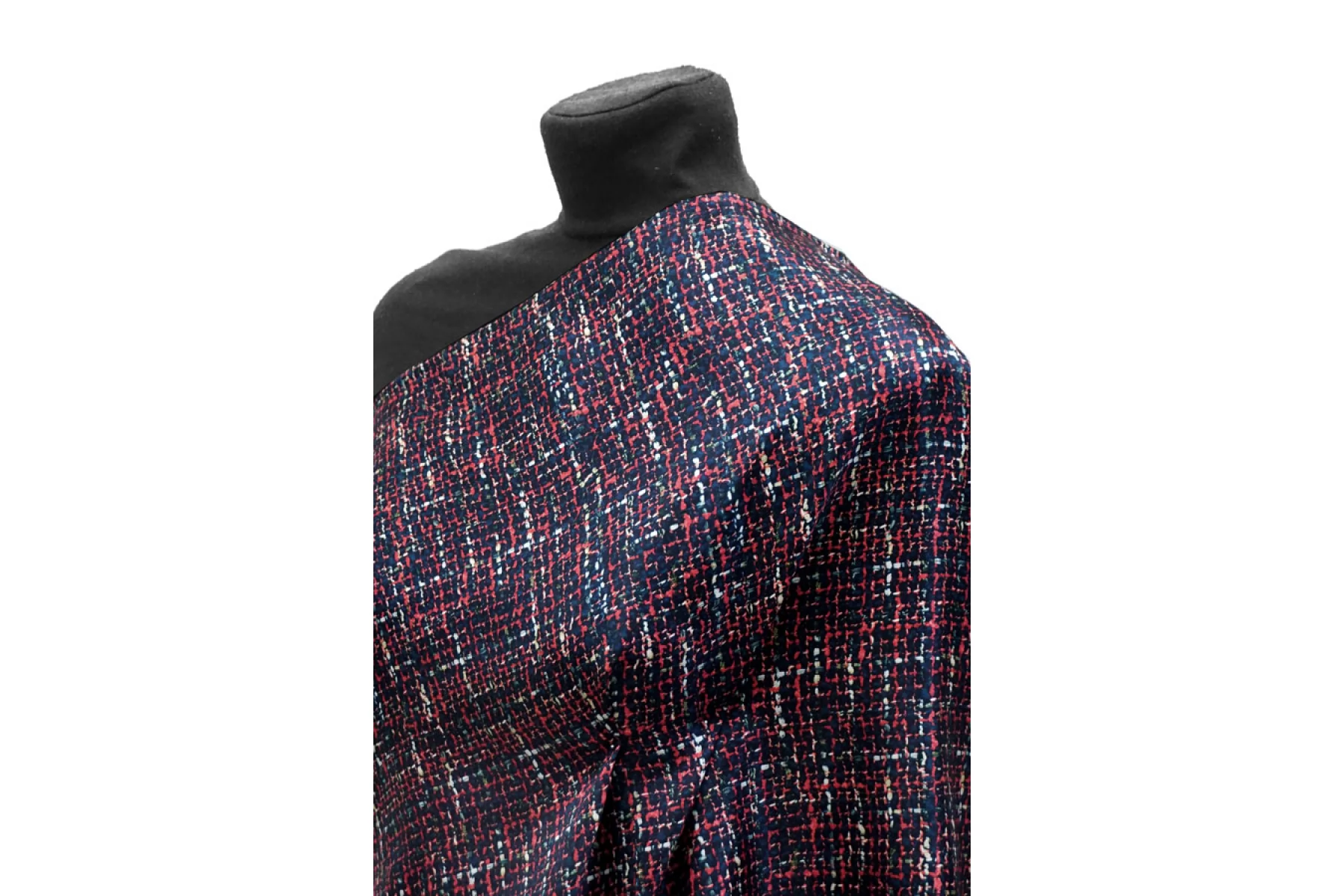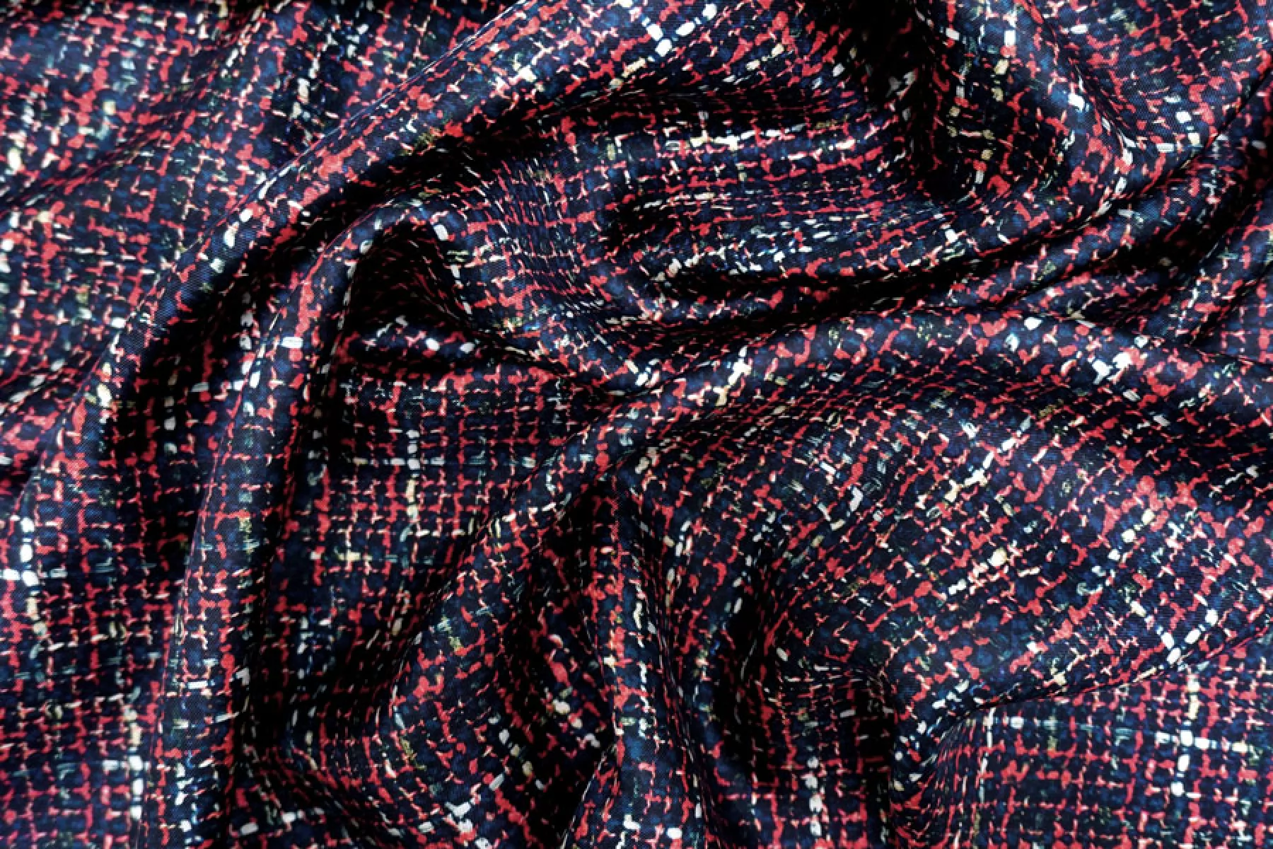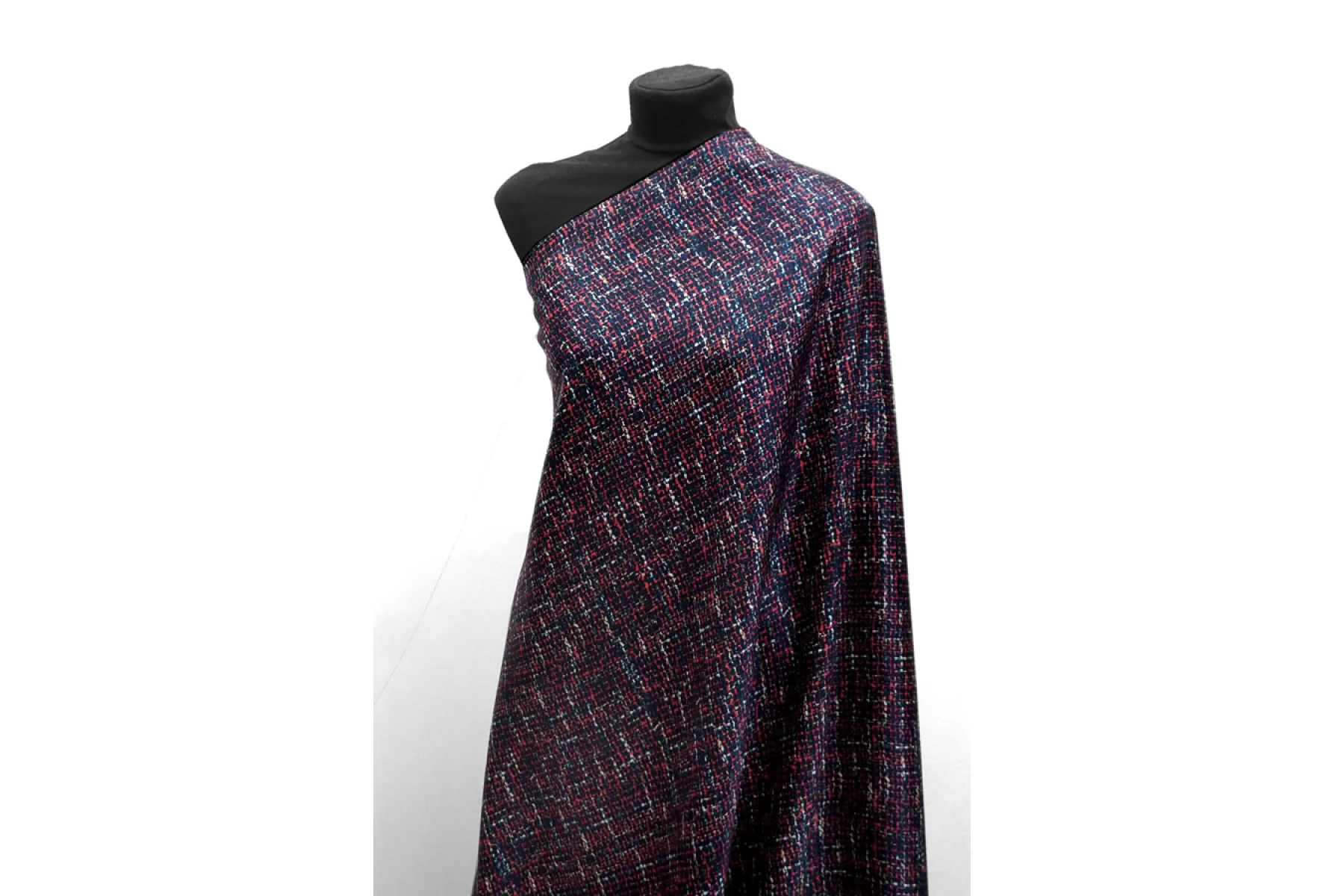 Твиловый шёлк с интересным принтом: в виде толстых нитей как у твида-шанель, сочетание синего, ягодного, чёрного, зелёного и белого цвета. Очень приятный и мягкий, гладкий. Достаточно плотный, пластичный, струящийся, слегка шуршащий. Обладает красивым шелковым лоском. Не тянется. Не просвечивает. Мнется слабо. Форму не держит, но красиво смотрится в драпировке. Прекрасный легкий вариант на блузки, платья и юбки. Уход за шёлком деликатный.