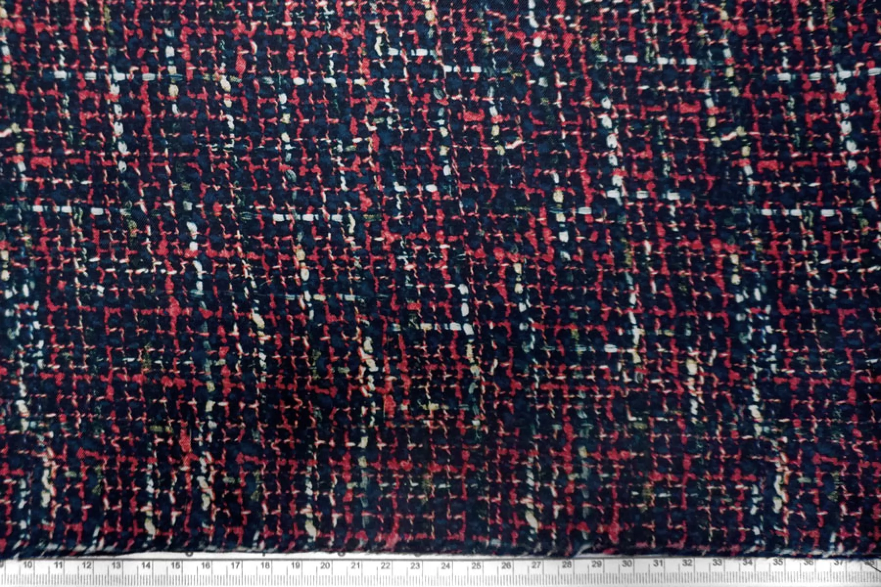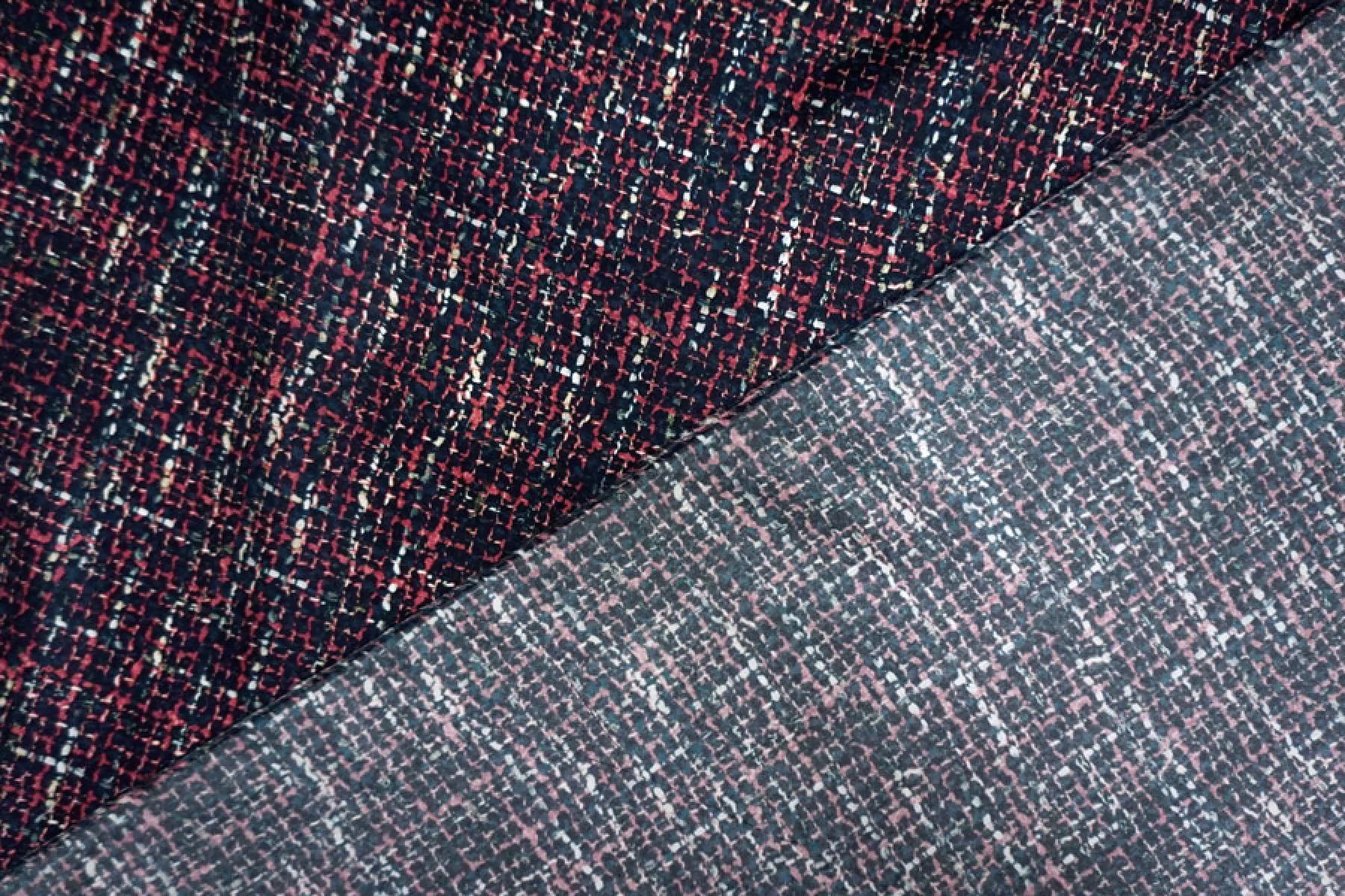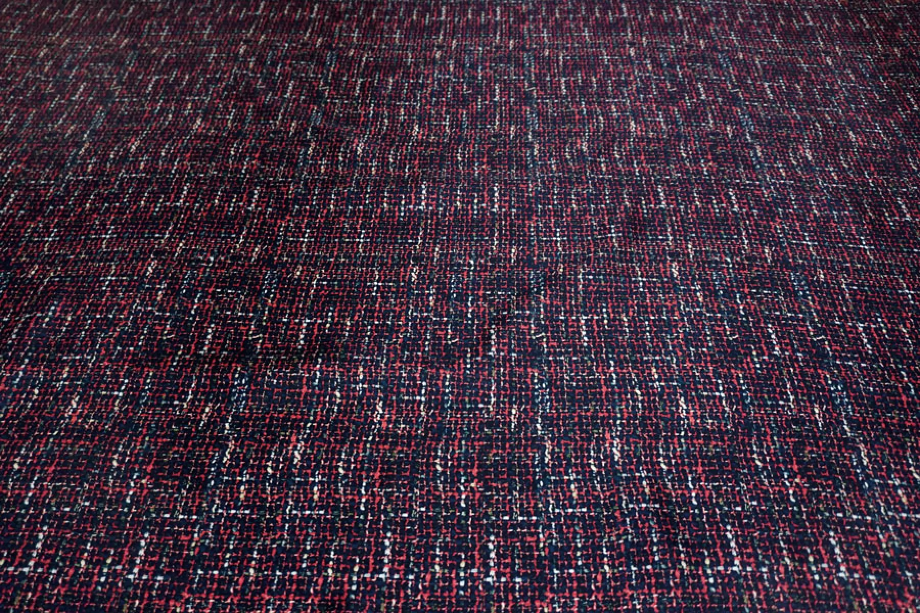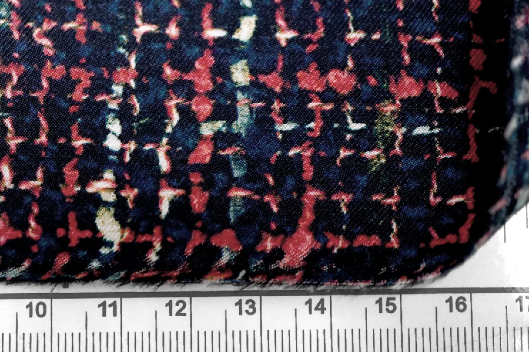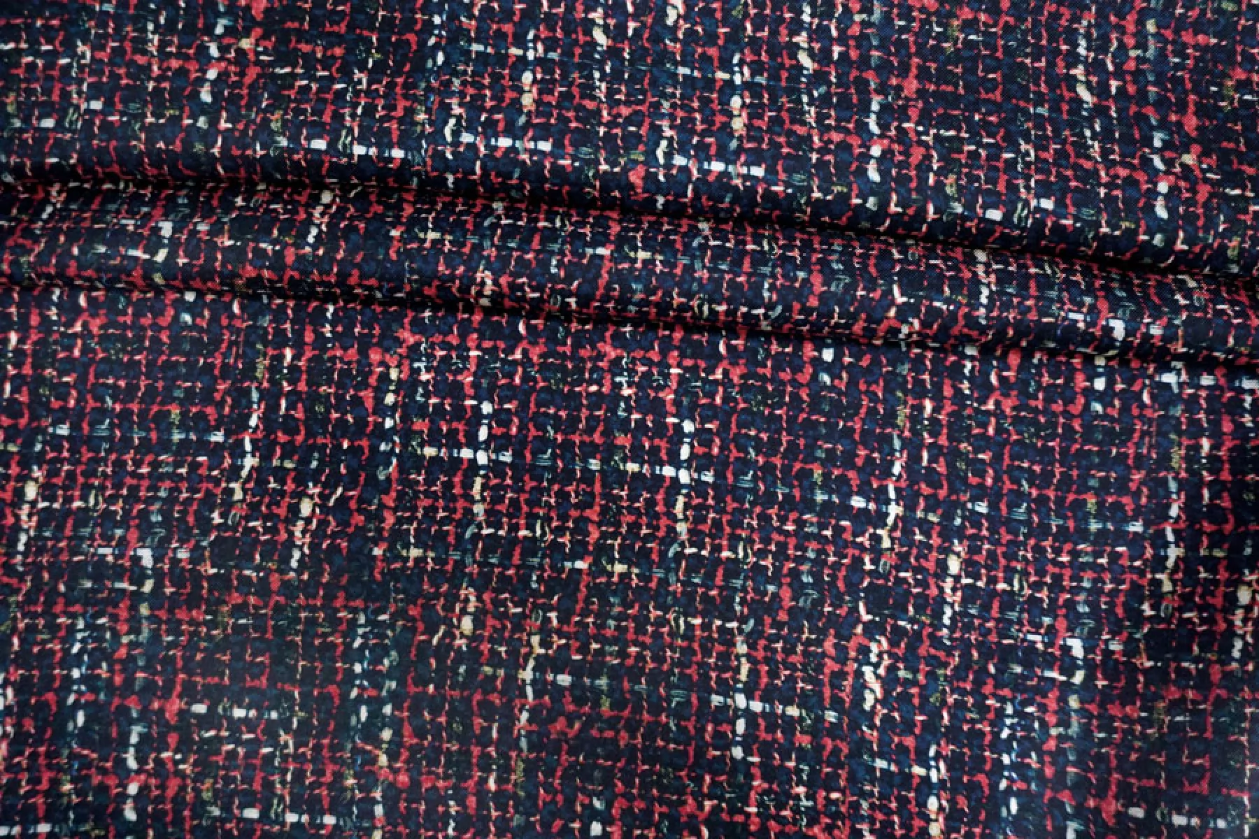 Твиловый шёлк с интересным принтом: в виде толстых нитей как у твида-шанель, сочетание синего, ягодного, чёрного, зелёного и белого цвета. Очень приятный и мягкий, гладкий. Достаточно плотный, пластичный, струящийся, слегка шуршащий. Обладает красивым шелковым лоском. Не тянется. Не просвечивает. Мнется слабо. Форму не держит, но красиво смотрится в драпировке. Прекрасный легкий вариант на блузки, платья и юбки. Уход за шёлком деликатный.