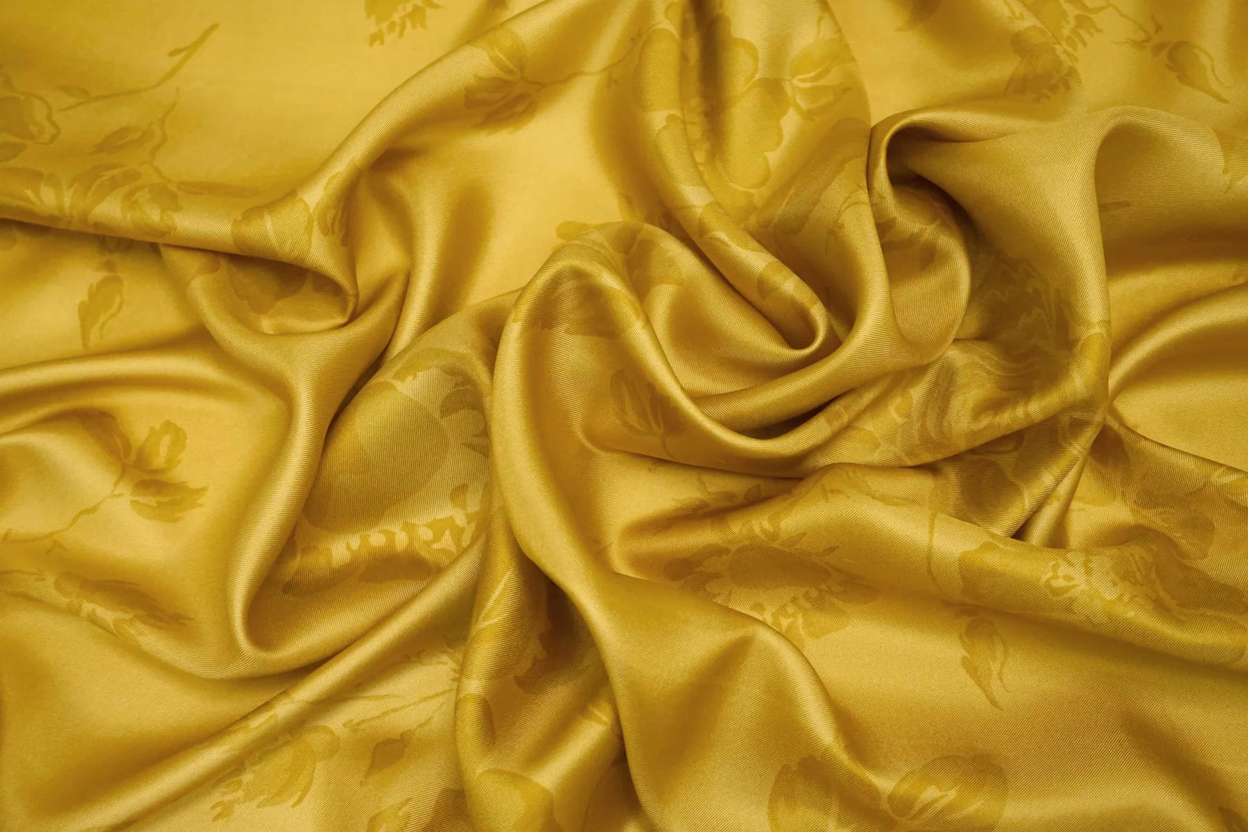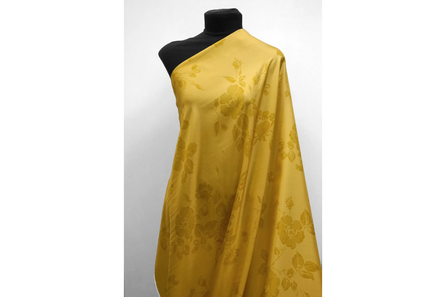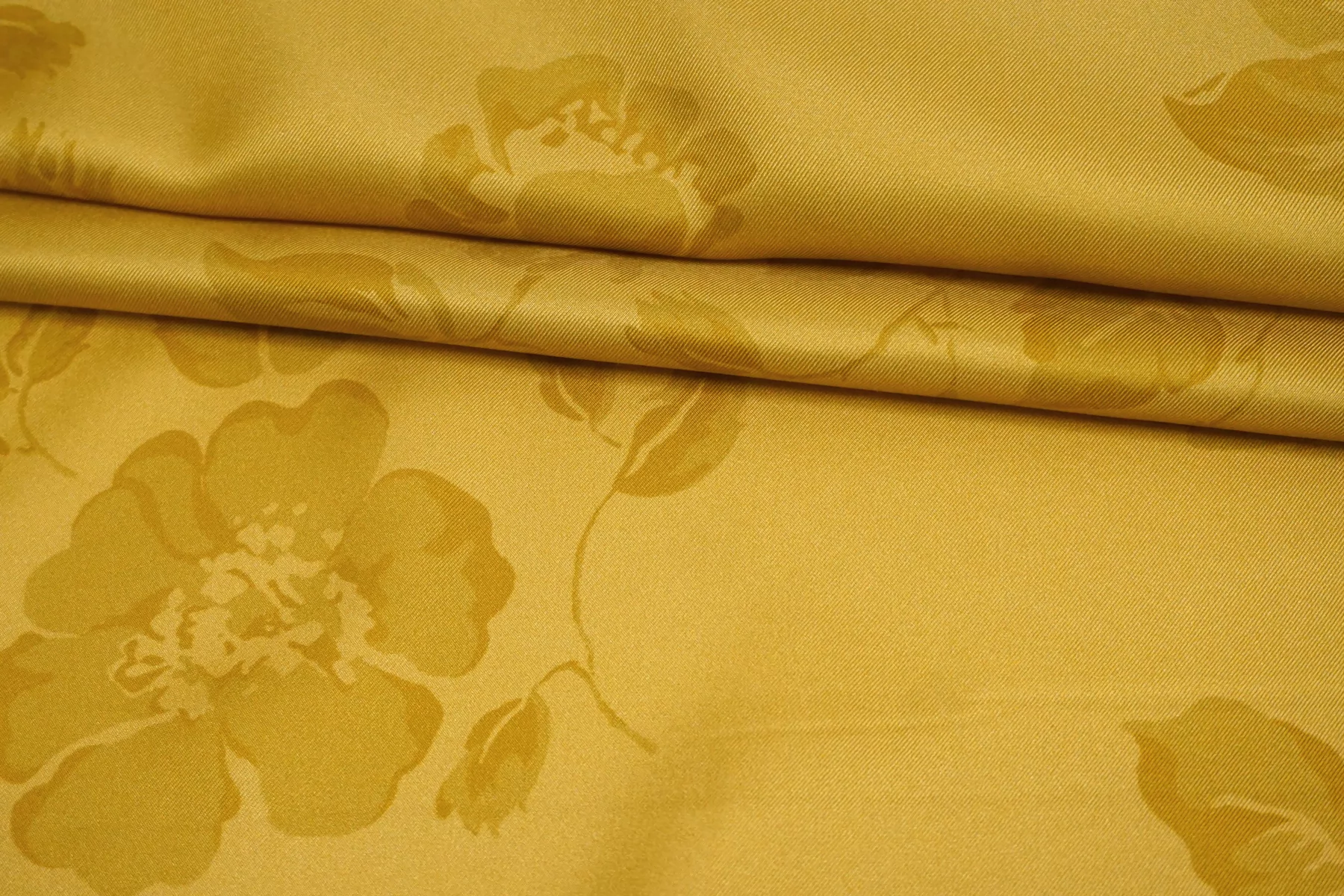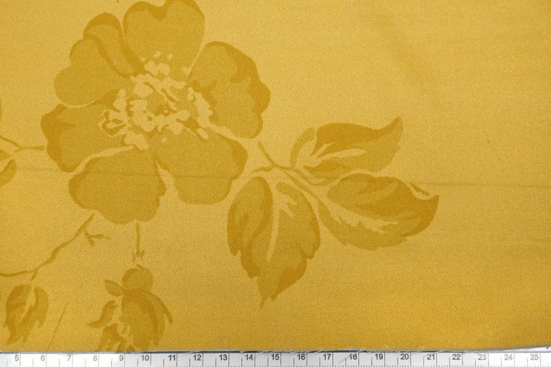 Роскошный шёлк диагонального плетения в нарядном, золотисто-горчичном цвете с крупным цветочным принтом. Очень приятный и мягкий, гладкий. Достаточно плотный, пластичный, струящийся. Обладает красивым шелковым лоском. Не тянется. Минимально просвечивает силуэт в один слой. Мнется слабо. Форму не держит, но красиво смотрится в драпировке. Прекрасный легкий вариант на блузки, платья и юбки, костюма в пижамном стиле из рубашки и брюк, кимоно. Уход за шёлком деликатный.
