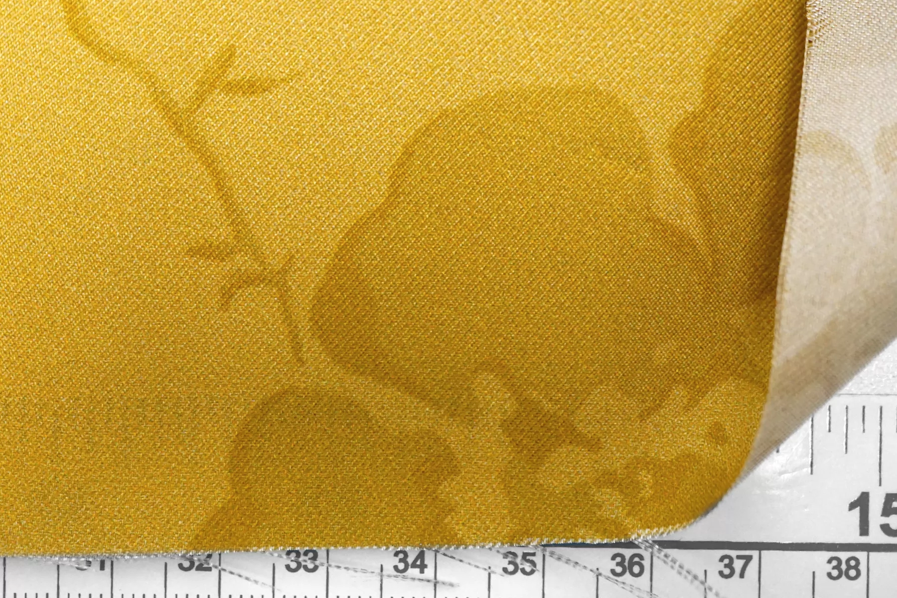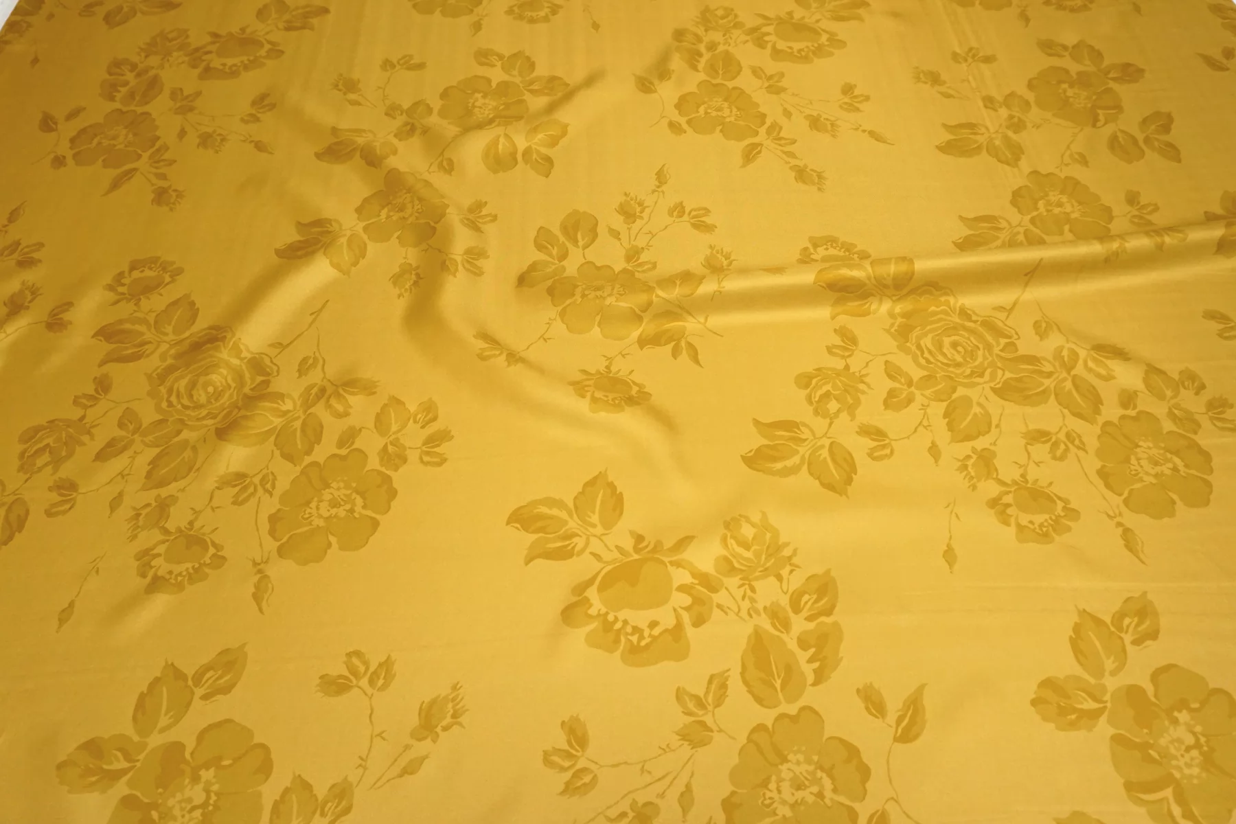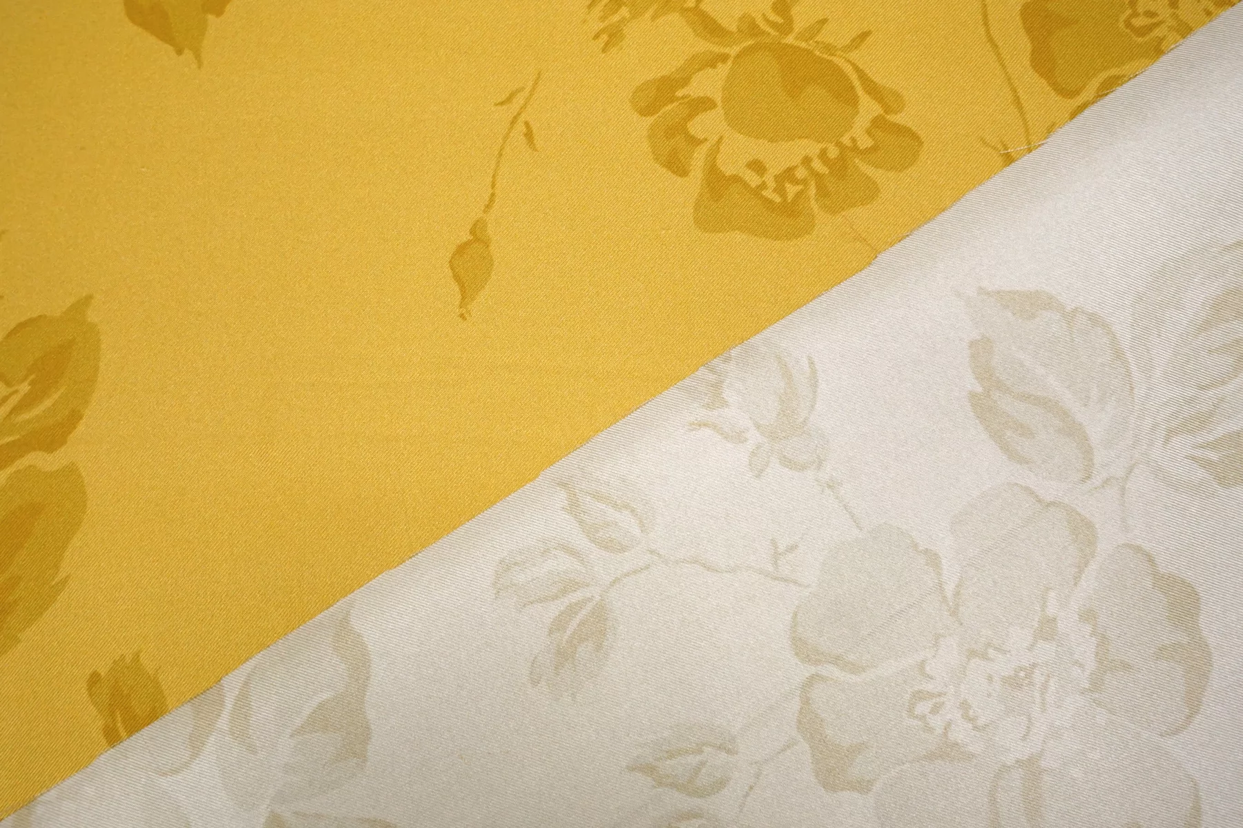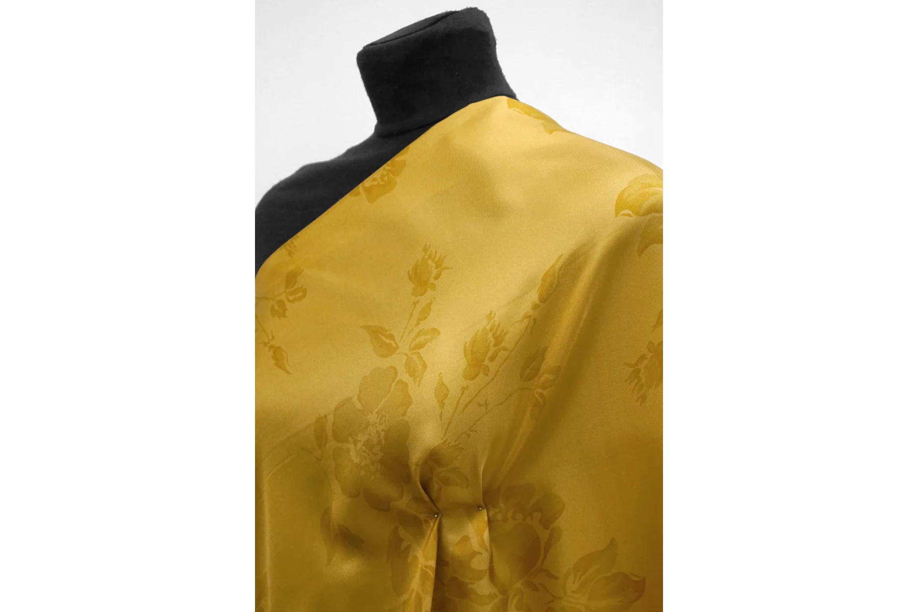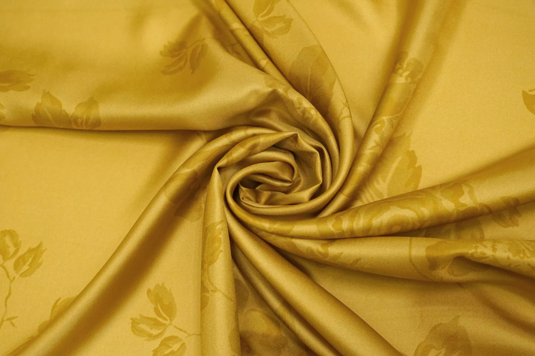 Роскошный шёлк диагонального плетения в нарядном, золотисто-горчичном цвете с крупным цветочным принтом. Очень приятный и мягкий, гладкий. Достаточно плотный, пластичный, струящийся. Обладает красивым шелковым лоском. Не тянется. Минимально просвечивает силуэт в один слой. Мнется слабо. Форму не держит, но красиво смотрится в драпировке. Прекрасный легкий вариант на блузки, платья и юбки, костюма в пижамном стиле из рубашки и брюк, кимоно. Уход за шёлком деликатный.