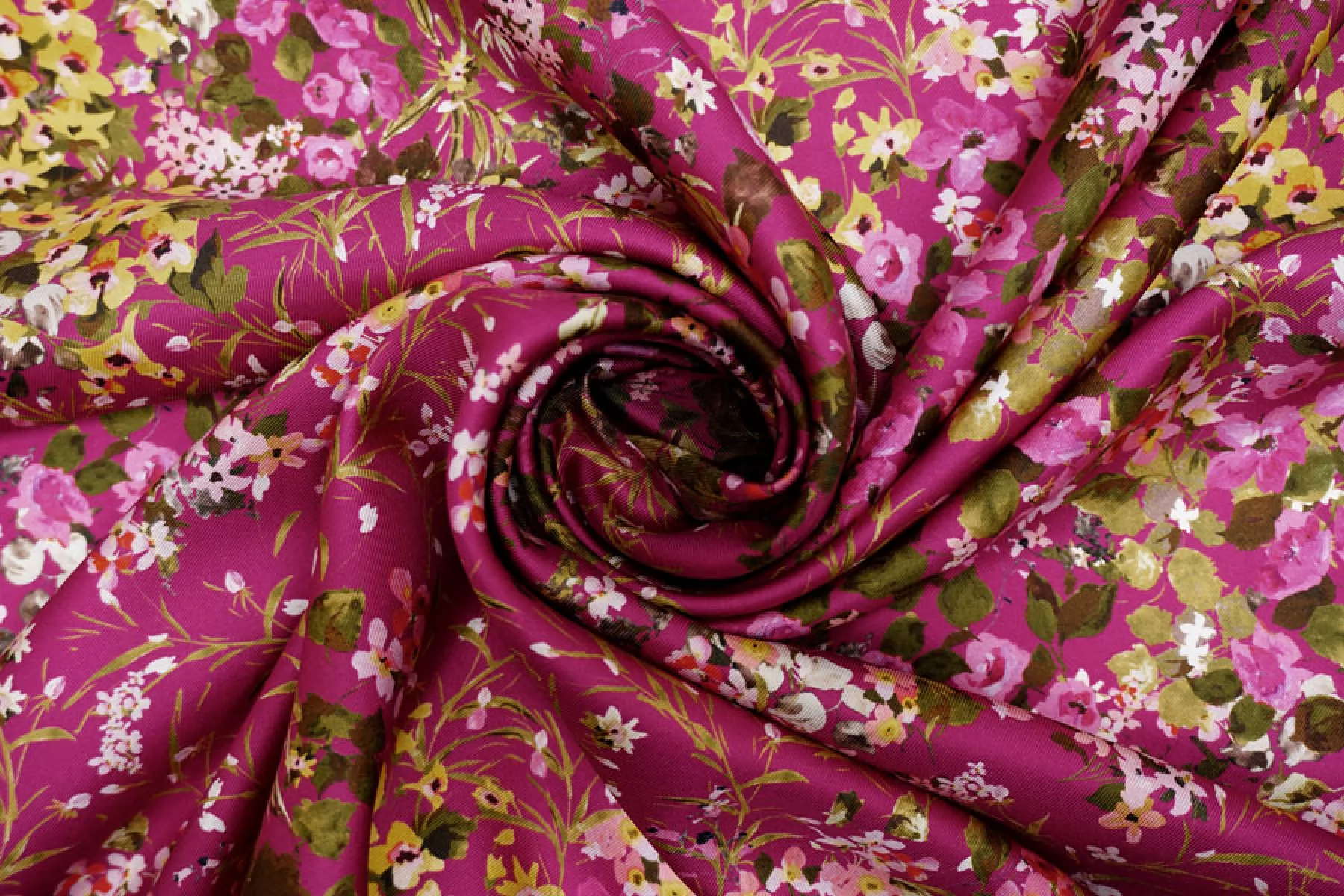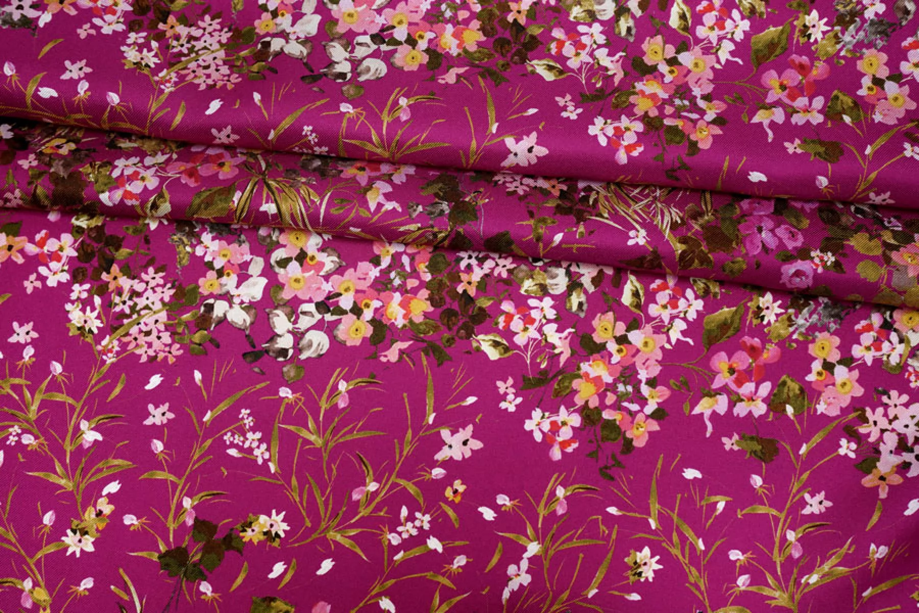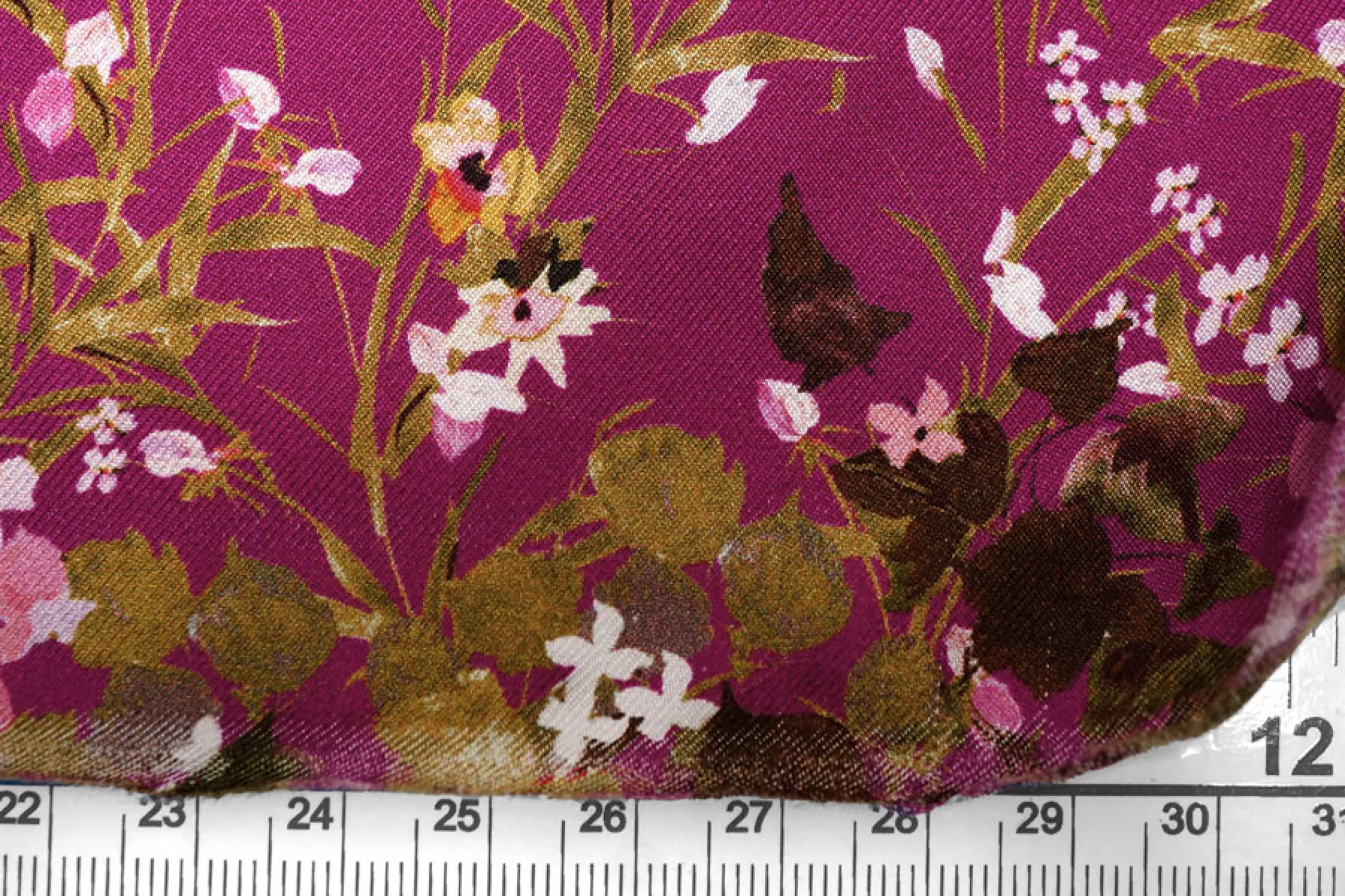 Твиловый шёлк от Max Mara с красивым цветочным принтом на ярком фоне цвета фуксии. Очень приятный и мягкий, гладкий. Достаточно плотный, пластичный, струящийся, легкий. Обладает красивым шелковым лоском. Не тянется. Не просвечивает. Мнется слабо. Форму не держит, но красиво смотрится в драпировке. Прекрасный легкий вариант на блузки, платья и юбки. Уход за шёлком деликатный.